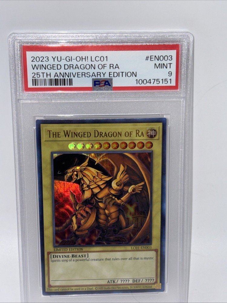 This Yu-Gi-Oh! TCG card is a highly sought-after ultra rare card, with a PSA 9 rating. The card is from the Yugi set and features the iconic The winged dragon of Ra. Manufactured by Konami, this card is a must-have for collectors and players alike. With its stunning rarity and impressive PSA 9 rating, this card is a valuable addition to any collection. Whether you're a fan of the Yu-Gi-Oh! TCG or simply a collector looking to add to your set, this card is sure to impress. Don't miss your chance to own this incredible card.