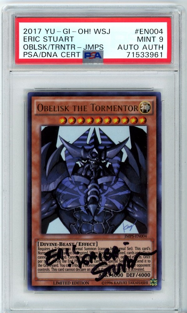 The product is a limited edition Yu-Gi-Oh! trading card featuring Obelisk the Tormentor from the Shonen Jump Magazine Promos set. This card is autographed by Eric Stuart, the creator of the character, and authenticated by Professional Sports Authenticator (PSA). It has a light attribute, 4000 defense/toughness and attack/power, making it a powerful and collectible addition to any Yu-Gi-Oh! card collection. The vintage card is in English and comes with a hard-signed signature, adding to its value and appeal to collectors.
