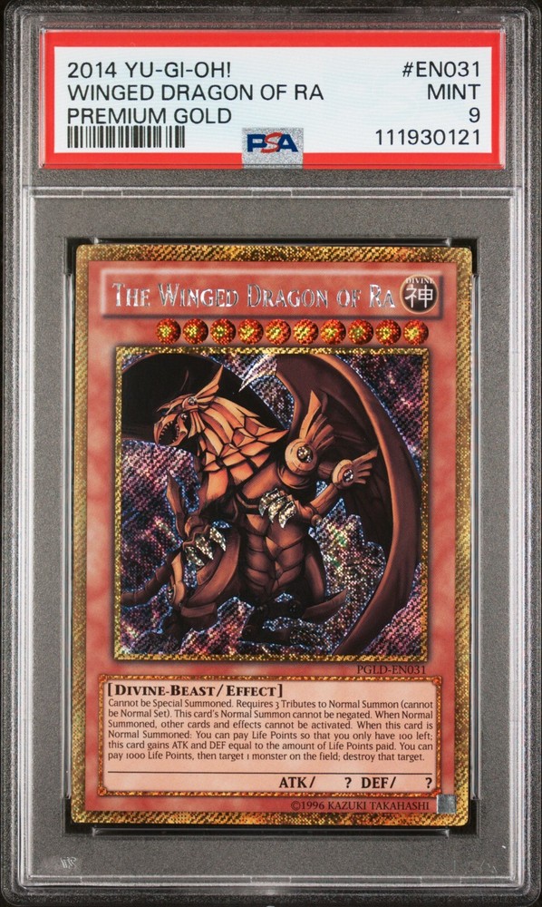 Up for sale is this PSA MINT 9 2014 YU-GI-OH! PREMIUM GOLD #EN031 WINGED DRAGON OF RA PREMIUM GOLD I am a trusted seller and all of my items are sent fully insured. Please take the time to look at my other listings. I sell a range of collectables & rare items of the highest quality. I tend to list in batches of items so make sure to add me as a favourite seller so as not to miss out! I always do my best to answer any questions you may have so please don't hesitate to ask! Postage Information: Domestic: I will post via the method specified at the top of the listing within or on the next working day of the purchase(s) being made, free of charge. International: I will post the same way as above to eBay's United Kingdom Global Shipping Centre. They will then handle to package on its way to you. I do not charge for shipping on any of my listings. eBay will however, levy an appropriate shipping charge onto the buyer for handling the package(s) and providing an extra layer of security to the buyer. I receive none of this money and cannot see what your shipping charge is. In the event eBay's GSP cannot cover a high value item, I will ship via a direct secure method. Returns Information: As an eBay Seller with Top-Rated & Premium Service Status. I will accept returns on this listing for 30 days. Returned item(s) must be in an acceptable state (Unopened Sealed Products, Undamaged, The Exact Item Sent, Nothing Missing etc).