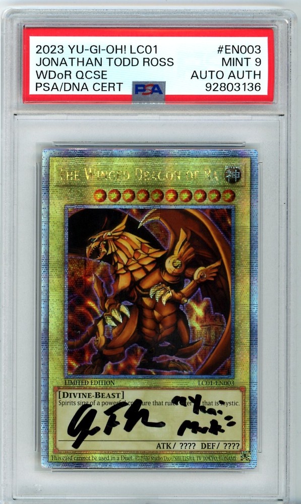 The product is a PSA Mint 9 signed Jonathon Todd Ross Yu-Gi-Oh! card from the Legendary Collection: 25th Anniversary Edition. This Quarter Century Secret Rare card features The Winged Dragon of Ra and is autographed by Jonathan Todd Ross with a hard-signed format. Authenticated by Professional Sports Authenticator (PSA), this Limited Edition foil card is a coveted collectible for fans of the Yu-Gi-Oh! TCG.