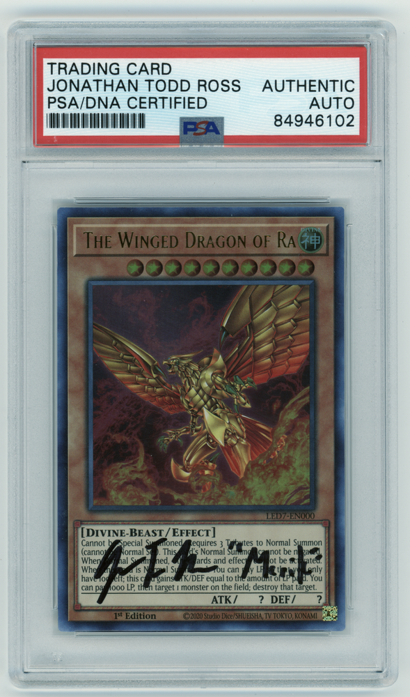 This Yu-Gi-Oh! TCG card is a must-have for any collector or player. The Winged Dragon of Ra, with its ultra rare rarity and holo finish, is an effect type card that can bring about a divine color attribute. The card is standard sized and made of high-quality card stock material, ensuring its durability and longevity. The card is autographed by Jonathon Todd Ross, adding a unique touch to your collection. It was manufactured by Konami in 2020 and is part of the Legendary Duelists: Rage of Ra set. The card number is LED7-EN000, and it is written in English language. Don't miss out on the opportunity to add this stunning card to your collection.