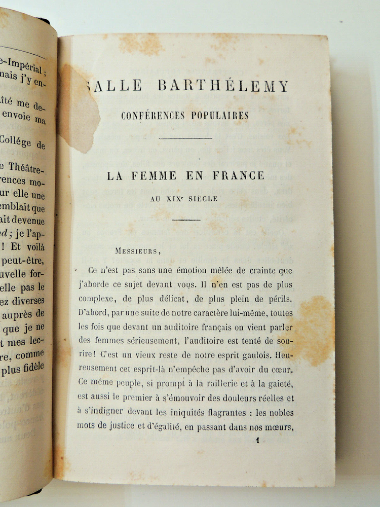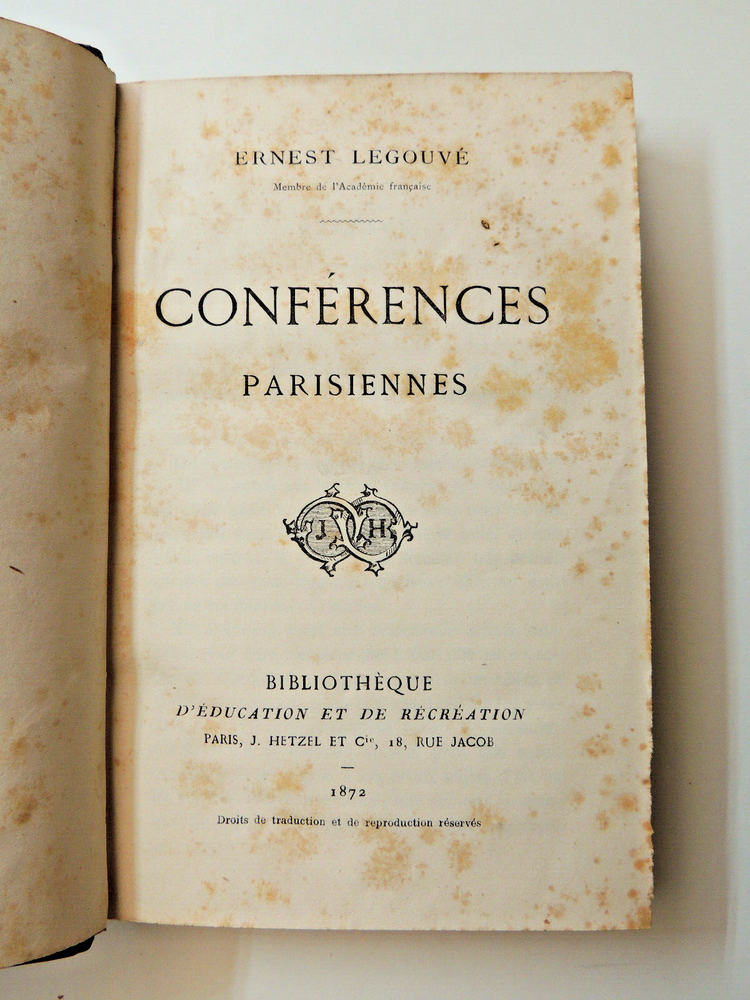 Parisian Life. Ernest Legouvé. Parisian Lectures 1872. First Edition The description of this item has been automatically translated. If you have any questions, please feel free to contact us. Ernest Legouvé. Parisian Conferences Ernest Legouvé, born February 15, 1807 in Paris and died in the same city on Mars 14, 1903, is a French writer, playwright, poet, moralist, defender of women's rights and critic. Compilation of short texts, testimonies of Parisian life, reactions to current events, pamphlet and praise, Académie Française, on Saint Mark's Square in Venice, on the prizes of virtue, about a photographic album, Rotrou, words of farewell, portraits of friends, etc. volume bound in half leather with corners, 190x120, good condition. 404pp Paris, Hetzel, 1872. Original Edition. ref/164 Ernest Legouvé. Parisian Conferences Ernest Legouvé, born February 15, 1807 in Paris and died in the same city on Mars 14, 1903, is a French writer, playwright, poet, moralist, defender of women's rights and critic. Compilation of short texts, testimonies of Parisian life, reactions to current events, pamphlet and praise, Académie Française, on Saint Mark's Square in Venice, on the prizes of virtue, about a photographic album, Rotrou, words of farewell, portraits of friends, etc. volume bound in half leather with corners, 190x120, good condition. 404pp Paris, Hetzel, 1872. Original Edition. ref/164 Caractéristiques spéciales Édition originale Reliure Cuir Époque XIXème Sujet Histoire