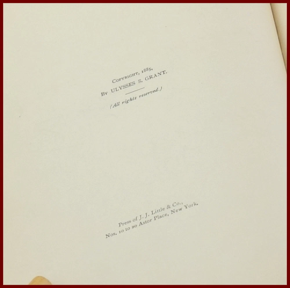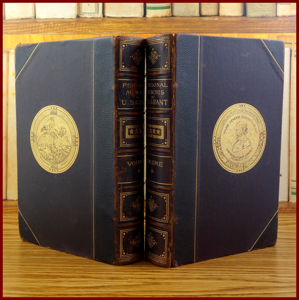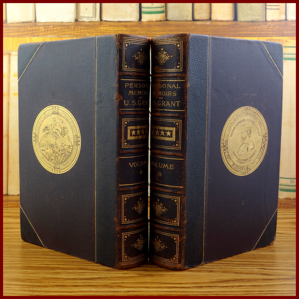 Here on offer is a very nice copy of Ulysses S. Grant's best-selling autobiography Personal Memoirs of U. S. Grant , chronicling more than forty years of his life: from his boyhood to his graduation from West Point in 1843, his prominent military career from the Mexican-American War through the Civil War, and finally his accomplished two-term presidency of the United States. This is a 1st American trade edition, 1st printing of the work published by Charles Webster & Co. in 1885-1886, half-bound in leather with gold government seals inlaid to the boards. There is no dust jacket with this copy. ******************************************************************************************************************* "Completed just days before his death and hailed by Mark Twain as 'the most remarkable work of its kind since the Commentaries of Julius Caesar,' this is the now-legendary autobiography of ULYSSES SIMPSON GRANT (1822-1885), 18th president of the United States and the Union general who led the North to victory in the Civil War. Though Grant opens with tales of his boyhood, his education at West Point, and his early military career in the Mexican-American war of the 1840s, it is Grant's intimate observations on the conduct of the Civil War, which make up the bulk of the work, that have made this required reading for history students, military strategists, and Civil War buffs alike. . . ." //////////////////////////////////////////////////////////////////////////////////////////////////////////////////////////////////////////////////////// Ulysses S. Grant (April 27, 1822 – July 23, 1885) was the 18th president of the United States, serving from 1869 to 1877. In 1865, as commanding general, Grant led the Union Army to victory in the American Civil War. Grant was born in Ohio and graduated from the United States Military Academy (West Point) in 1843. He served with distinction in the Mexican–American War, but resigned from the army in 1854 and returned to civilian life impoverished. In 1861, shortly after the Civil War began, Grant joined the Union Army and rose to prominence after securing victories in the western theater. . . . In 1866, President Andrew Johnson promoted Grant to General of the Army. Later, Grant broke with Johnson over Reconstruction policies. A war hero, drawn in by his sense of duty, Grant was unanimously nominated by the Republican Party and then elected president in 1868. As president, Grant stabilized the post-war national economy, supported congressional Reconstruction and the Fifteenth Amendment, and prosecuted the Ku Klux Klan. Under Grant, the Union was completely restored. An effective civil rights executive, Grant signed a bill to create the United States Department of Justice and worked with Radical Republicans to protect African Americans during Reconstruction. In 1871, he created the first Civil Service Commission, advancing the civil service more than any prior president. Grant was re-elected in the 1872 presidential election, but was inundated by executive scandals during his second term. . . . Leaving office in 1877, Grant undertook a world tour, becoming the first president to circumnavigate the world. In 1880, he was unsuccessful in obtaining the Republican nomination for a third term. In 1885, impoverished and dying of throat cancer, Grant wrote his memoirs, covering his life through the Civil War, which were posthumously published and became a major critical and financial success. At his death, Grant was the most popular American and was memorialized as a symbol of national unity. . . . The above text was taken from, respectively, Cosimo Classic (via Google Books) and Wikipedia. [Grant, Ulysses S. Personal Memoirs of U. S. Grant. United States: Cosimo Classics, 2006.]