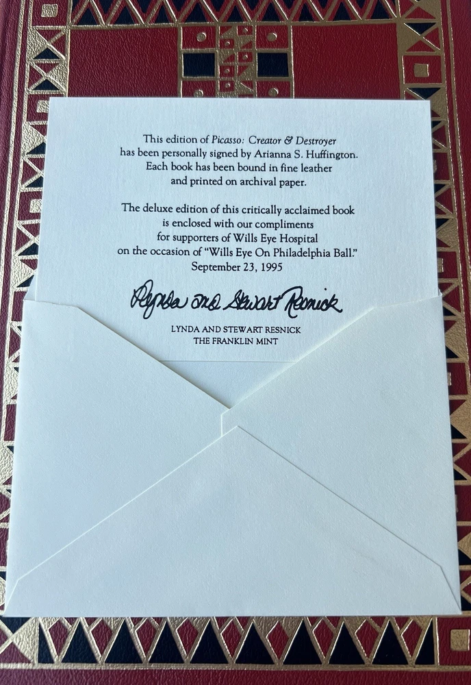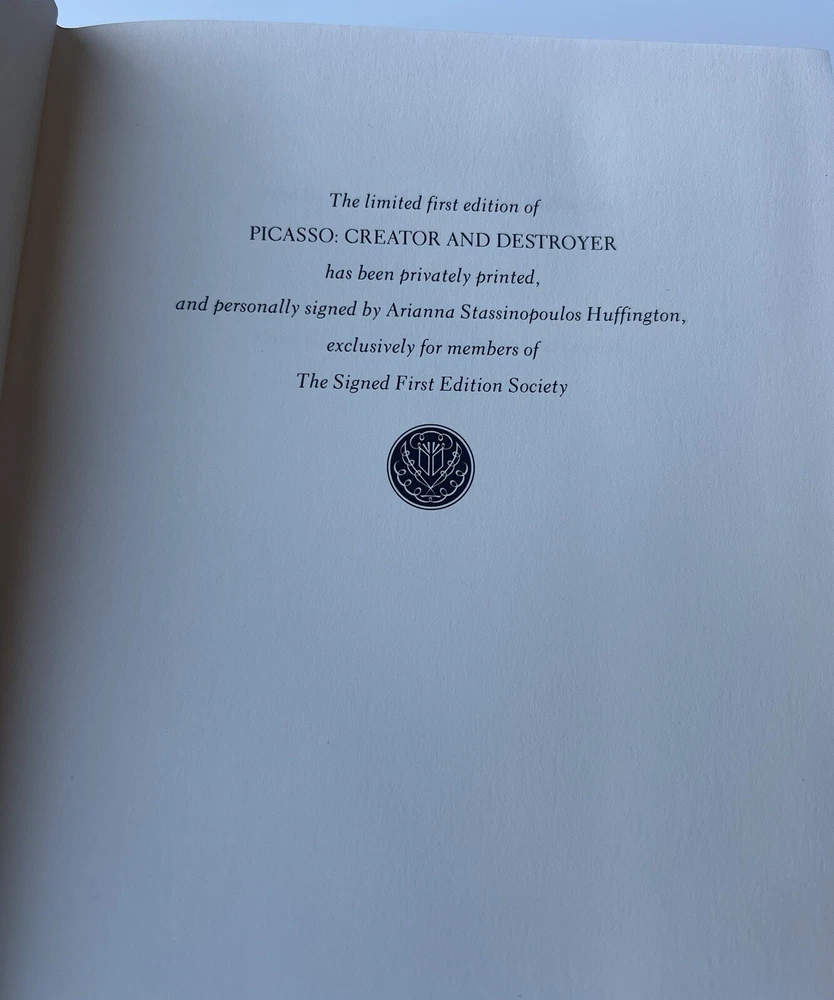 This unique and rare book, "Picasso Creator and Destroyer" written by Arianna Huffington and published by Franklin Library in 1988, is a masterpiece of the English language. The book is a first edition and has some special attributes such as being illustrated and signed by the author. The author is well-known for writing biographies and autobiographies, and this book is no exception. The leather binding of the book gives it an antique look and it is perfect for collectors who love to add unique items to their collection. The book is about the famous painter, Pablo Picasso, and his life journey. The book covers many topics including his struggles, successes, and everything that made him who he was. The book is a great addition to any biography or autobiography collection and is perfect for those who are interested in the art world. If you're a collector of unique and rare items, this book is a must-have for your collection.