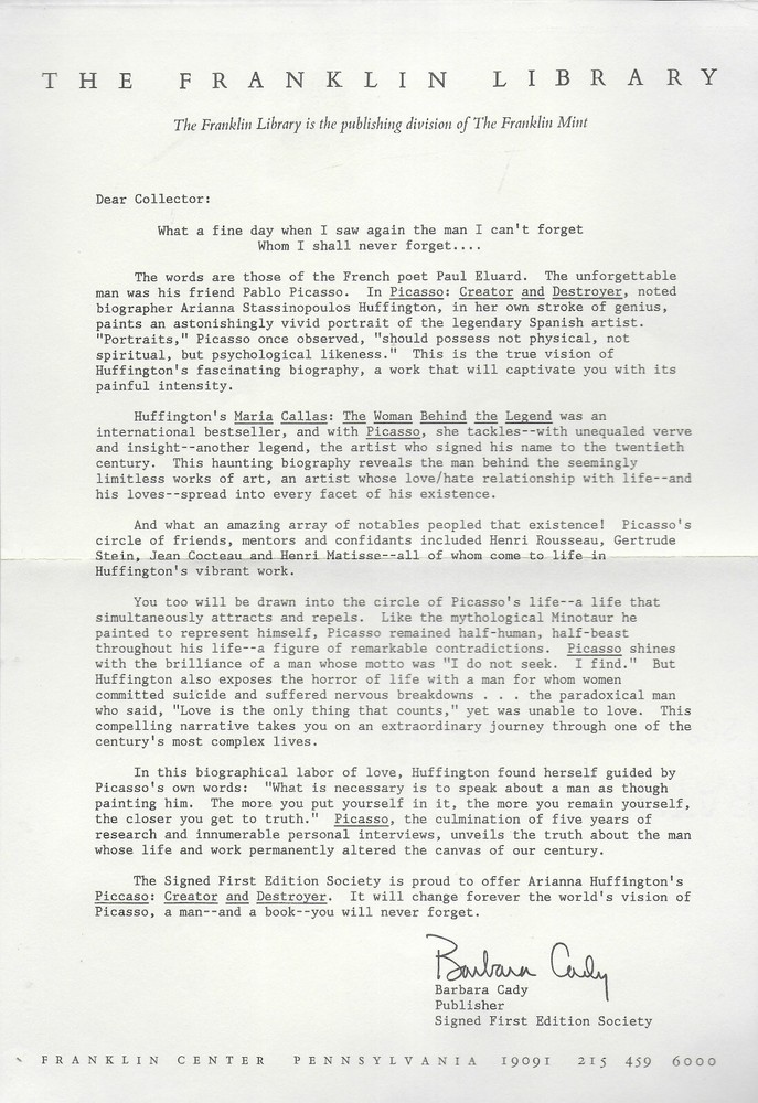 Picasso Creator & Destroyer, Arianna Stassinopoulos H u ffington , Franklin Library, Signed Limited 1st Edition , Frontispiece by Susi Kilgore The Franklin Library, Franklin Center, PA published the book special contents copyright 198 8 . It is a limited first edition. Arianna Stassinopoulos H u ffington signed the front flyleaf. The book is part of Franklin Library’s series Signed First Editions . The interior, beautiful leather cover, and the attached silk bookmark are in fine condition. The pages are tight and clean. There are no tears, marks, or bookplates. The page edges are richly gilded to seal out moisture. The book is 6 1/2 ” x 9 1/2 ” tall and 419 pages. There are 52 b & w historic photographs. Laid in the front is a Franklin Library letter to the Signed First Editions subscribers about the book. Combine Shipping Discount!!!!! Save money when you buy more than one item (lot) from us! Except in rare cases, s & h to a U. S. address via media mail in the same box is $1.35 for each additional book. eBay may automatically send a combine invoice with the wrong s & h. Please wait to pay until you receive my combine invoice with the correct s & h. PLEASE CHECK OUT MY eBAY STORE AND OTHER AUCTIONS!!! 11 3 202 5 12 025