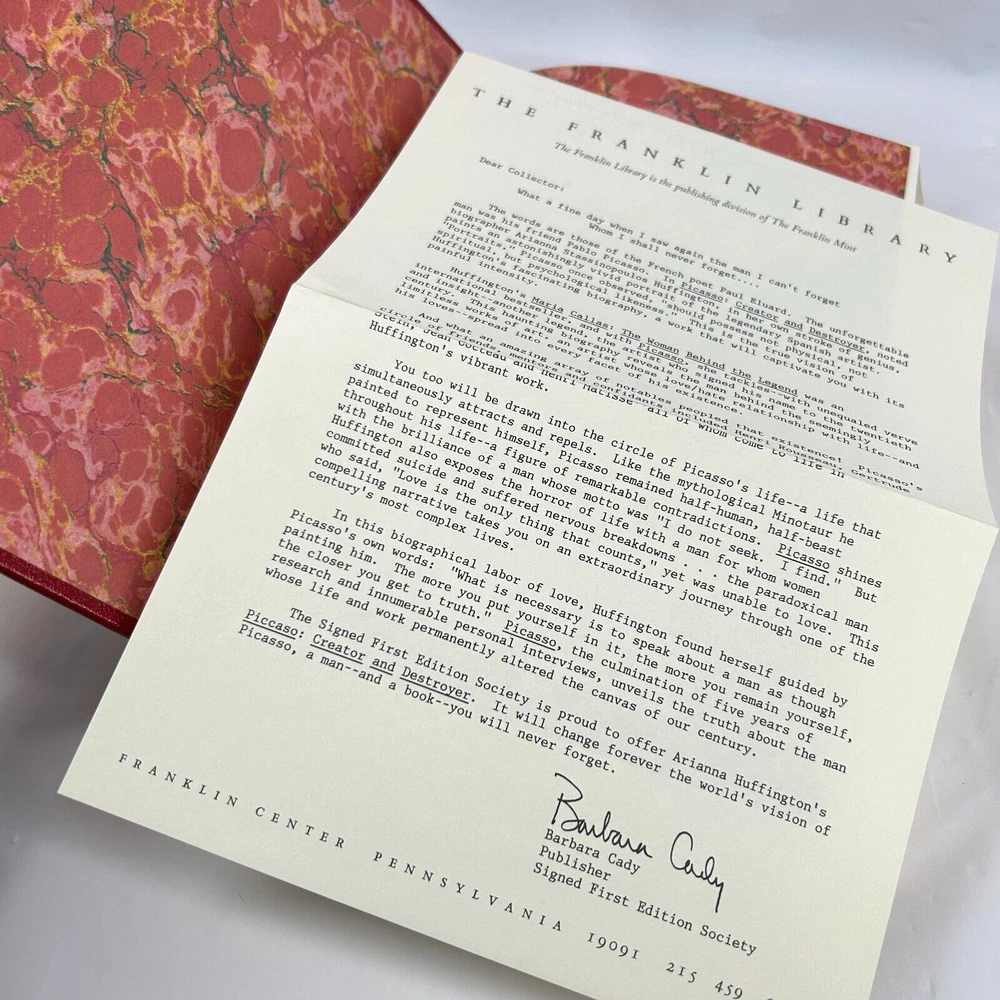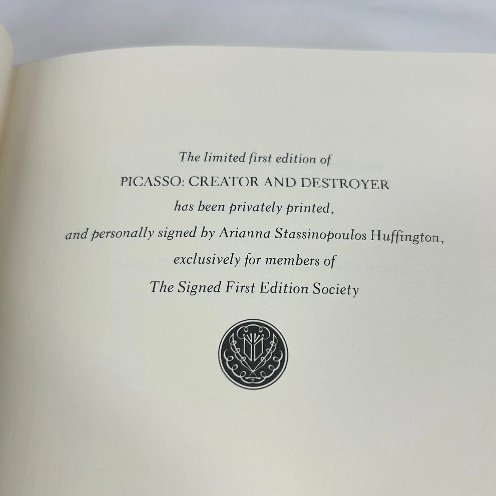 This book is a collector's dream, a signed first edition of Arianna Huffington's "Picasso Creator and Destroyer." With beautiful illustrations and a focus on the artist's biography, this is a must-have for any fan of Picasso or the art world in general. Published by Franklin Library in 1988 and bound in luxurious leather, this book is a true treasure. Picasso Creator and Destroyer Huffington Franklin Library Signed First Edition Very good condition with no issues to note. In beautiful and unread condition. Clean cover. The pages are crisp and clean - no highlighting, writing, or corner folds. Please use photos for condition grading.