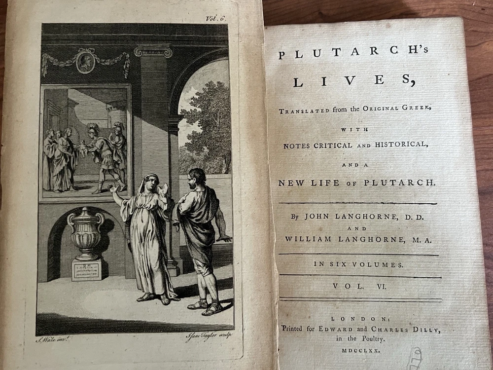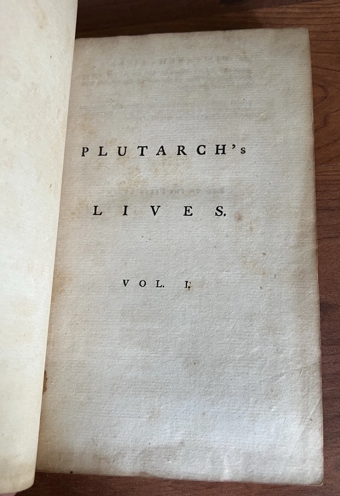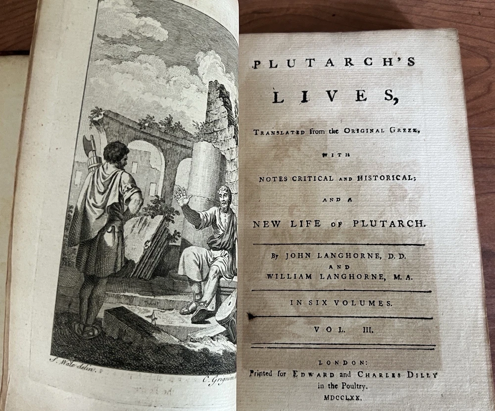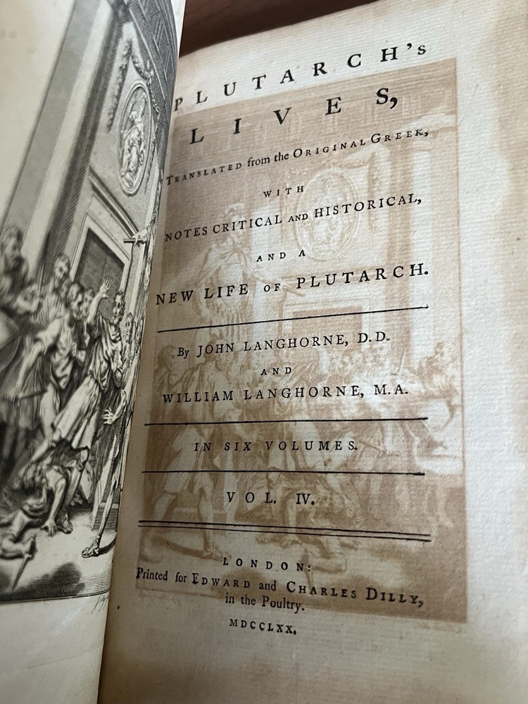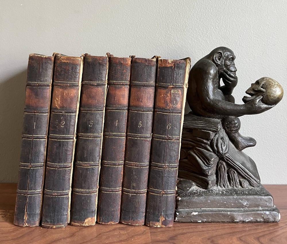 *Darwin bookend obviously not included. Plutarch's Lives, Translated from the Original Greek, with Notes Critical and Historical , and a New Life of Plutarch By John Langhorne and William Langhorne complete In Six Volumes. Provenance: This set was originally part of the collection of Alexander Hendras Sutherland. Alexander Hendras Sutherland (1753–1820) was a wealthy merchant who devoted his considerable fortune to forming a remarkable collection of prints and drawings illustrative of the history of England in the seventeenth century, which he used to grangerize a number of titles, notably Clarendon's 'History of the Rebellion'. His widow presented the collection to the University of Oxford in 1837. This First Edition of the Langhorne translation of Plutarch's Lives with frontispiece to each volume. Published and Printed for Edward and Charles Dilly in the Poultry, London. 8vo. Original leather boards. Full calf. Cracking to spine/spine wear. Wear to boards. All front covers and first blank matter page are detached with the exception of volume IV, which is attached. See photos for condition. Light foxing here and there but most pages in good condition with no damage. Good binding otherwise. Volume VI includes index and errata. A fine addition to any antiquarian library.