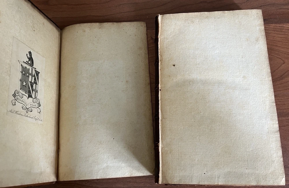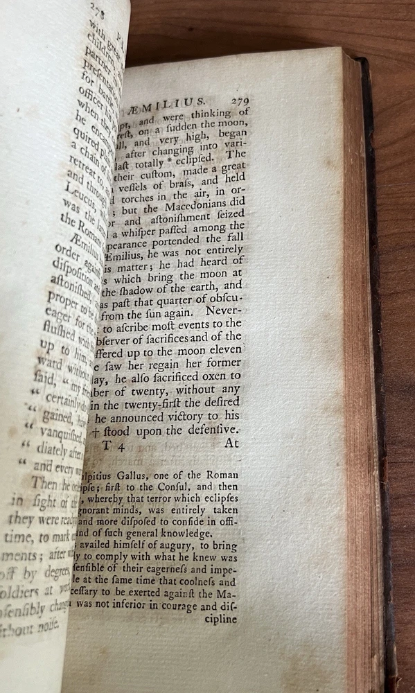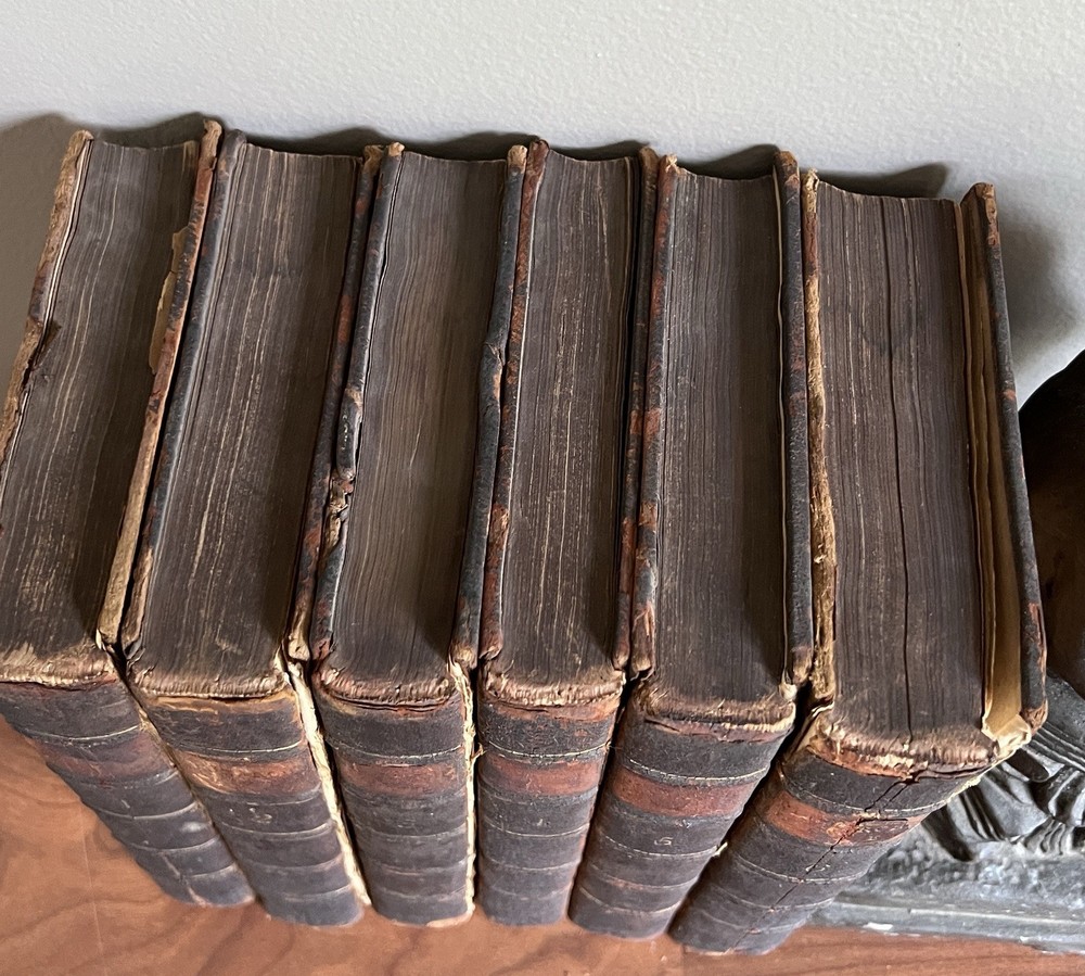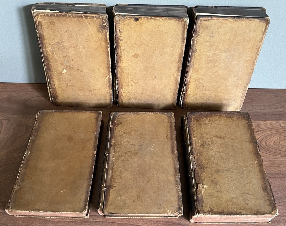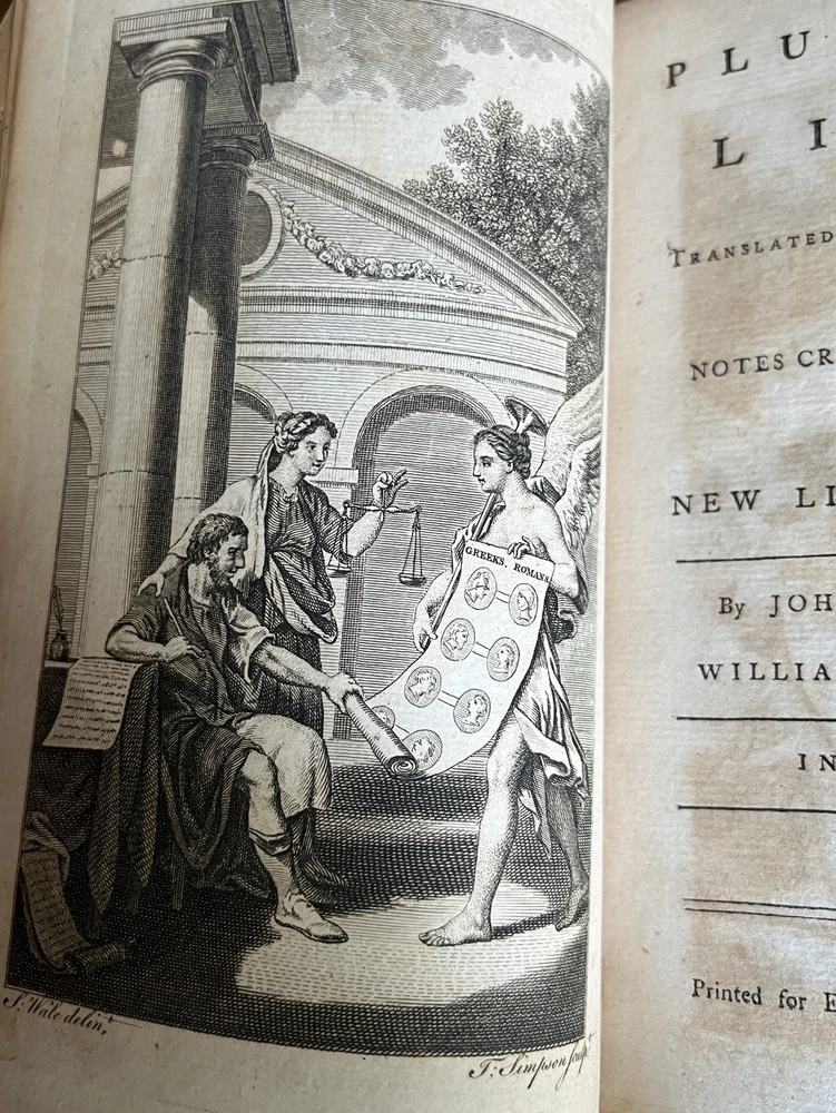 *Darwin bookend obviously not included. Plutarch's Lives, Translated from the Original Greek, with Notes Critical and Historical , and a New Life of Plutarch By John Langhorne and William Langhorne complete In Six Volumes. Provenance: This set was originally part of the collection of Alexander Hendras Sutherland. Alexander Hendras Sutherland (1753–1820) was a wealthy merchant who devoted his considerable fortune to forming a remarkable collection of prints and drawings illustrative of the history of England in the seventeenth century, which he used to grangerize a number of titles, notably Clarendon's 'History of the Rebellion'. His widow presented the collection to the University of Oxford in 1837. This First Edition of the Langhorne translation of Plutarch's Lives with frontispiece to each volume. Published and Printed for Edward and Charles Dilly in the Poultry, London. 8vo. Original leather boards. Full calf. Cracking to spine/spine wear. Wear to boards. All front covers and first blank matter page are detached with the exception of volume IV, which is attached. See photos for condition. Light foxing here and there but most pages in good condition with no damage. Good binding otherwise. Volume VI includes index and errata. A fine addition to any antiquarian library.