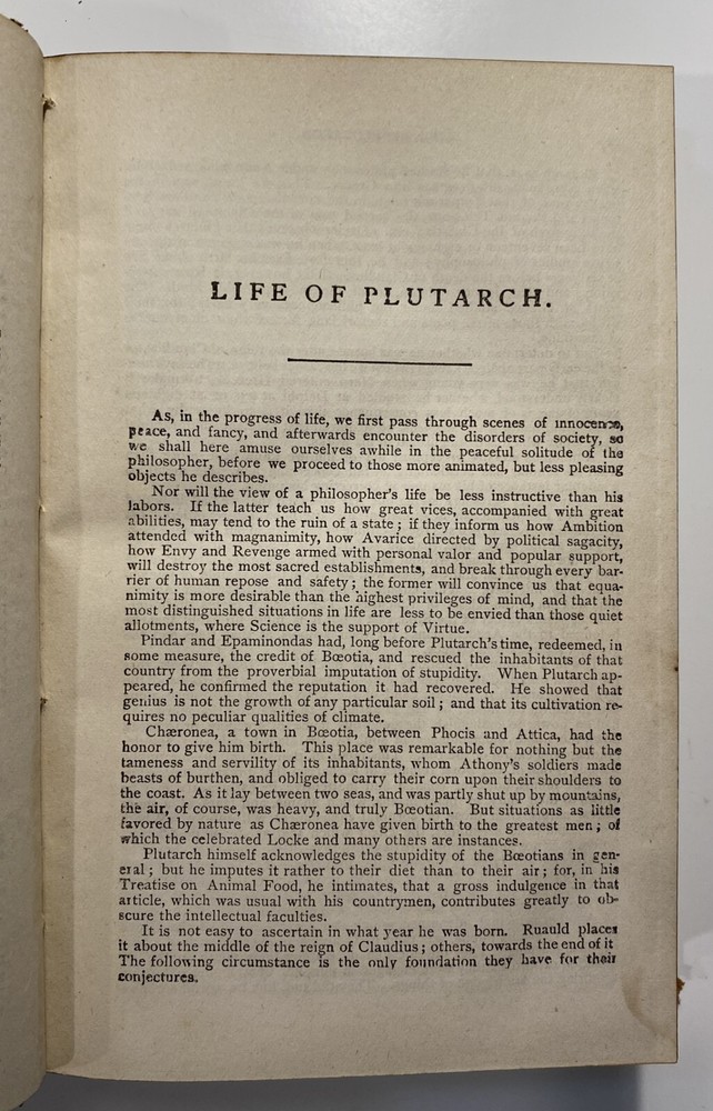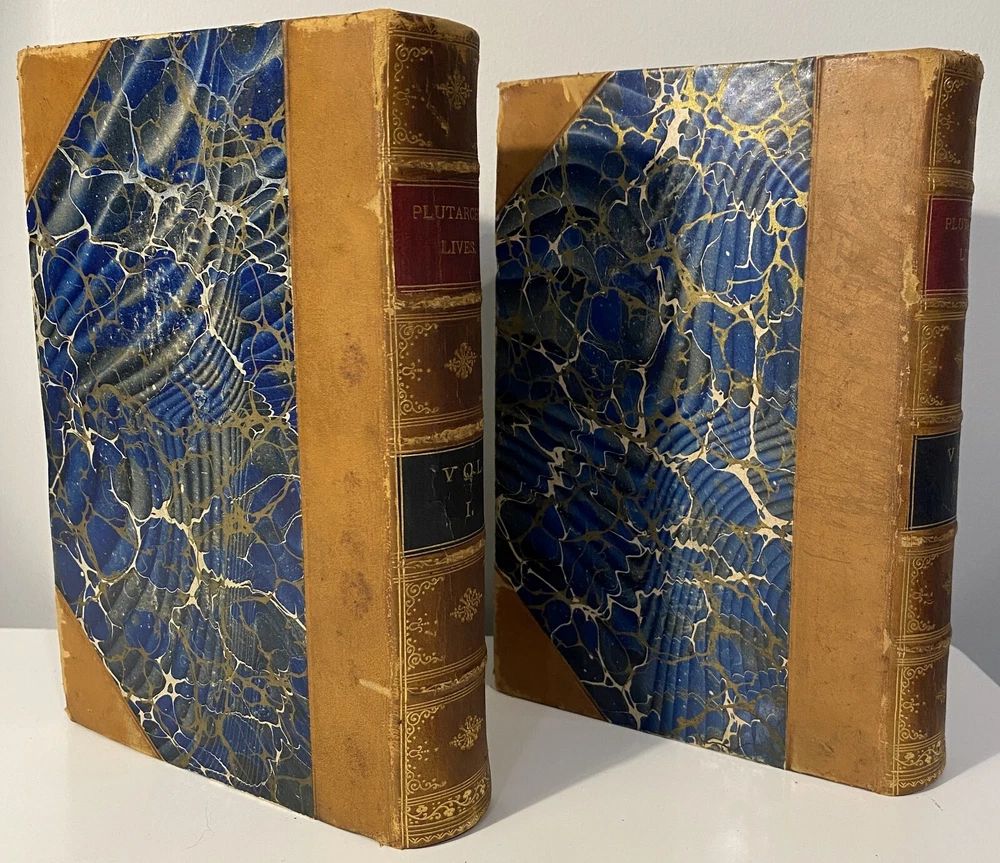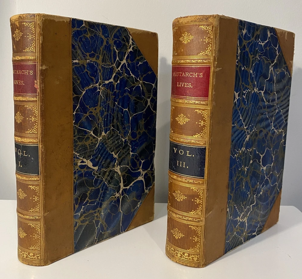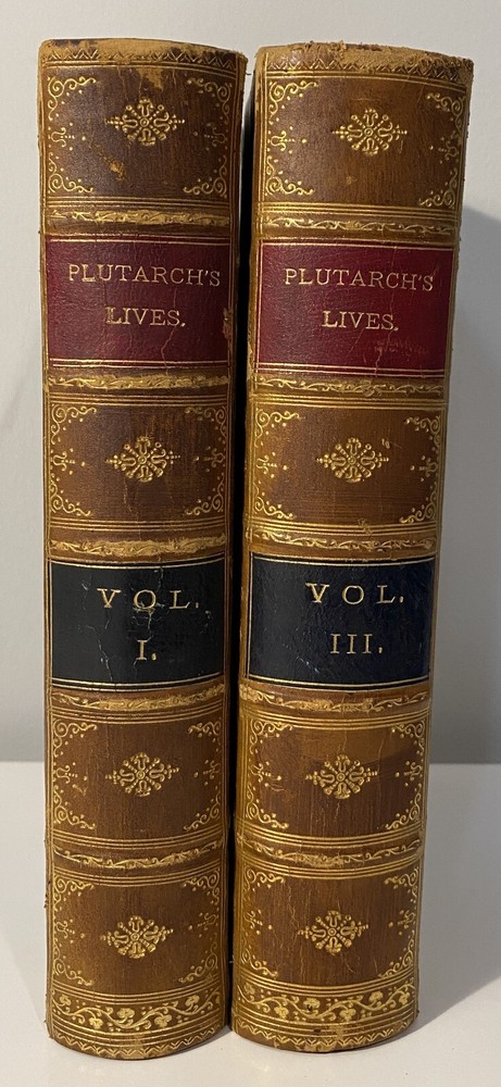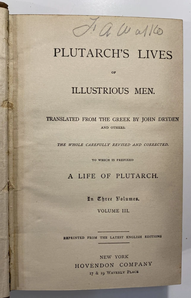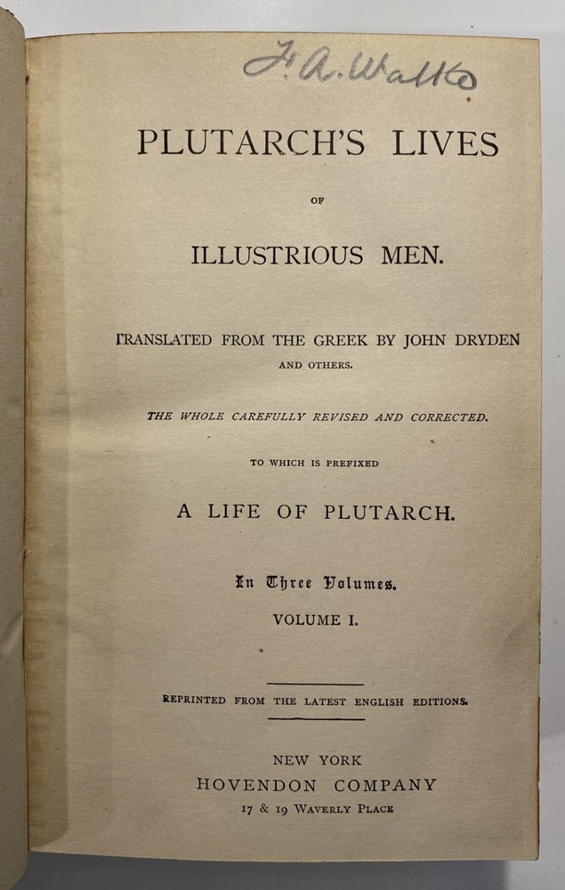 Title: Plutarch’s Lives of Illustrious Men. Translated from the Greek by John Dryden and Others. The Whole Carefully Revised and Corrected. To Which Is Prefixed a Life of Plutarch. In Three Volumes. Publisher: Hovendon Company, New York Year: [1890s] Details: Vol. 1 and 3 only. Seven copies in WorldCat. Published by the short-lived Hovendon Company, which succeeded the International Book Company and was active in the early 1890s only. In half-leather and marbled paper over boards with gilt decorations and particulars to spine in six compartments, with title to red leather and volume number to black leather. 7.5 x 5 in.