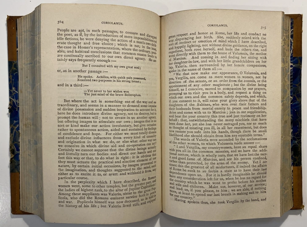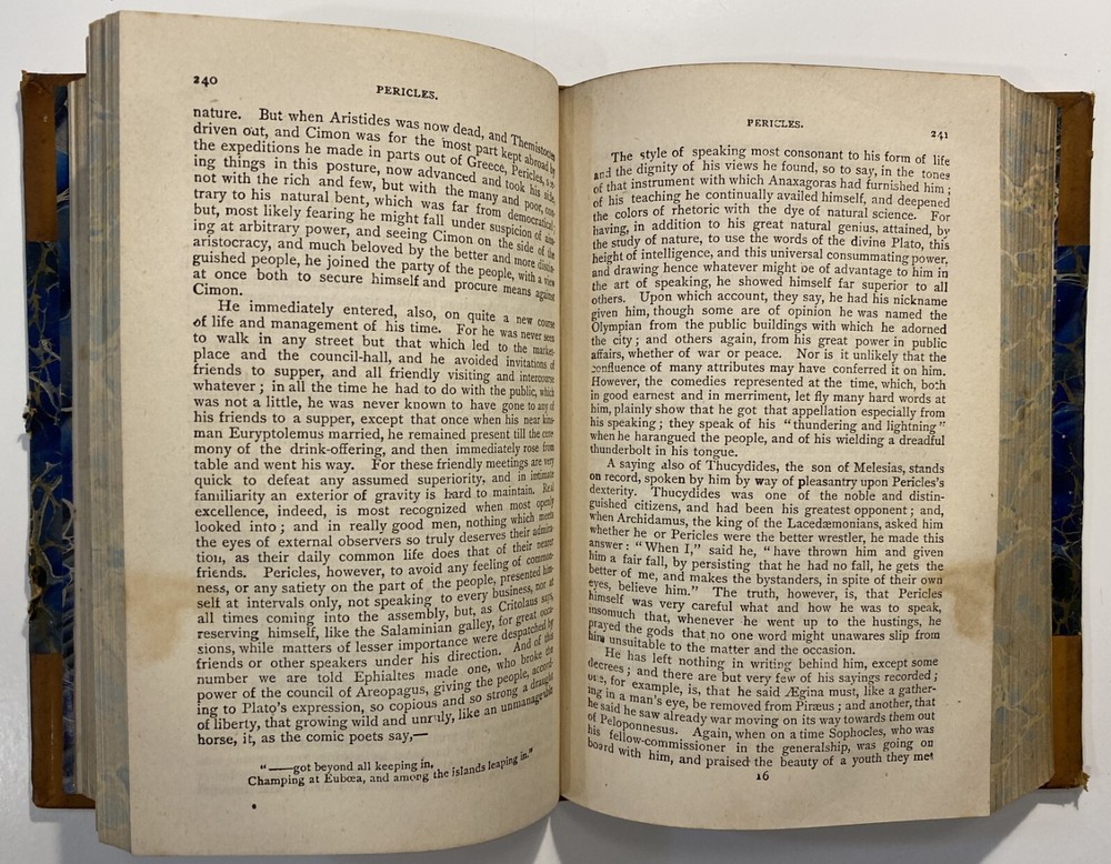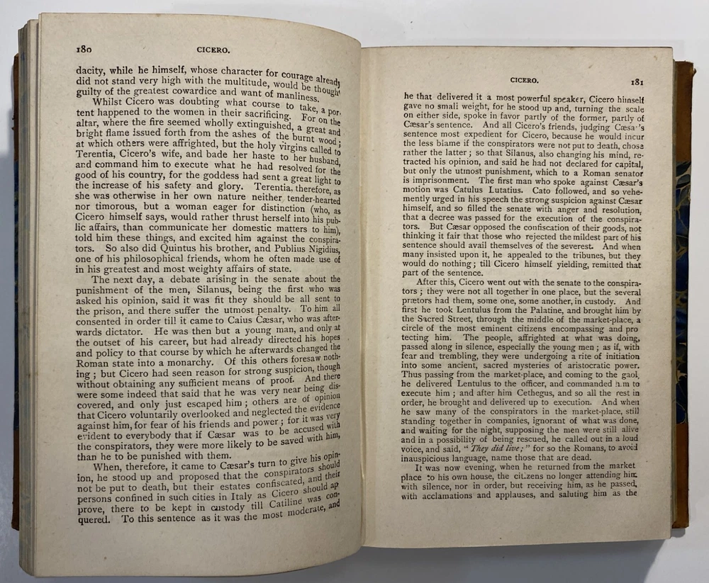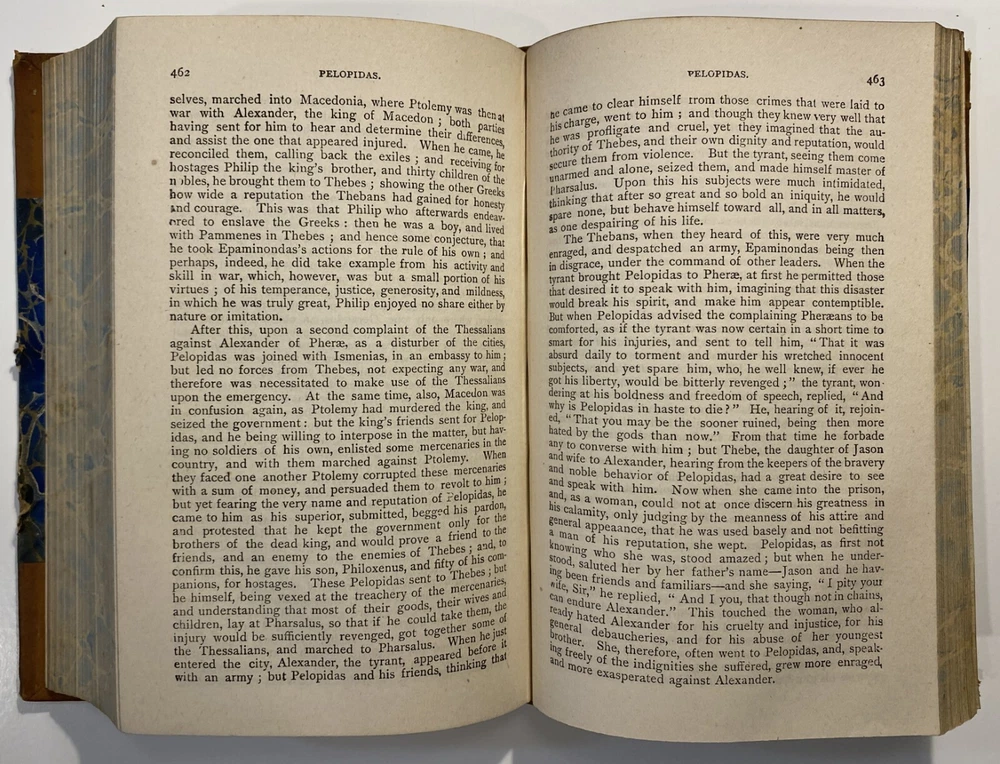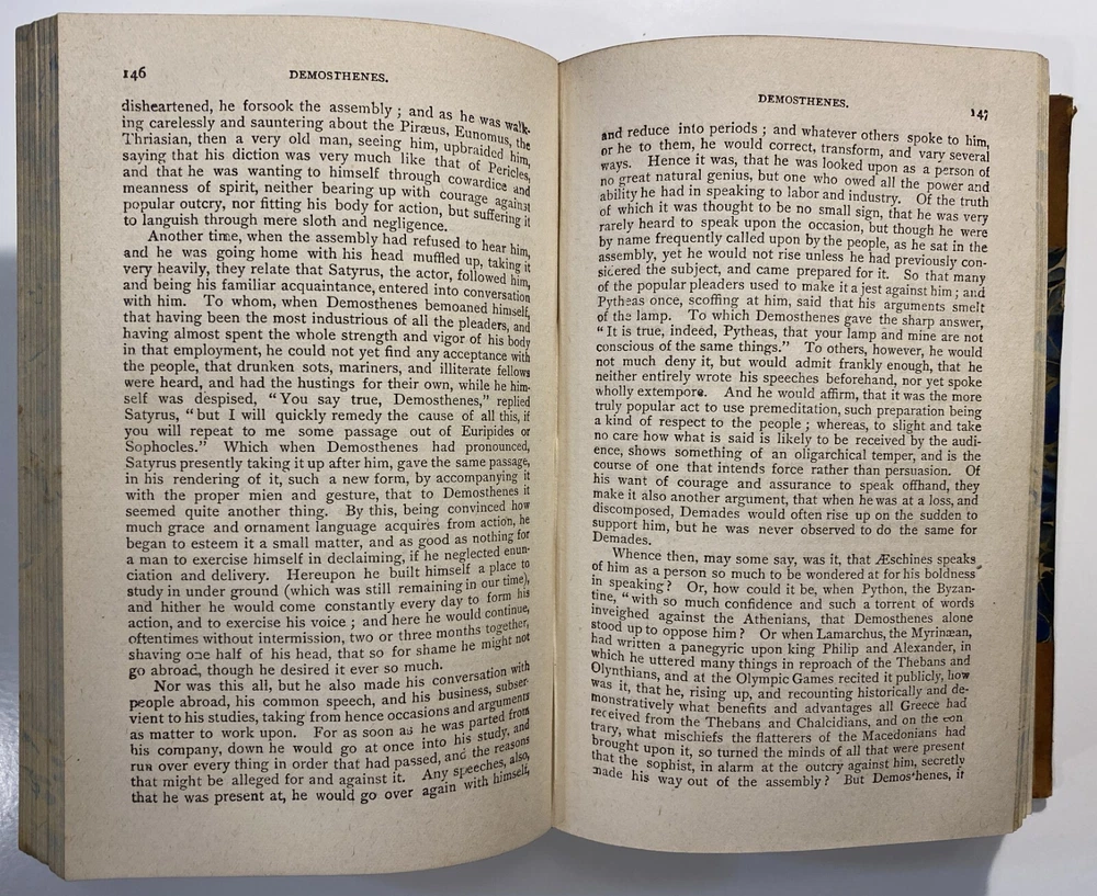 Title: Plutarch’s Lives of Illustrious Men. Translated from the Greek by John Dryden and Others. The Whole Carefully Revised and Corrected. To Which Is Prefixed a Life of Plutarch. In Three Volumes. Publisher: Hovendon Company, New York Year: [1890s] Details: Vol. 1 and 3 only. Seven copies in WorldCat. Published by the short-lived Hovendon Company, which succeeded the International Book Company and was active in the early 1890s only. In half-leather and marbled paper over boards with gilt decorations and particulars to spine in six compartments, with title to red leather and volume number to black leather. 7.5 x 5 in.
