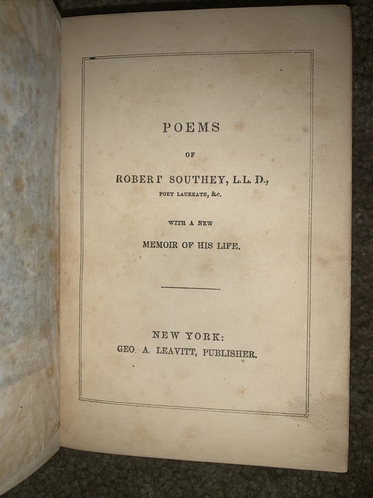 Poems of Robert Southey with a new memoir of his life. No date, loose front cover and 287 pages. 6x4x1 1/4”. Please look at all pictures and ask any questions before purchasing. I can combine shipping orders, Follow my store for many more great books and deals! If you plan on buying multiple books please wait for invoice so i can combine shipping. Thanks for looking! Inventory #50a