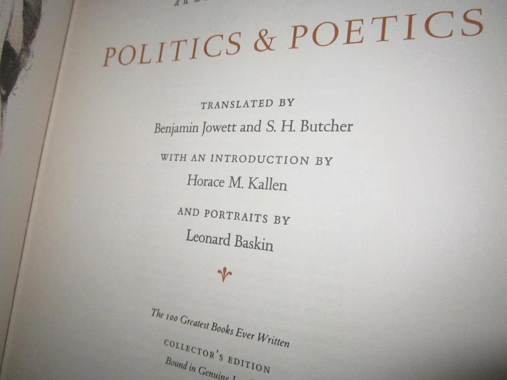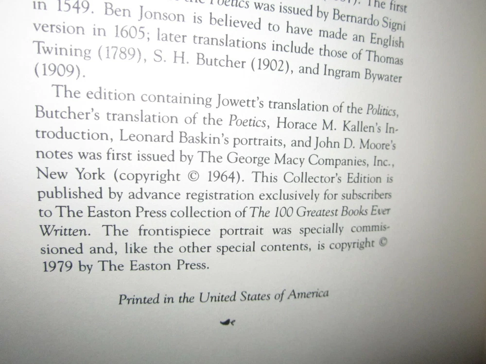 Politics Poetics Aristotle 100 Greatest Books Collectors Edition Easton Press HC NM Leather in excellent condition like new, you will receive the one in the pictures. This will be shipped within 24 hours of receiving cleared payment or local pickup is available and I also combine shipping but do not pay until I send you a updated combined shipping invoice. NJ Residents sales tax will be added at checkout I have alot of Easton Press Books listed so if you see a few you want not only will I combine shipping I will give you a additional discount for multiple purchases so message me with the books you want and I will reply with the discount