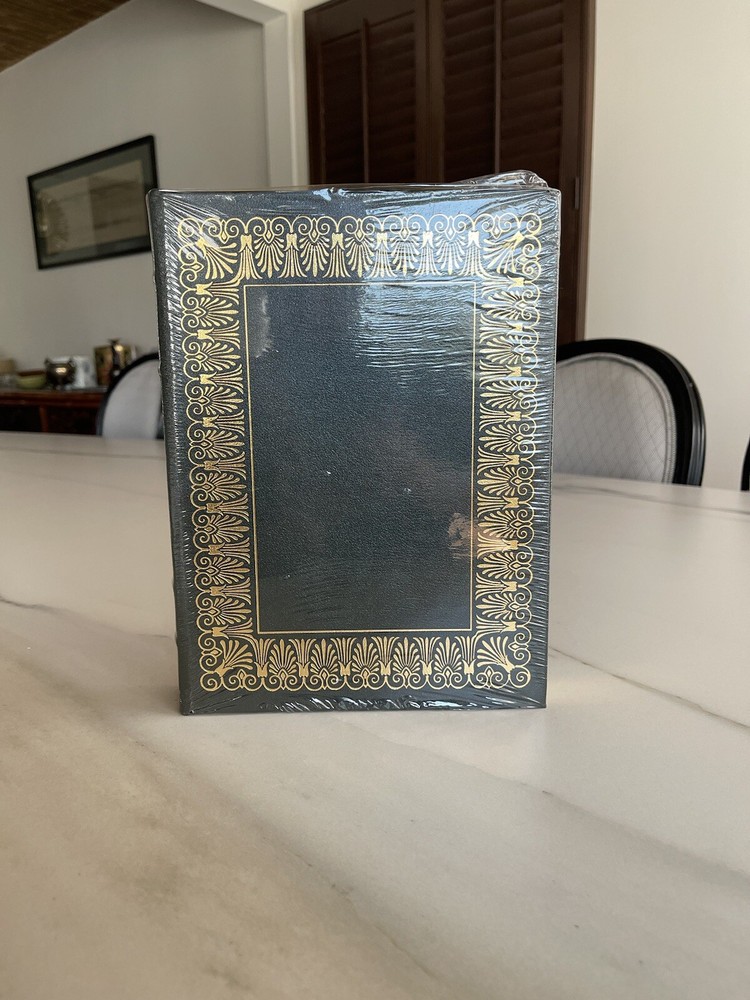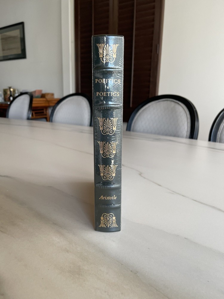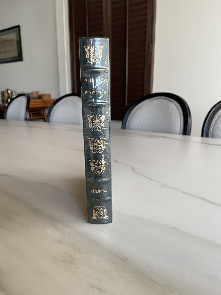 This rare and highly sought-after book is a must-have for any serious collector of political works. With its hardcover binding, leather bound cover, and limited edition collector's edition, this book is sure to impress. The book is a original printing from 1979 and features illustrations that bring the topic of politics to life. Written by the renowned author Aristotle, this book is a valuable addition to any collection of political works. It covers a wide range of topics including political theory, strategy, and tactics. The book is in English and was printed in Norwalk, Connecticut. Condition: The books is still in its original plastic wrap, however, there is a rip in the plastic in the upper right corner, which I’ve documented in the photos, along with a slight indent in the top section of the gilded page (also documented), so condition is considered good. There are no other noticeable flaws. Leather Bound. Accented in 22kt gold. Printed on archival paper with gilded edges. The endsheets are of moire fabric with a silk ribbon page marker. Smyth sewing and concealed muslin joints. This book is in full leather with hubbed spines. First Easton Press Edition. Book Dimensions 10 3/4” Height 1.5” Width 7.5” Depth Weighs 3lbs 2oz
