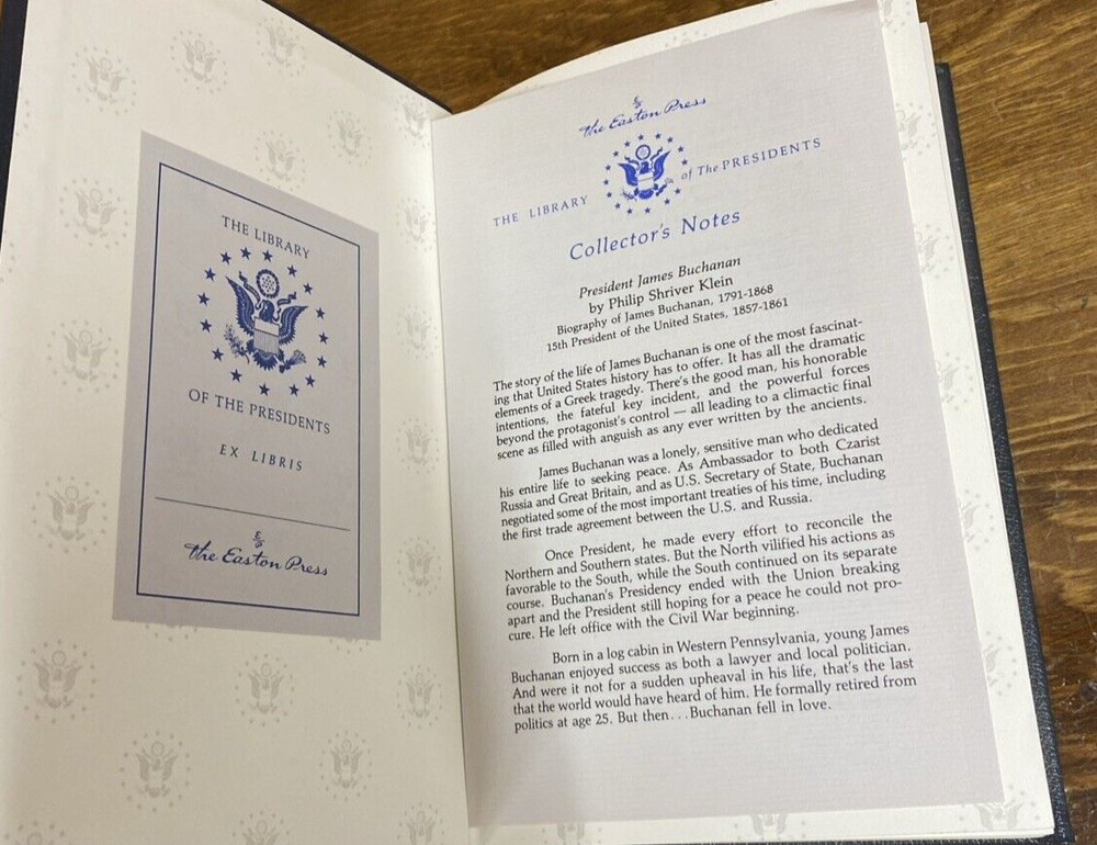 This luxury collector's edition book by Philip Klein is a must-have for any political enthusiast. The book, published by Easton Press in 1987, features a beautiful leather binding and is illustrated with special attributes that make it a unique addition to any collection. The place of publication is Norwalk, CT, and the language is English. The book is a biography and autobiography about President James Buchanan and is an original print. It covers a topic of political significance and is a great addition to any book collection. The book is categorized as antiquarian and collectible, and is a valuable item for any book collector.