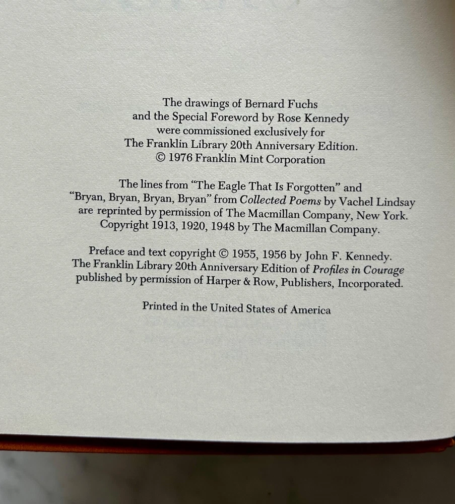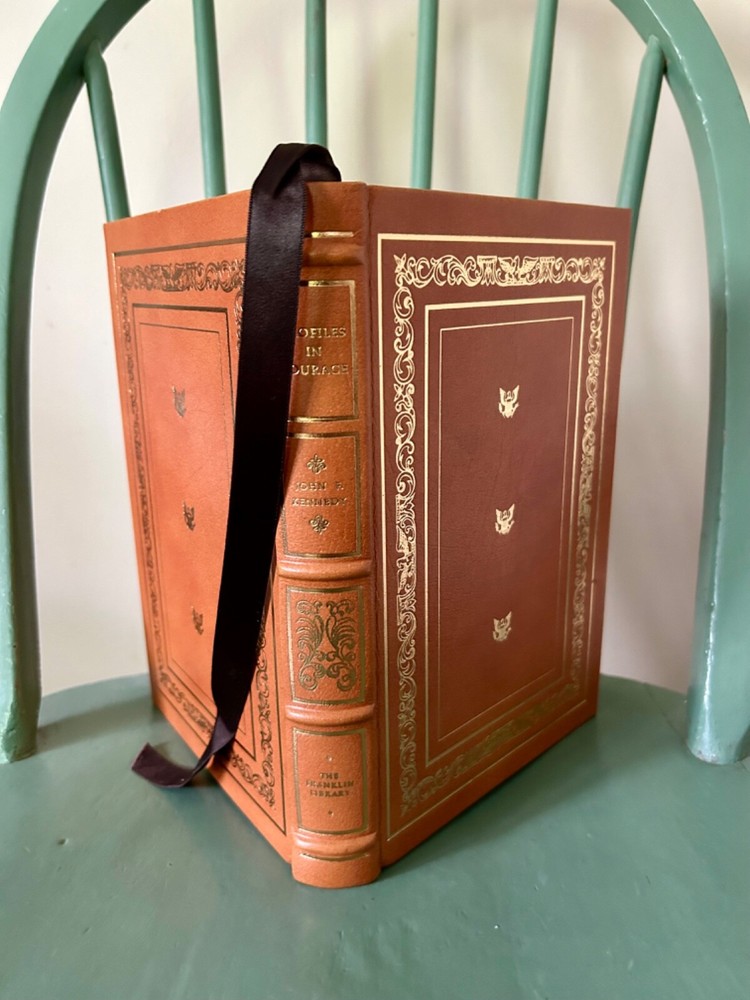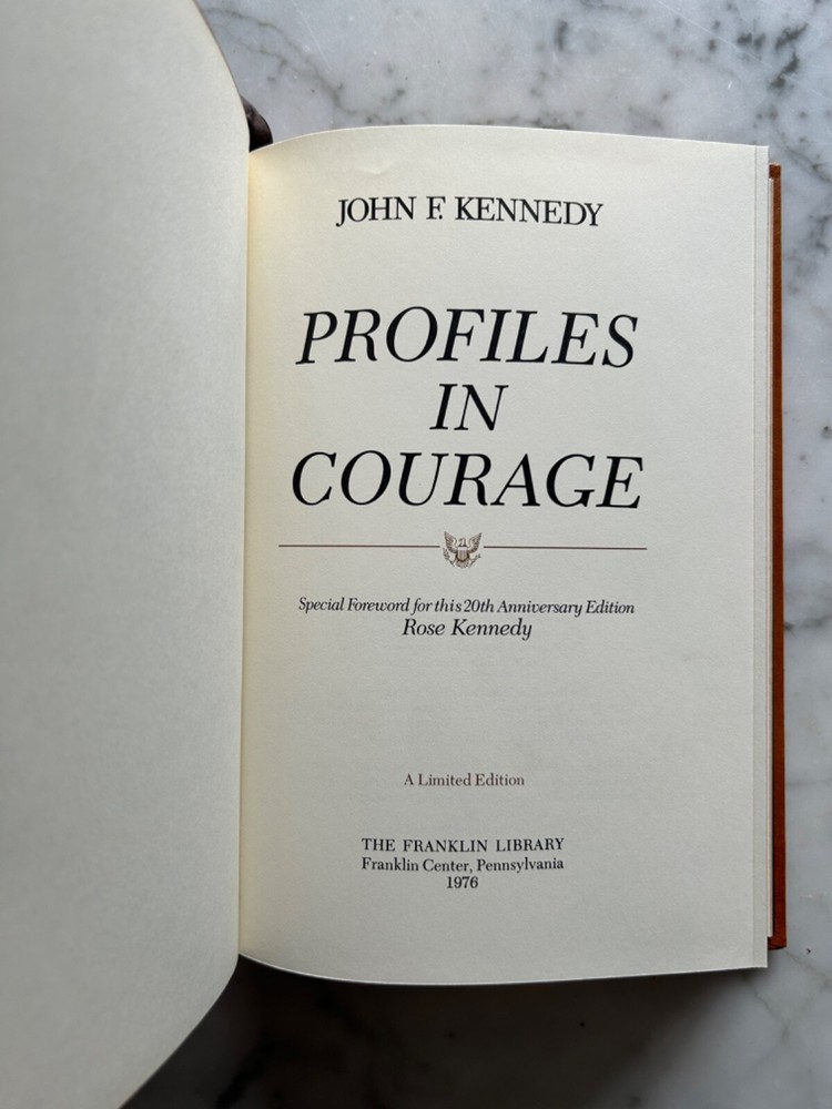 This vintage leather bound book titled "Profiles In Courage" by JFK was published by Franklin Library in 1976. The book is a 20th anniversary edition and features illustrations. It has a reading ribbon and all edges are gilt. The book is in its original form and is not personalized. It is a great addition to any collection and a must-have for fans of John F. Kennedy. The book is in English and was printed in Franklin Center, Pennsylvania. A Limited Edition.