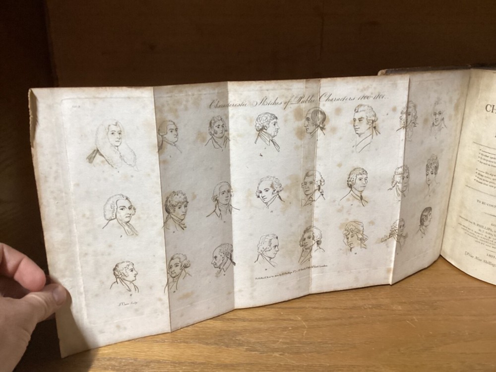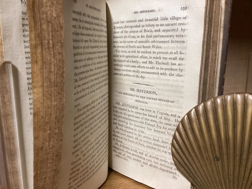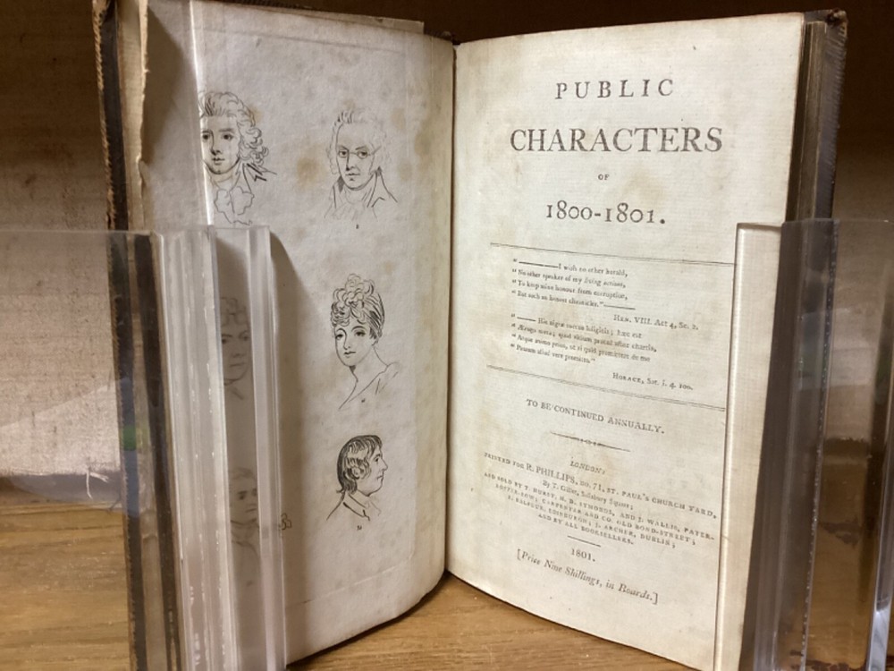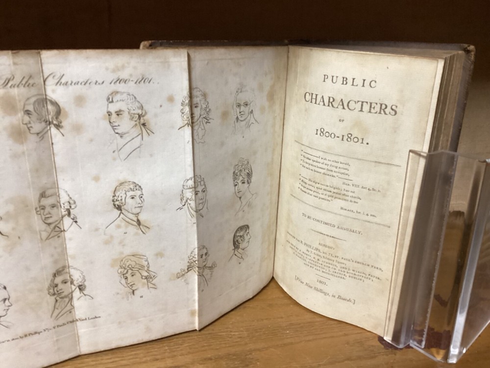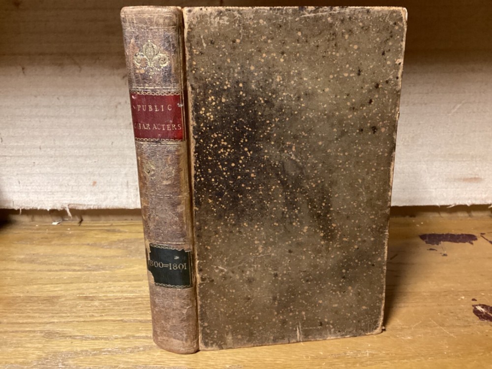 Public Characters of 1800-1801. Printed in London for R. Phillips. 1801, 587 + 7 pp. 8.5” x 5.25”. 8vo. Hardcover full leather. In good condition, with minor rubbing and wear to exterior. Hinges remain tight and text block remains bound well. Light chipping to edges of title labels on spines. Foldout remains in good condition. Light markings. Bookseller sticker on top left corner of front pastedown. General age-related toning to pages, along with periodic foxing and wear. Please see photographs and ask any questions prior to purchasing. A scarce British piece on popular and influential figures at the start of the 19th Century. Includes a section dedicated to Thomas Jefferson, then John Adams’ vice president, who would subsequently be elected president at the end of the year. COLH1801BIJC