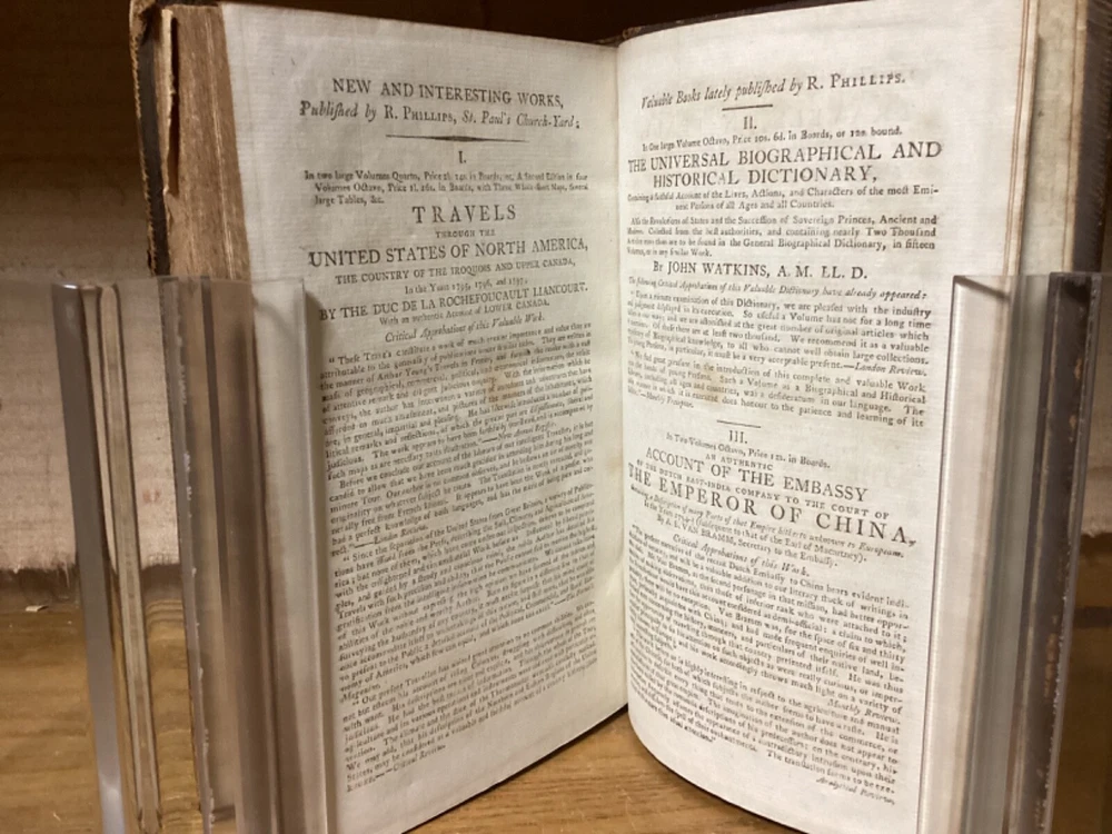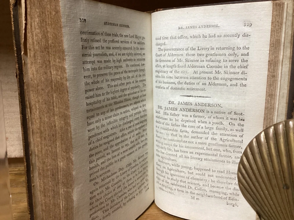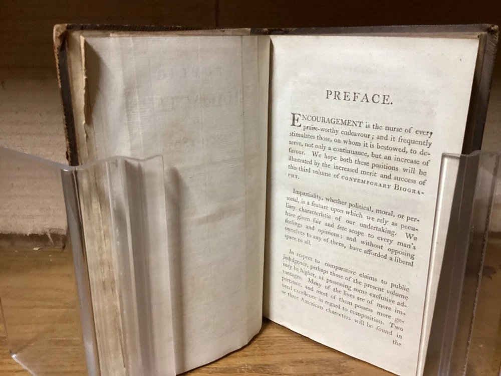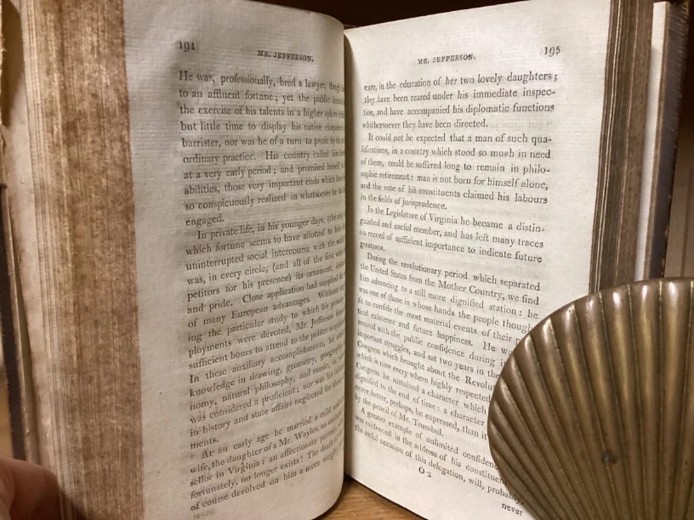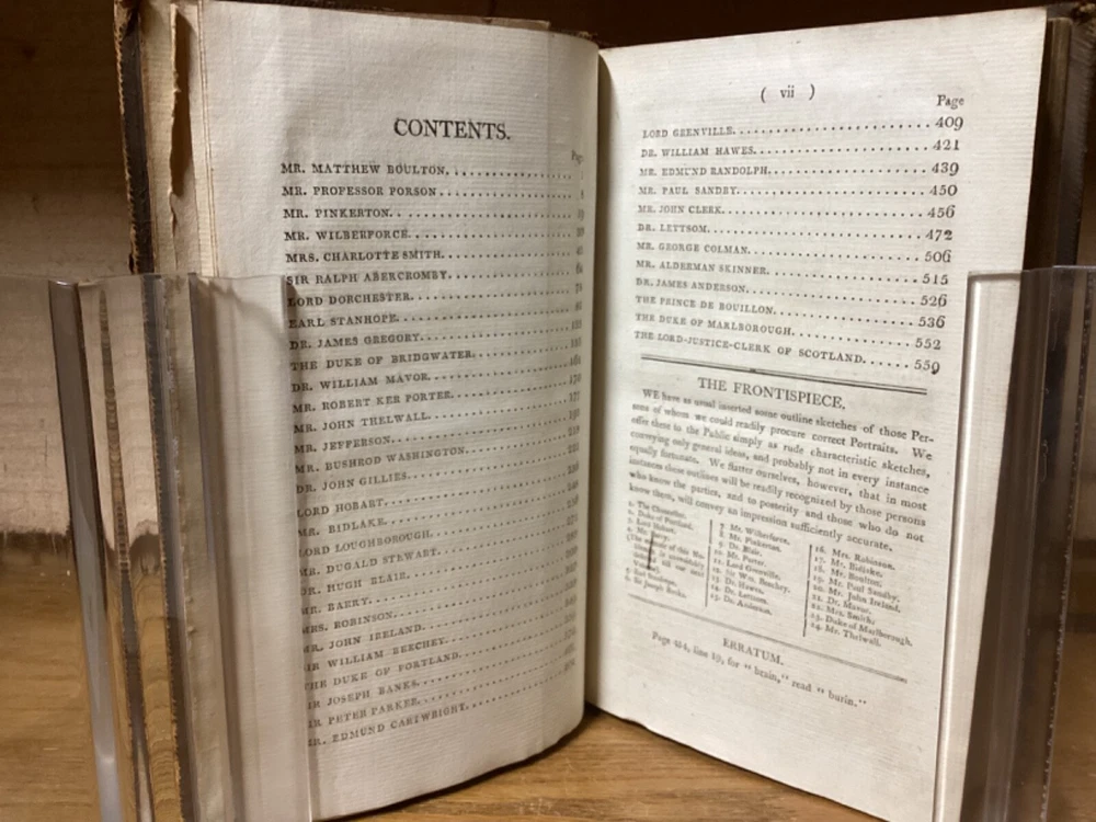 Public Characters of 1800-1801. Printed in London for R. Phillips. 1801, 587 + 7 pp. 8.5” x 5.25”. 8vo. Hardcover full leather. In good condition, with minor rubbing and wear to exterior. Hinges remain tight and text block remains bound well. Light chipping to edges of title labels on spines. Foldout remains in good condition. Light markings. Bookseller sticker on top left corner of front pastedown. General age-related toning to pages, along with periodic foxing and wear. Please see photographs and ask any questions prior to purchasing. A scarce British piece on popular and influential figures at the start of the 19th Century. Includes a section dedicated to Thomas Jefferson, then John Adams’ vice president, who would subsequently be elected president at the end of the year. COLH1801BIJC