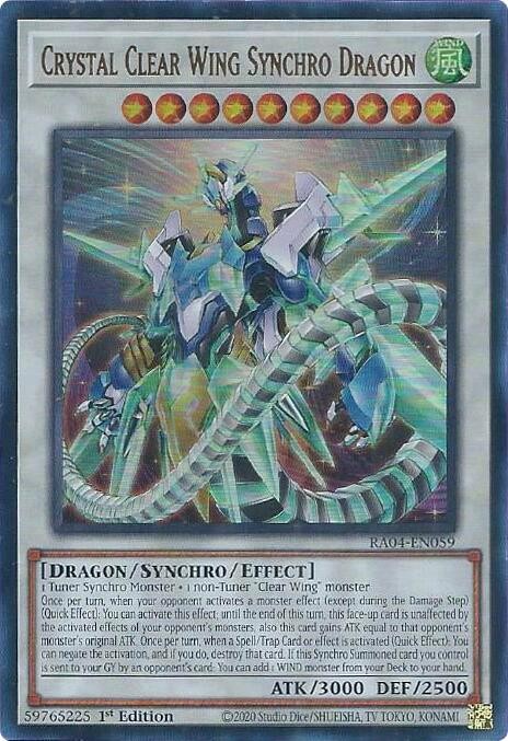 This is a nice example of a Quarter Century Stampede #RA04-EN059 Crystal Clear Wing Synchro Dragon (UR) Other important information about this card: Ultra Rare In 2025 Crystal Clear Wing Synchro Dragon (UR) played for the . Please check out our other listings for more great cards.