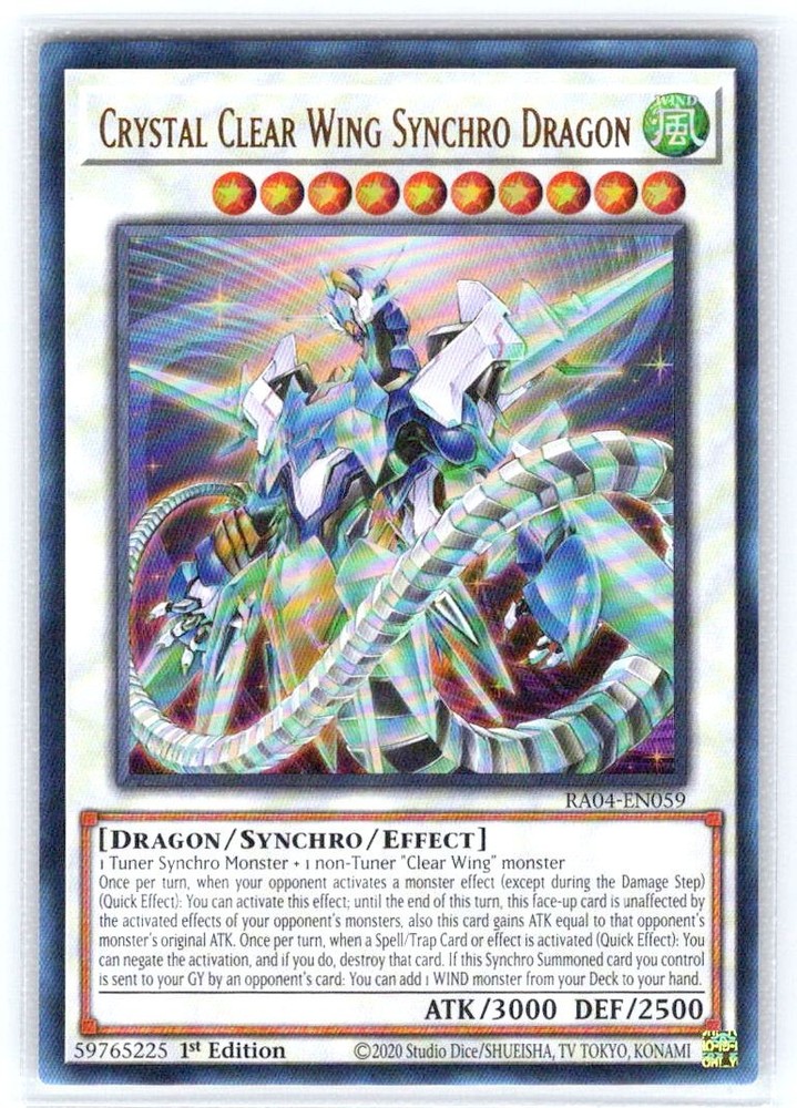 This is a nice example of a Quarter Century Stampede #RA04-EN059 Crystal Clear Wing Synchro Dragon (UR) Other important information about this card: Ultra Rare In 2025 Crystal Clear Wing Synchro Dragon (UR) played for the . Please check out our other listings for more great cards.
