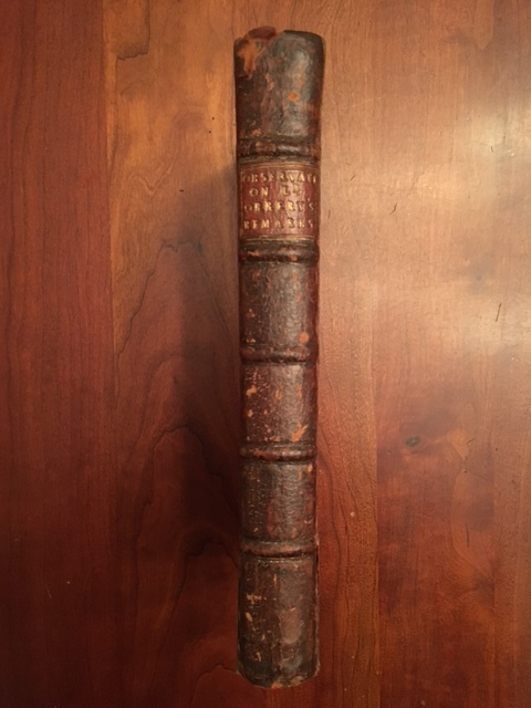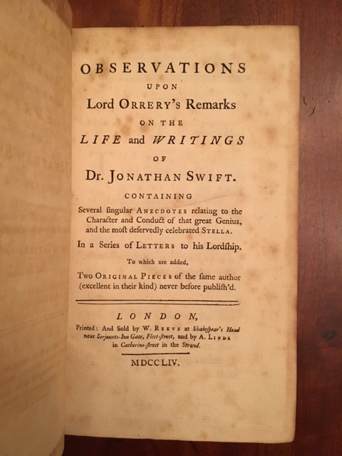 OBSERVATIONS UPON LORD ORRERY'S REMARKS ON THE LIFE AND WRITINGS OF DR. JONATHAN SWIFT. By Patrick Delany Published W. Reeve,, London:, 1754 . Brown leather, five raised bands, original boards, 310 pp. Book is in very good shape, with some bumping and wear to corners, small tears at top and bottom of spine, one inch crack to bottom of back spine gutter. Otherwise leather is in very good shape, contents internally tight. quite an excellent copy. I've done my best to describe the book, but if you have any questions, please don't hesitate to send me an e-mail.