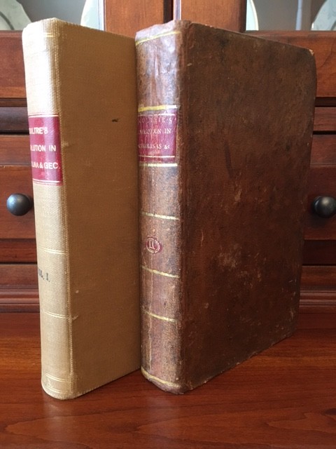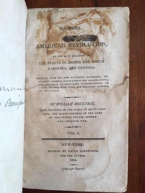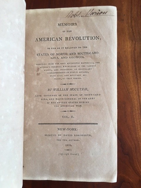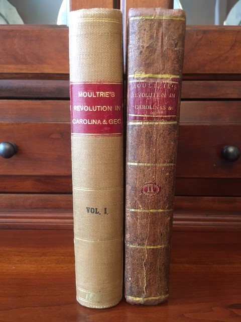 Memoirs of the American revolution, so far as it related to the states of North and South-Carolina, and Georgia, comp. from the most authentic materials, the author's personal knowledge of the various events, and including an epistolary correspondence on public affairs, with civil and military officers, at that period By William Moultrie Published: New-York, The author, 1802 . FIRST EDITION. 506 + 446 pp. Two volumes. Hardcover married set. Volume 1 bound in cloth. Volume 2 bound in full period leather. Some staining to the title page of Volume 1 (see pic). Moultrie, a colonel with the 2nd South Carolina Colonial regiment, was elevated to the stature of national hero during the Charleston expedition against Clinton in 1776 for his defense of the fort that was later named after him. He later commanded a successful action at Beaufort in 1779 but was made a British prisoner of war with the Charleston expedition of 1780. He was exchanged in 1782, and became the last officer in the Continental Army to be appointed to the grade of Major General. He later served two terms as the governor of South Carolina in 1785 and 1794. Howes M865; Sabin 51142. Exceptionally SCARCE title. I've done my best to describe the books, but if you have additional questions, please don't hesitate to send me an e-mail.