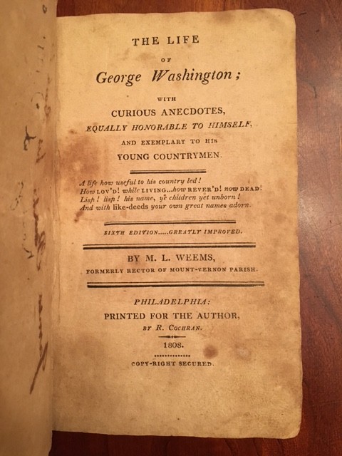 The Life of George Washington; With Curious Anecdotes, Equally Honourable to Himself, and Exemplary To His Young Countrymen By M.L. Weems Published: R. Cochran, Philadelphia, 1808 . 228 pp. Covers worn with boards exposed, loss at head of spine and corners, spine rubbed and creased; previous owner name, pages darkened and foxed throughout Interestingly, this biography is the source of the quote "I cannot tell a lie." Not Ex-Lib. I've done my best to describe the book, but if you have additional questions, please don't hesitate to send me an e-mail.