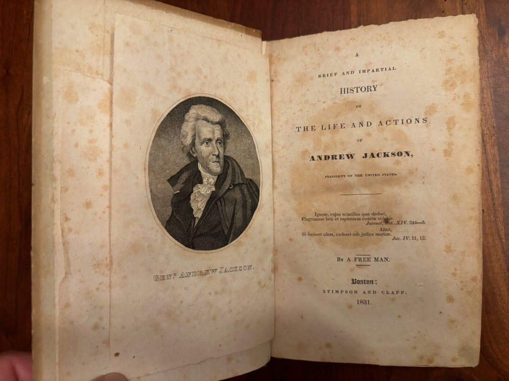 A Brief and Impartial History of the Life and Actions of Andrew Jackson By A Free Man Published: Stimpson & Clapp, Boston, 1831. 216 pp. Hardcover in original cloth-backed boards, lacks spine label, top third of front endpaper torn away, portrait present, very good to fine for age, Howes S-737 I've done my best to describe the book, but if you have additional questions, please don't hesitate to send me an e-mail.