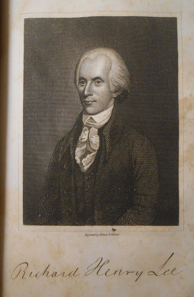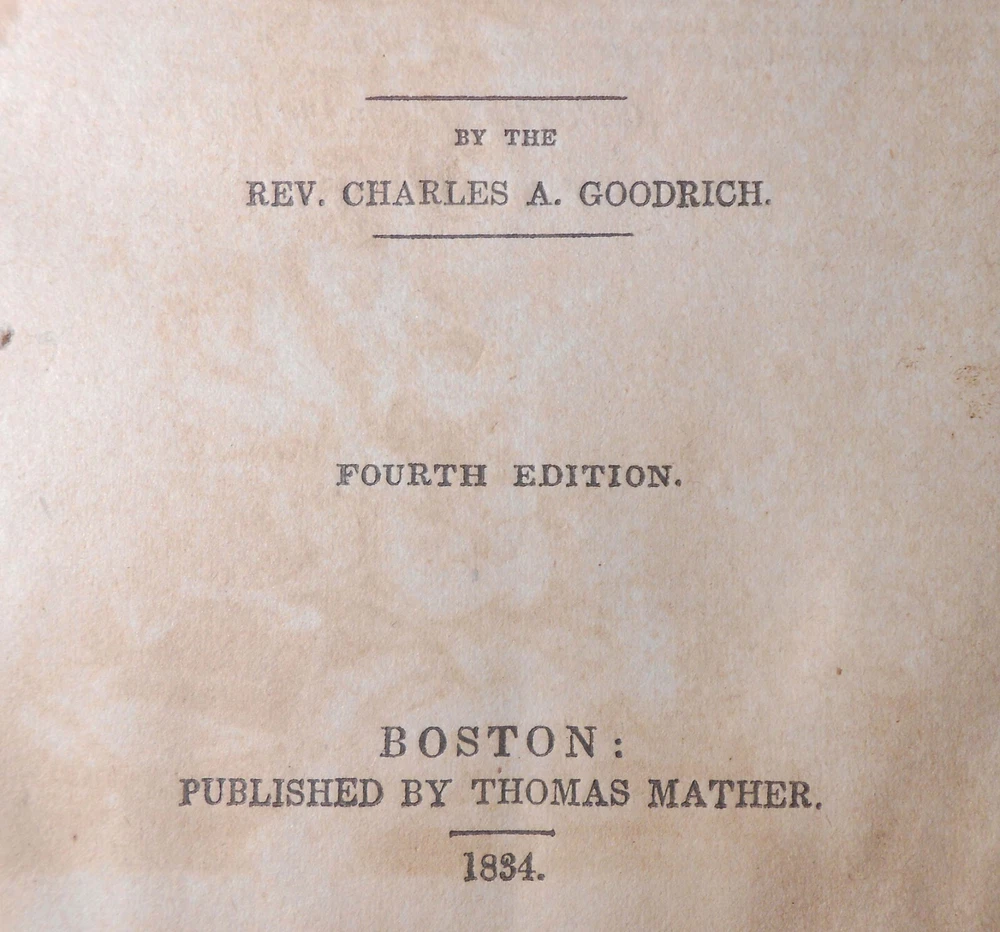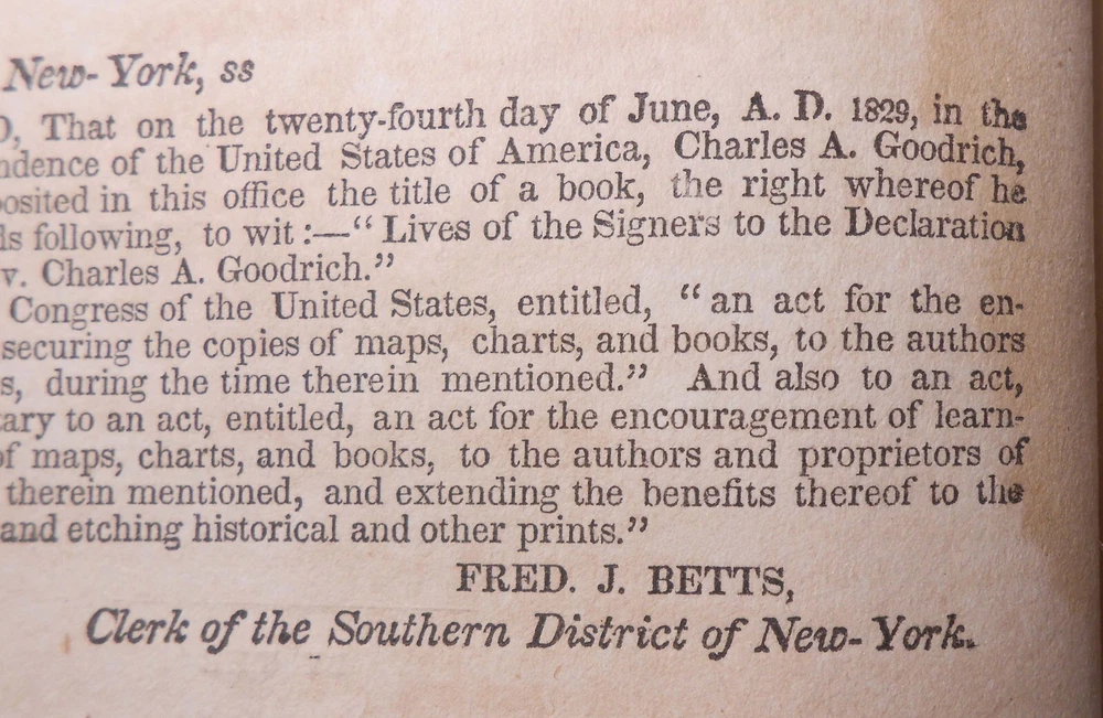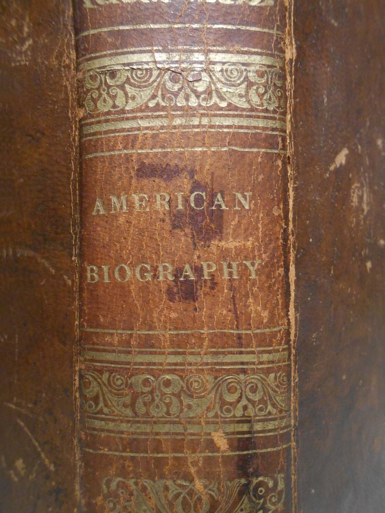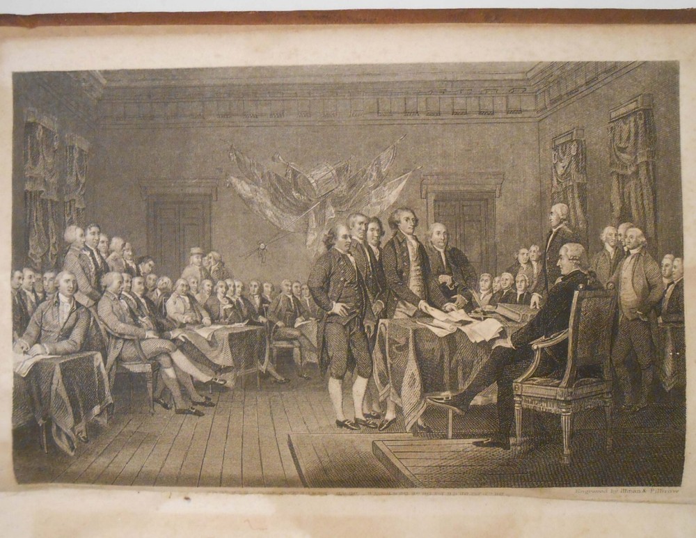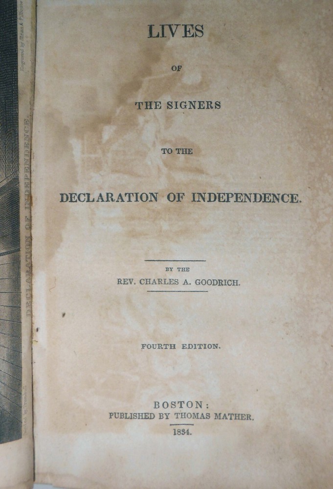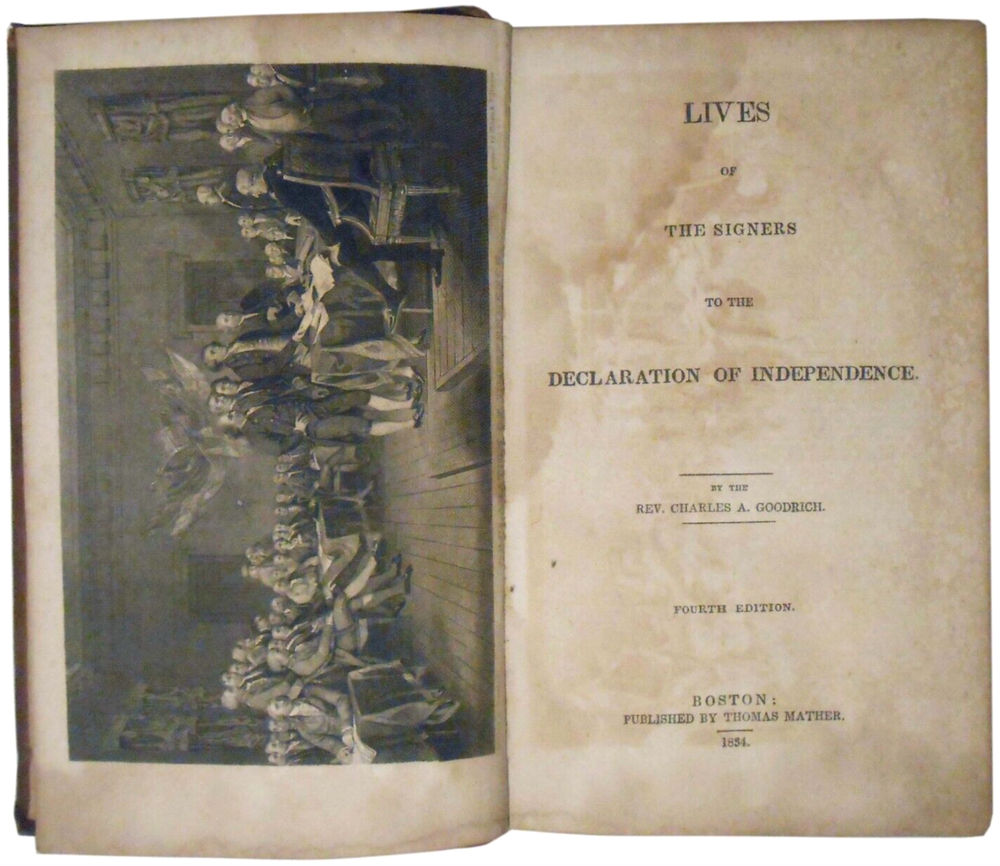 RARE 1834, REVERAND CHARLES A. GOODRICH, BOSTON, MASSACHUSETTS, EARLY 19TH CENTURY AME RI CAN ANTIQUE ' AME RI CAN BIOGRAPHY~ 'LIVES of the SIGNERS to the DECLARATION of INDEPENDENCE,' LEATHER BOUND, with GILDED, RIBBED SPINE & PROFUSELY ILLUSTRATED, with BLACK & WHITE ETCHINGS of NOTABLE AME RI CAN STATESMEN & DOCUMENT SIGNATORS, 4th EDITION, EX-LIBRIS, with PROPRIETARY PERSONAL LABEL, ETCHINGS by ILLMAN & PILBROW (Dated 1834) Early 19th century Ame ri can antique leather bound volumes of early Ame ri can history of the nascent republic & biographies of the Founding Fathers DIMENSIONS: 7 ½ " Height x 4 ¾ " Width x 1 ¾ " Depth Weight: 1 lb. 2 oz. DESCRIPTION: CONDITION: Good to Very Good overall antique condition.
