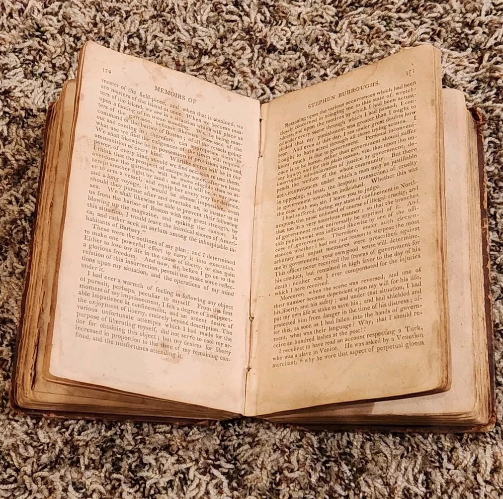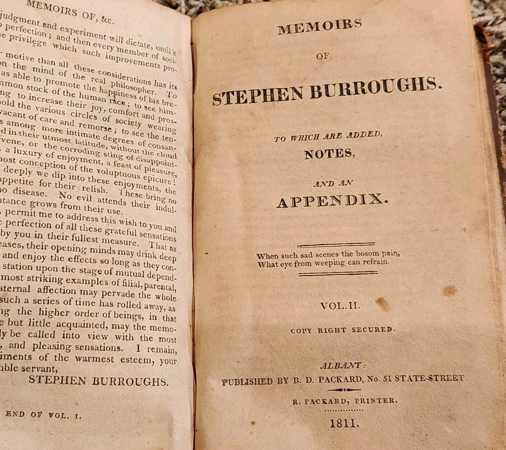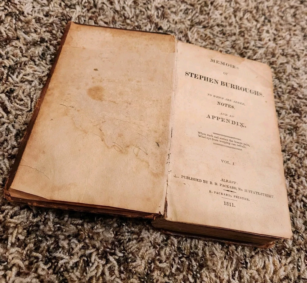 This rare book from 1811 is the memoirs of Stephen Burroughs, bound in leather and published by B.D. Packard. The two volumes are bound together in leather and written in English, offering a glimpse into Americana through the author's personal experiences. It is an original edition, making it a valuable collectible for those interested in historical literature and memoirs from the early 19th century. Binding in great condition.