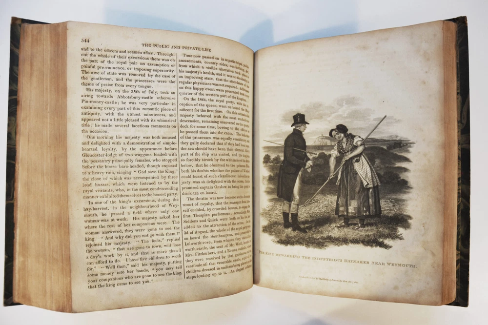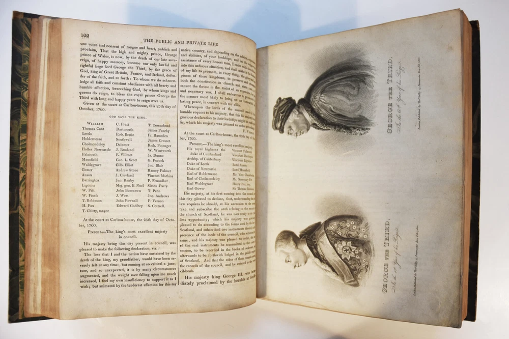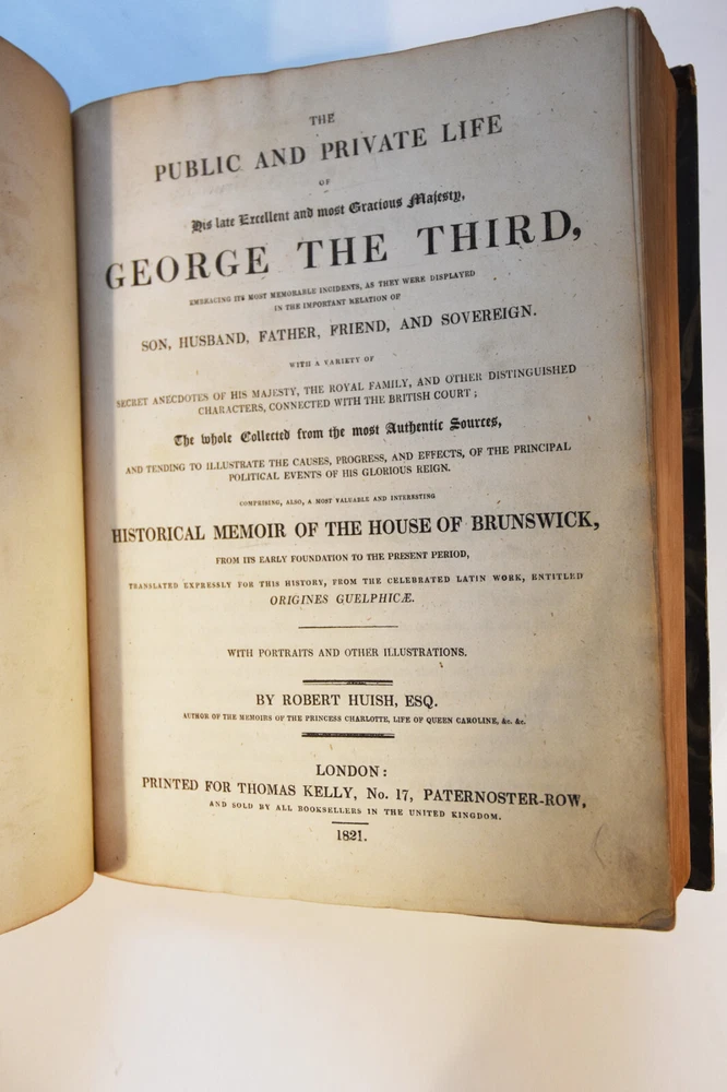 Please see photos and read the condition description. We are most happy to post and send additional photos and to answer any questions. This a copy of Memoirs of George the Third -- The Public and Private Life of His late Excellent and most Gracious Majesty, George the Third (George III), embracing its most memorable Incidents, as they were displayed in the important Relation of Son, Husband, Father, friend, and Sovereign, by Robert Huish Esq., Printed for Thomas Kelly, London, 1821. This is quarter leather bound with stamped spine with design and five raised bands. Top of block edge has gilt. Covers, endboards, and end papers are all marbled. Based on the boards, this appears to be a mid-19th century rebinding of the book. A very nice copy. Leather at spine edges should be lightly conditioned. There was a bookplate inside the front cover dating from the early-mid 20th century. It was an "Ex Libris Michael S. Holowaty" and it had separated and was loose. It left a glue residue. I have the bookplate and am including a photo of it. It is not included, but I include this to help show provenance. This copy was purchased in the mid-1970s from O'Gara's book shop on 57th Street in Hyde Park, Chicago. Please see the photos and read the condition description. We are happy to provide more. We carefully pack and ship our books in boxes to protect them. This book will require signature and insurance.