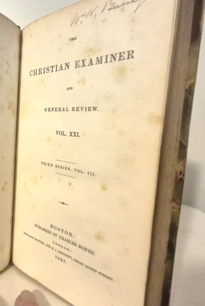 CHRISTIAN EXAMINER AND GENERAL REVIEW Volume 21 ************** CHRISTIAN EXAMINER AND GENERAL REVIE W , Volume XXI, Third Series, Volume III .......Published by Charles Bowen, Boston, in 1837...... DESCRIPTION - The book is bound with a leather spine...... CONDITION - The ol' fella is in good used condition......The pages are overall good, with spots on some of the pages, mostly the very early and late pages.....The cover has general wear and use.…And there is a previous owner's label on the spine..........All in all, this is a purty good ol’ book ……….I think you will be pleased with it...... PAYMENT AND SHIPPIN ' - 'Course the thrilled winner is gonna hafta pay $5.95 for postage and handlin'........Multiple purchases save on shippin'..... ... Now while you're here, why don't you give my other auctions a look-see...Why, I 'spect I got a wagon load of mighty good books over yonder in my Book Barn..... Thanks a heap....!!! - - - ol' arkee