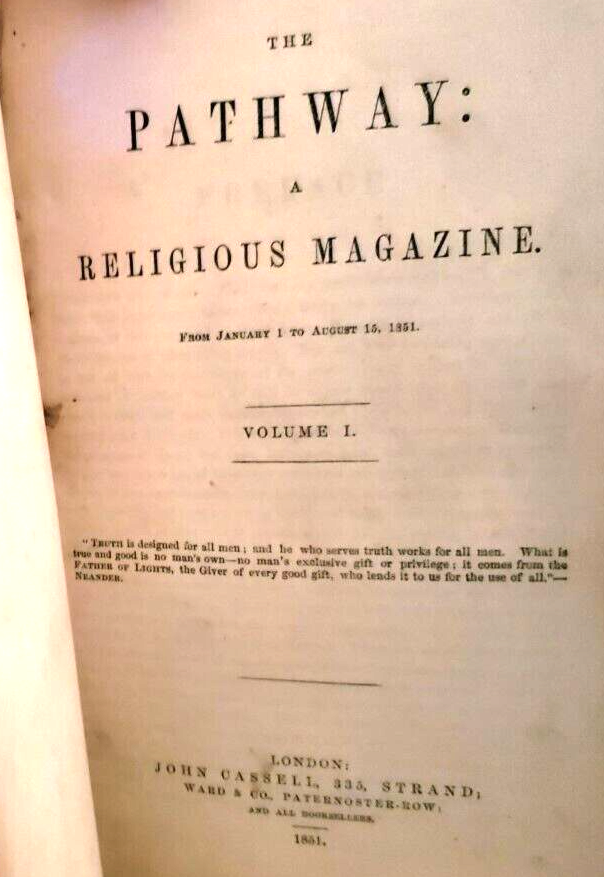 PATHWAY: A RELITIOUS MAGAZINE * PATHWAY: A RELIGIOUS MAGAZINE - Volume One, Jan. 1 to Aug. 15, 1851 … ……Published by Cassell, London, in 1851..... DESCRIPTION - Hardback, bound with a leather spine... CONDITION - The big fella is in good used condition.......The pages are good for age, with what I would call a fairly light old book scent, and with the edges darkened...And there is writing on the first endpaper ....….The cover is solid, with general wear and use, and with much of the cover darkened ……This is a purty good ol' book…… I think you will be pleased with it........…… PAYMENT AND SHIPPIN ' - ... .'Course the thrilled buyer is gonna hafta pay $4.95 for shippin' and handlin'......Multiple purchases save on shippin' .... ..... Now while you're here, why don't you give my other auctions a look-see...Why, I 'spect I got a wagon load of mighty good books over yonder in my Book Barn... Thanks a heap....!!! - - - ol' arkee *