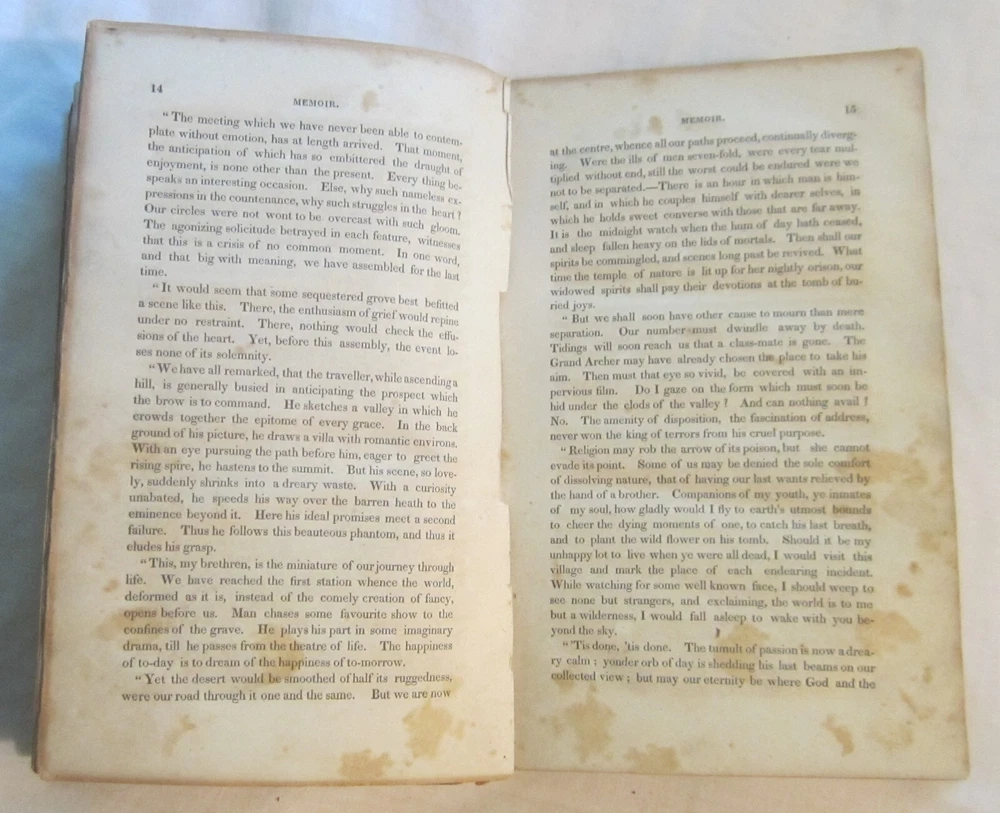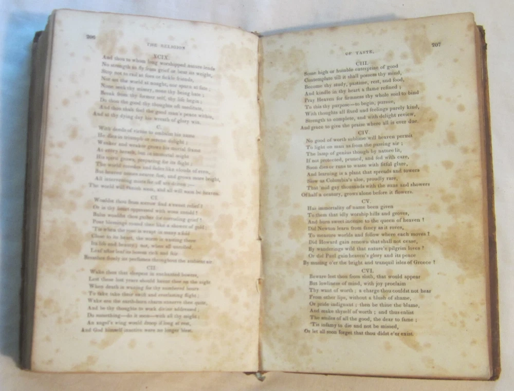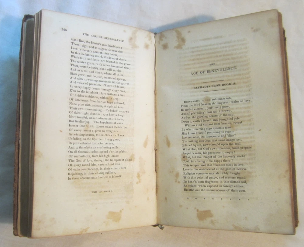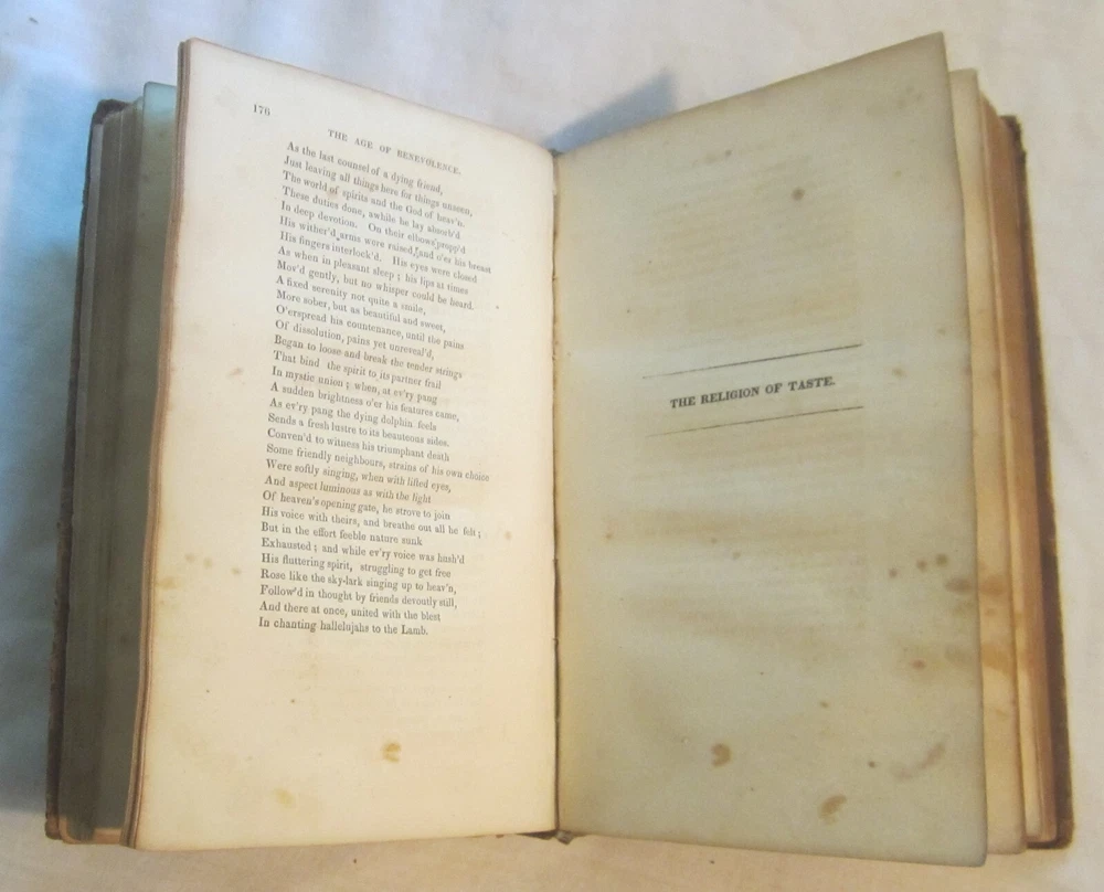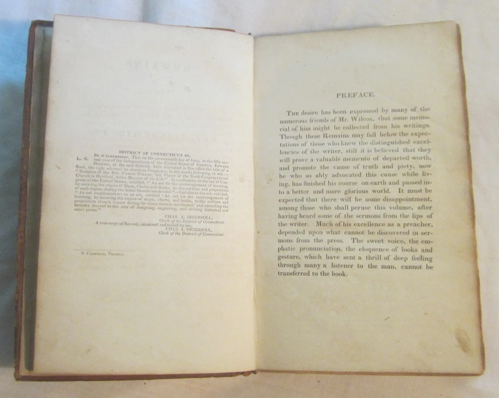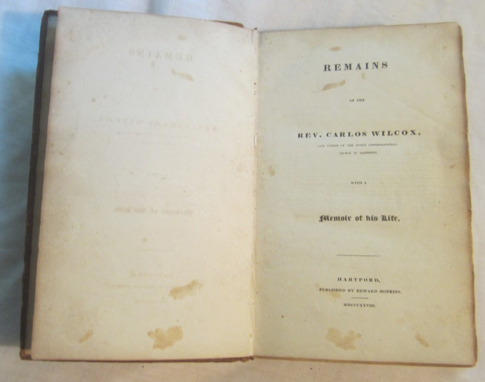 Measuring about 5-1/2" x 8-1/2", and 430 pages long, this hardcover book is "The Remains of the Rev. Carlos Wilcox, (late Pastor of the North Congregational Church in Hartford), with a Memoir of His Life." Bound in full leather, it is dated 1828 and published in Hartford, Connecticut, by Edward Hopkins . No author credit is stated, perhaps because the content is almost entirely made up of the Rev. Carlos Wilcox's own writings. The book is divided into the following three sections: - Memoir (pages 9 to 94), consisting mostly of letters written by Carlos Wilcox. - Poetry (pages 95 to 208), containing two works, "The Age of Benevolence" and "The Religion of Taste." - Sermons (pages 209 to 430), containing 14 sermons on various subjects. The name written on the front free end paper is possibly that of the original owner, but it is barely legible - possibly Benjamin H. Catlin. And the bookplate on the inside front cover establishes an interesting chapter in the later history of ownership, stating that the book was given to the Godfrey Memorial Library from the private library of George Seymour Godard. T he Godfrey Memorial Library, specializing in "American genealogy, biography and local history", is located in Middletown, Connecticut and was founded in 1947. George Seymour Godard (1865-1936) was Connecticut's State Librarian from 1900 to 1936. It is in used and worn condition, with the front cover almost entirely separated at the spine, leaving the binding weak in a few places, including the first dozen or so pages. The cover is also heavily worn, especially the spine, and the back spine hinge is also partially cracked. On the inside, there is some heavy foxing to the pages, some creased or bumped page corners, and bookstore notations in pencil on the front free end paper. International Buyers – Please Note: Import duties, taxes, and charges are not included in the item price or shipping cost. These charges are the buyer's responsibility. Please check with your country's customs office to determine what these additional costs will be prior to bidding or buying. Customs fees are normally charged by the shipping company or collected when you pick the item up. These fees are not additional shipping charges. We won't under-value merchandise or mark the item as a gift on customs forms. Doing that is against U.S. and international laws. COMBINED SHIPPING: See our seller list for other interesting and unusual items, in fact bid on several and you might save on shipping and handling. If you buy multiple items, and if it's feasible and cost-effective for us to ship the items together, we will gladly consider requests to combine shipping at a reduced cost. Just e-mail us, and we can provide combined shipping cost estimates on a case-by-case basis. Depending on weight and other considerations, we typically offer full shipping rate for the first item, then 50 cents or $1.00 per item. And if you are purchasing multiple items, please make the payment as a single payment, rather than trying to pay for each item separately. Oh, and this may sound obvious, but we can't reduce the shipping charges for items on which we offer free shipping. INTERNATIONAL SHIPPING COSTS: If the eBay auto-calculator is not responding, or if you think our shipping costs are too high, please contact us prior to bidding to determine your shipping options and costs. Repeat, prior to bidding , please. FEEDBACK: Because of abuses we've experienced in the past, we have totally given up on the eBay feedback system, so we neither give nor expect feedback. Please, therefore, do not contact us after the auction asking us to leave feedback. If you ever have a problem with an item you purchase from us, please contact us directly about it before giving negative feedback or seller ratings, and especially before invoking eBay's dreaded Grand Tribunal in processes like "Return Requests" or "Opening an Item Not as Described Case." No one is perfect, and we occasionally mis-describe something, or an item arrives late or gets damaged in the mail, but we are always quick to respond to a problem and set it straight in the most mutually agreeable way.