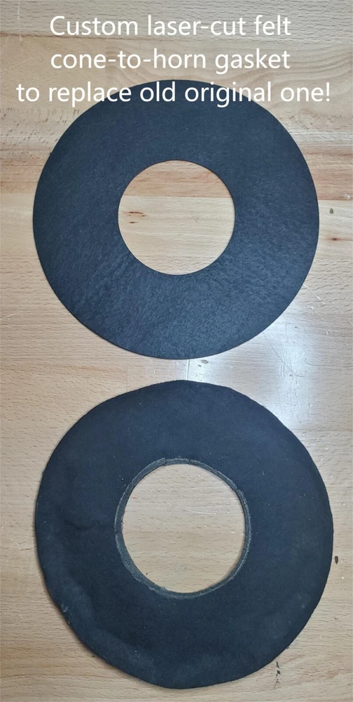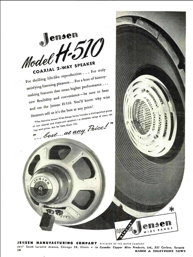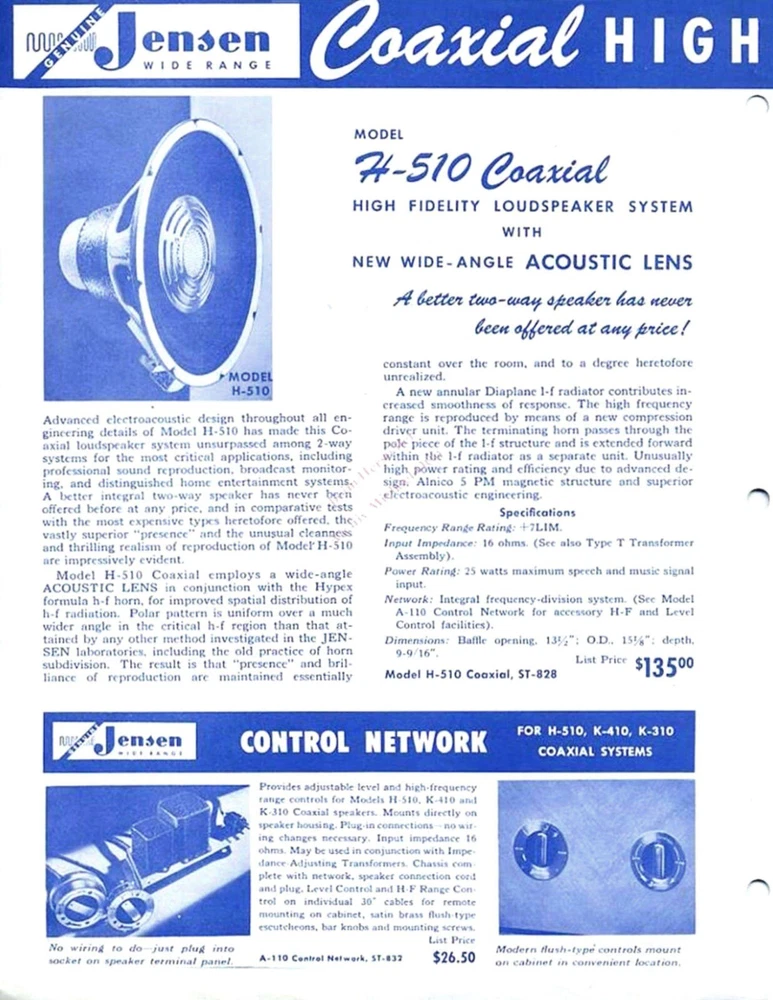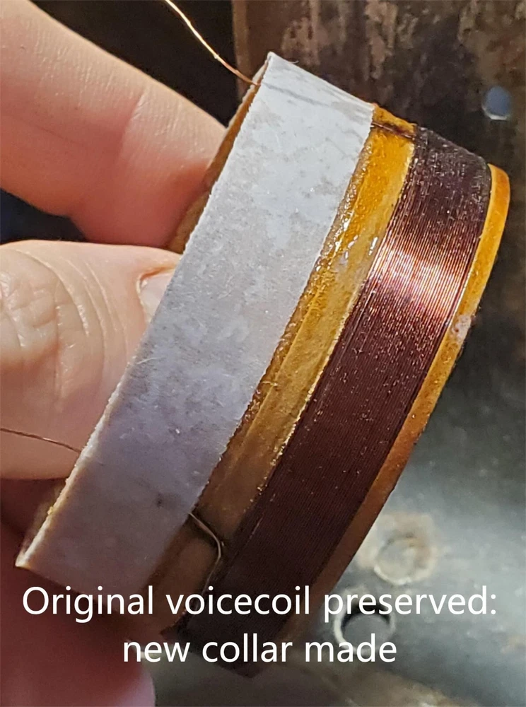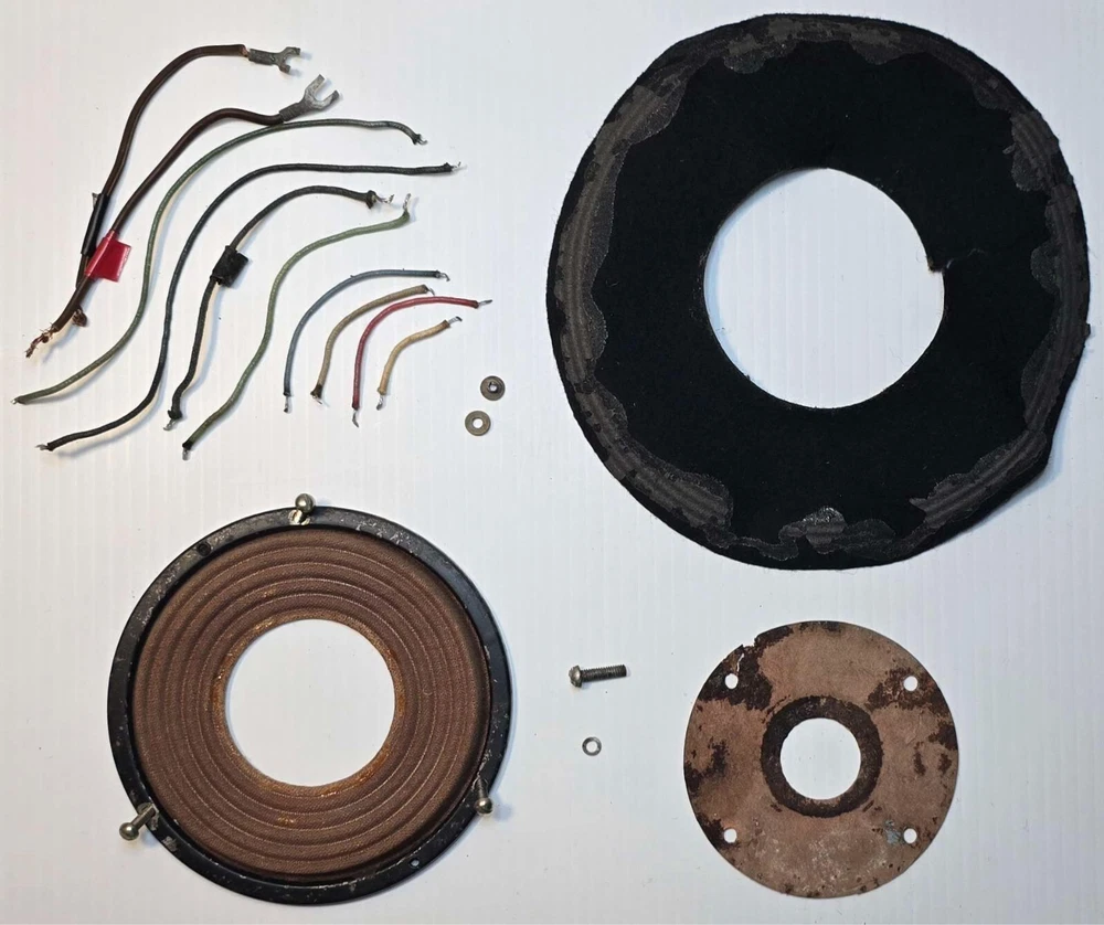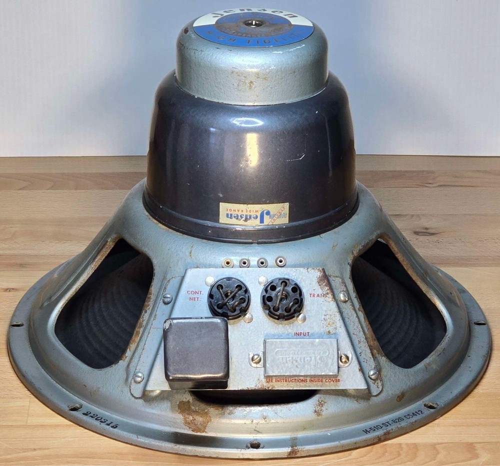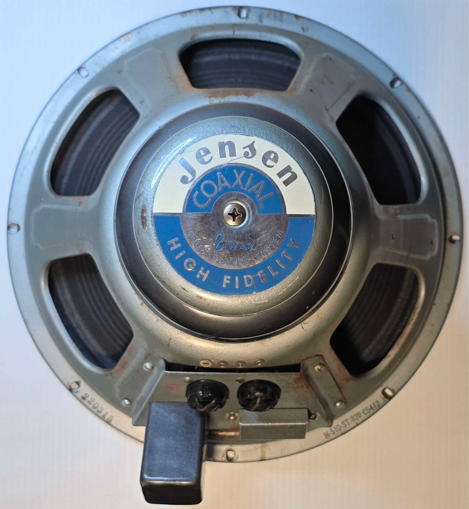 Jensen H510 This listing is for a RESTORED and reconed 1953 Jensen H-510-ST-828 C5412 15" Coaxial of 16 ohms impedance and rated at 25 watts. Costing $135 when released ($1551 when adjusted for inflation in 2024), these coaxials are highly coveted, even today. First released in 1949, Jensen advertised the H-510 as the first-ever speaker to incorporate an acoustic lens for wide dispersion of high frequencies from the horn tweeter. The H-510 is still considered one of the best coaxials Jensen ever made. After our restoration, it certainly was well worth the time and effort! Some of the ads Jensen released in 1949 actually show the acoustic lens plates with an incorrect order! The correct configuration should have the larger diameter lens plate on the front-most position. This allows for a line-of-sight to the first grill when viewing from a side angle. We've listened to the speaker with both configurations and can attest that the proper configuration indeed makes vocals and instruments sound seamless and more real, with a significantly less "pinched"/"nasal" quality. The H-510 has a punchy and faithful sounding 15" all-paper cone woofer and a red colored phenolic dome tweeter, both drivers utilizing Alnico 5 magnets! For those not familiar with the extras that come with these speaker, the basket of the woofer has pre-drilled locations for three trapezoidal shaped plates. From the factory, every H-510 came with a standard speaker terminal plate. Mounted on this terminal plate is a crossover/filter for the tweeter (according to Jensen, the "H" series coaxials has the tweeters filtered at 2000Hz), screw terminals for fastening standard speaker wire (16 ohms impedance here), and two octal-style sockets for optional accessories. For standard 16 ohm connection to an amplifier, use screw terminals "1" (negative) and screw terminal "3" (positive). The two octal-style sockets for two optional accessories (not included nor required) are for the following: 1) a Control Network with two L-pads for greater control with balancing the tweeter level 2) an Impedance-Adjusting Transformer Assembly which presents 4/8 ohm, 500-600/250 ohms, or 10k/5k ohms impedance to the amplifier (depending whether you use model T-101, T-102, or T-103, respectively). You can use this H-510 coaxial, however, without these optional accessories. It's currently ready to play as a standard speaker by using the factory-supplied bypass plugs (installed in each socket). The Control Network bypass plug is indexed to only be inserted one way, so it isn't possible to accidentally insert it incorrectly. The Transformer bypass plug is a standard octal pin configuration, however, so you need to make sure the numbered pins on both the plug and socket match up if you do remove it later for cleaning. This coaxial involves a soft connection between the cone and the horn. There is a felt ring that connects the front of the woofer cone to the back side of the metal horn. There's a lip edge on the rear of the horn specially made for this application. The horn is then threaded into the woofer's magnet assembly. On the back of the woofer magnet is the tweeter, and it mates to the woofer's magnet assembly via a paper gasket and bolts. The Restoration: The H-510 is an advanced speaker in terms of sourcing the right parts, cleaning, prepping, and reconing the speaker. It takes more patience to restore a Jensen coaxial than other speakers. In addition, the felt ring and tweeter gasket are not off-the-shelf parts, so they have to be custom made. We fortunately used our laser to laser-cut a new felt ring and a new fiber gasket, just like the originals! Each step of the way, every part of the speaker was cleaned. There were some fiber washers that deteriorated on some of the lugs on the basket, so we laser-cut some new ones since those, too, aren't obtainable via any modern replacements (at least not the same exact diameter as the originals). The first line of action when reconing a speaker like this is finding the cone and the 2" kraft paper voicecoil - not an easy part to find at all. You usually have to custom make a voicecoil like this, because you won't find a NOS one to replace it, nor will you find a newly manufactured paper/lacquer one a la 1950's style. Luckily, the original voicecoil was still good and usable since it separated easily from the original cracked/torn cone. There was obviously some structural degradation to the collar of the voicecoil (some separated layers of paper that came off with the cone and old adhesive), but that wasn't a problem. To remedy this, we needed to reinforce the top of the voicecoil former for a solid attachment point to the cone throat. We measured out an exact sized strip of a special paper, carefully impregnated it with a specific epoxy for this application, and adhered the new collar to the voicecoil former with huge success. A very thin application of epoxy was also applied to the bottom edge of the voicecoil former, just where the bottom of the windings meet. This ensures that the enamel wire will not become unwound in case the original lacquer did not hold up during use. Ultimately, the geometry of the voicecoil was unaffected during this time of additional handling, and it fortunately remained perfectly round, moving freely in the voicecoil gap without any alignment issues or rubbing! It's rare to be able to preserve an original voicecoil when doing a vintage recone. It's even more extraordinary that such a rare gem like a Jensen H-510 would even allow for us to reuse the original voicecoil! A lot of the character of the original speaker does originate from the voicecoil former material, number of winds (overhung vs underhung), some other secrets, etc, and you normally have to closely study these details to make a replica. Custom winding machine mandrels, the right enamel wire, the right paper, the appropriate epoxy for the power handling, etc... If it did require a custom one, we still would have built