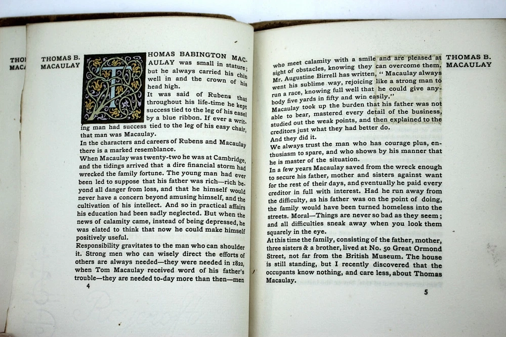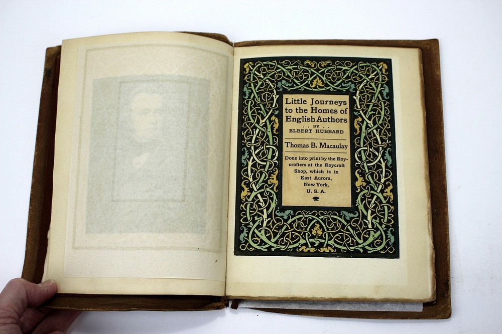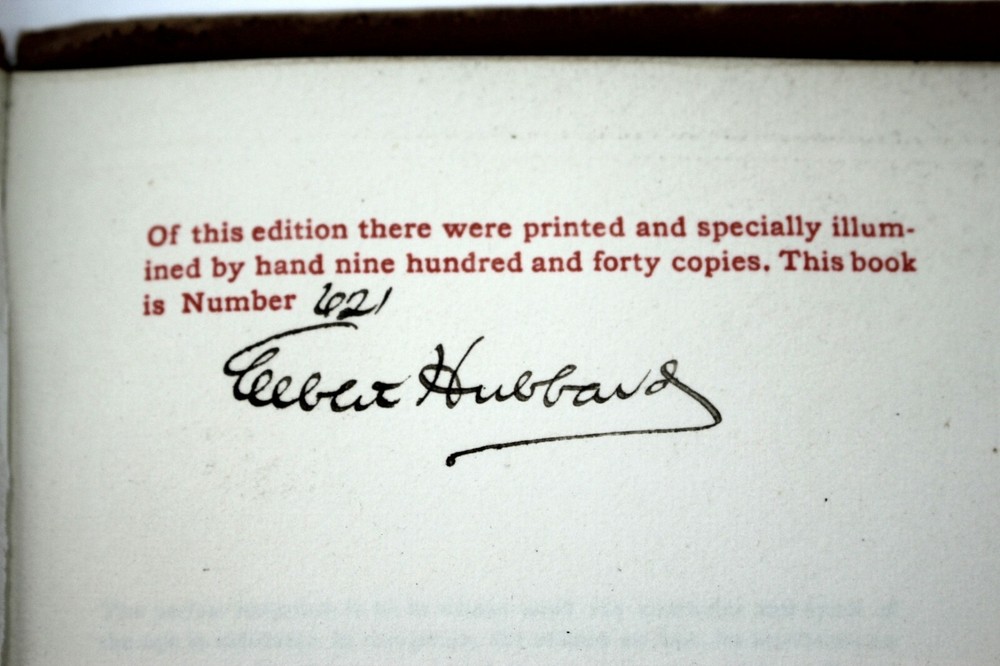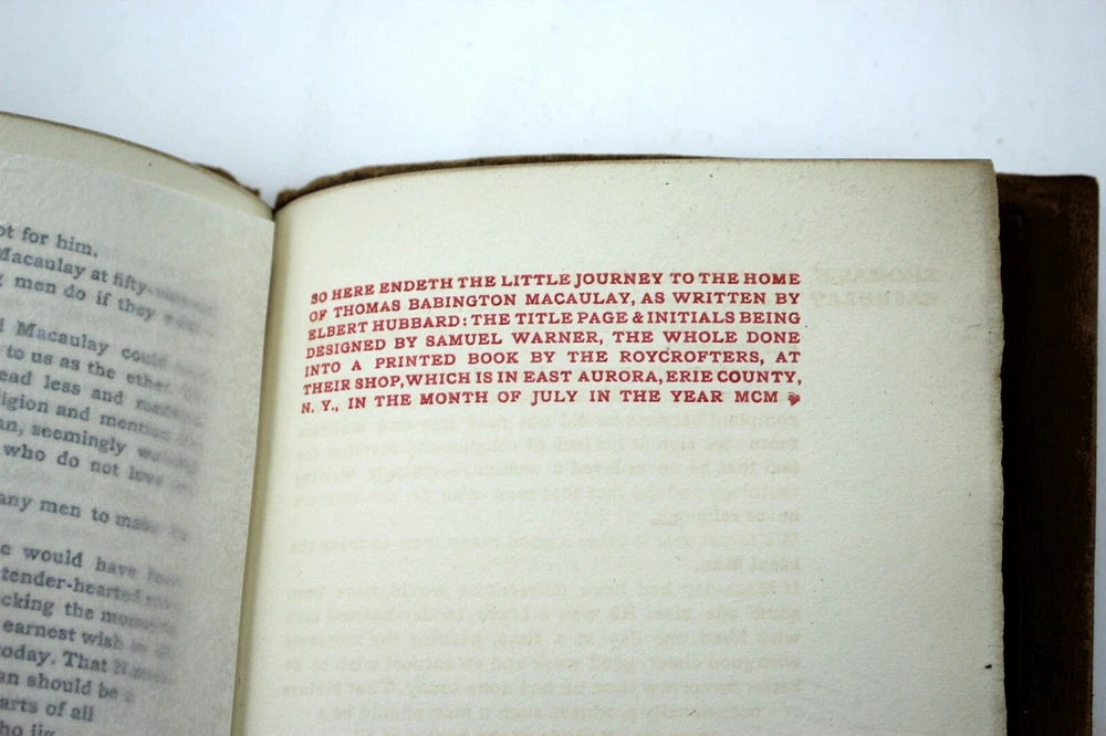 ROYCROFT 1900 Scarce Little Journeys Thomas B Macaulay SIGNED Elbert Hubbard LITTLE JOURNEYS TO THE HOMES OF ENGLISH AUTHORS - THOMAS B. MACAULAY The Roycroft Printing Shop 1900 A very nice copy of this book hand printed by the Roycroft Press. Printed in a limited edition of nine hundred and forty copies, and signed by Elbert Hubbard on the limitation page. This is #621 of 940 copies in this edition. Bound in Suede leather. Colophon reads: "And here endeth The Little Journey To The Home Of Thomas Babington Macaulay, As Written by Elbert Hubbard: The Title Page & Initials Being Designed by Samuel Warner, The Whole Done Into A Printed Book By The Roycrofters, At Their Shop, Which Is In East Aurora, Erie County, N.Y. In The Month Of July In The Year MCM. Cover has some light toning along the top near the title, and there is light general wear to the edges - but overall excellent condition for a fragile title. Please feel free to contact me with any questions, and thank you for your interest. Please take a look at the photos for more details feel free to send us a message if you have any questions. Buy more than one item and save on shipping. Will combine shipping on all orders See photos for condition description. Pictures are of the actual item(s) you will receive. 5 1019 Case 1, 2 #Roycroft1