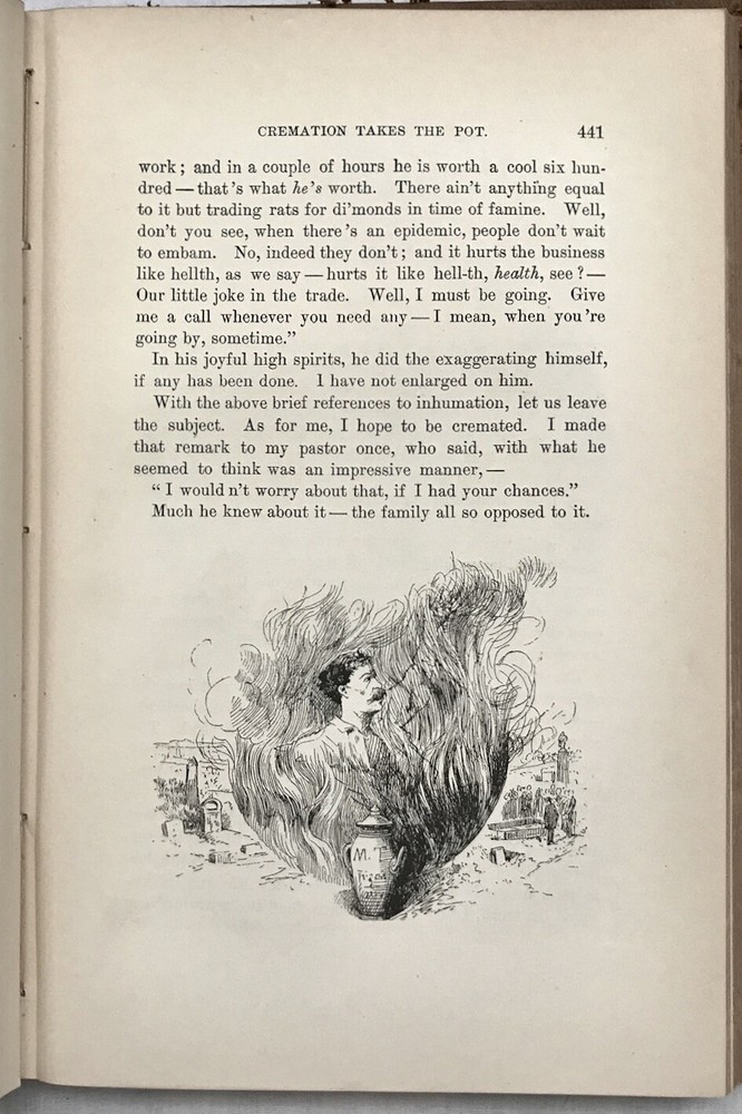 - FIRST EDITION / FIRST PRINTING - Life on the Mississippi By MARK TWAIN [First Edition / First American Edition] (probably issued a few days earlier in London) first state, with the 'St. Louis Hotel' caption and the illustration of Mark Twain 'in flames,' which was dropped in subsequent printings due to Mrs. Clemens' objections to its morbidity. Boston: James R. Osgood and Company 1883, 1st American Edition, 1st State, Leatherbound in original publisher's full speckled-calf (as offered in the publisher's prospectus). Red morocco labels to spine, lettered and ruled in gilt. 624 pages illustrated with 316 images by John Harley, Edmund Henry Garrett, and A. B. Shute. This copy is a First Edition, First State, as described by McBride and the BAL. The tail piece on p.441 depicting Twain surrounded by flames is present, while the caption on p.443 still reads "The St. Louis Hotel" and has not been corrected to "The St. Charles Hotel" as later printings. BAL 3411. McBride 84-85ff. Pseudonym of Samuel Clemens. Binding worn; hinges cracking, spine strip missing (with partial remains laid-in), one blank end-sheet missing, otherwise good condition with no owner marking, not ex-library. An excellent binder's candidate! ................................................... Shipping @ $4.90 anywhere Mainland USA; Expedited and insured shipping available, international bidders welcome. Combined shipping gladly offered for multiple purchases . International Buyers – Please Note: Import duties, taxes and charges are not included in the item price or shipping charges. These charges are the buyer’s responsibility. Please check prior to bidding/buying concerning shipping charges as well as with your country’s customs office to determine what any additional costs will be.”