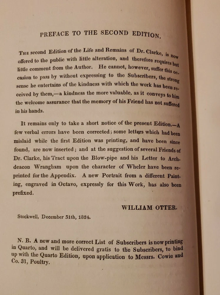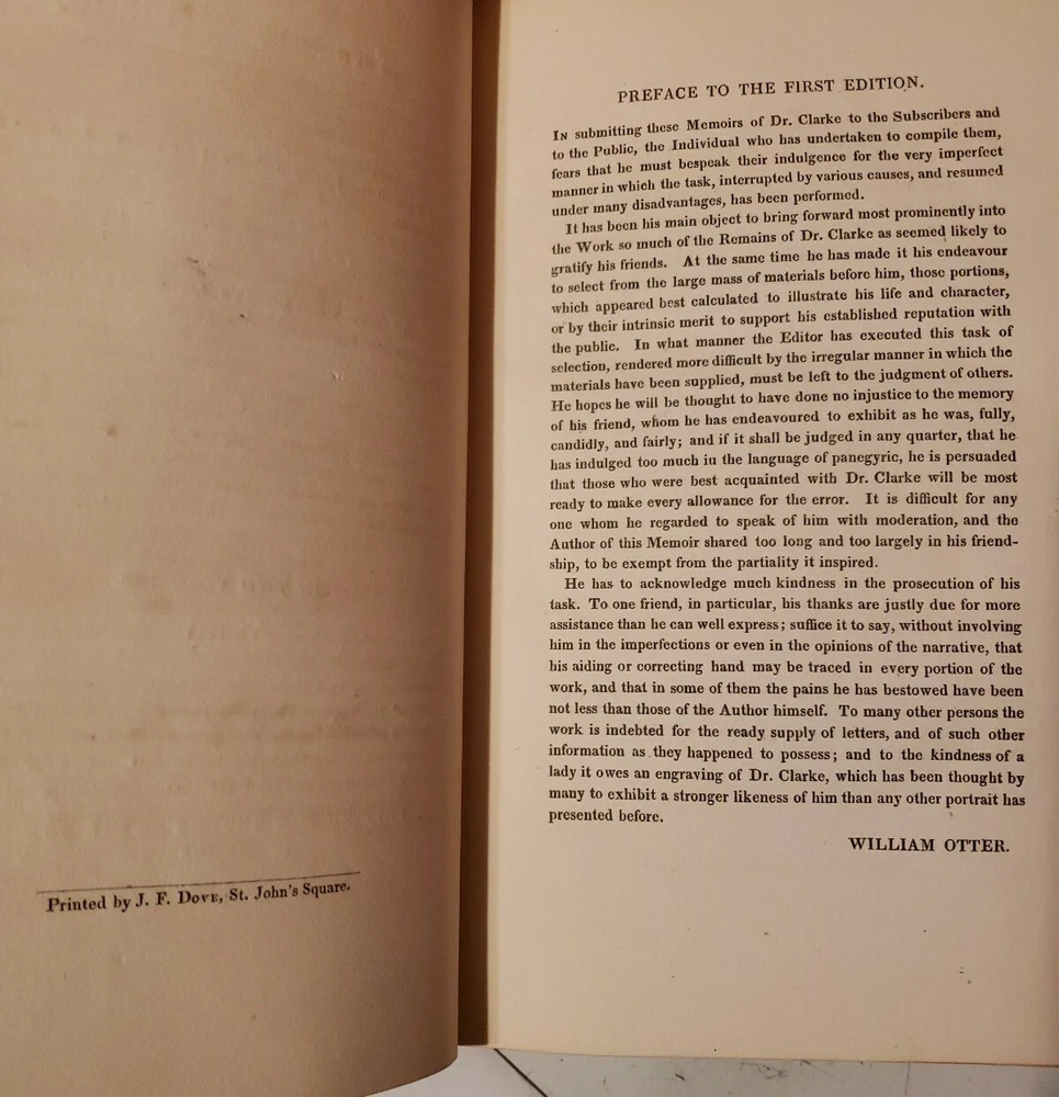 Otter's The Life & Remains Of Edward Daniel Clarke Professor of Mineralogy in the University of Cambridge Volume 1 Leatherbound Book in Good Antique Condition. All pages are intact, crisp and legible. Cover shows signs of age and wear, as to be expected from such an old book. Please see all pictures for more details. Has a Bookplate with the name James John Hornby. Beautiful Gold Gilded Textbook. Very Ornate Leather Book. Book Weight : 1 lb. 14.4 oz. Book Dimensions : 5 1/2" Long x 1 3/8" Thick x 8 3/4" Tall. Great reading/ collector's copy. Written by Reverend Willam Otter, A.M. F.L.S. Published in 1825 George Cowie & Co. In The Poultry. Printed By J.F. Dove, St. John's Square. 500 Pages. No stampings, no dog-eared pages, no writing, no highlighting, no underlining, no rips and no tears. Packaged and shipped with extreme love and care to ensure you receive book in same condition. Please feel free to contact me If you should have any questions, or if you need more pictures.