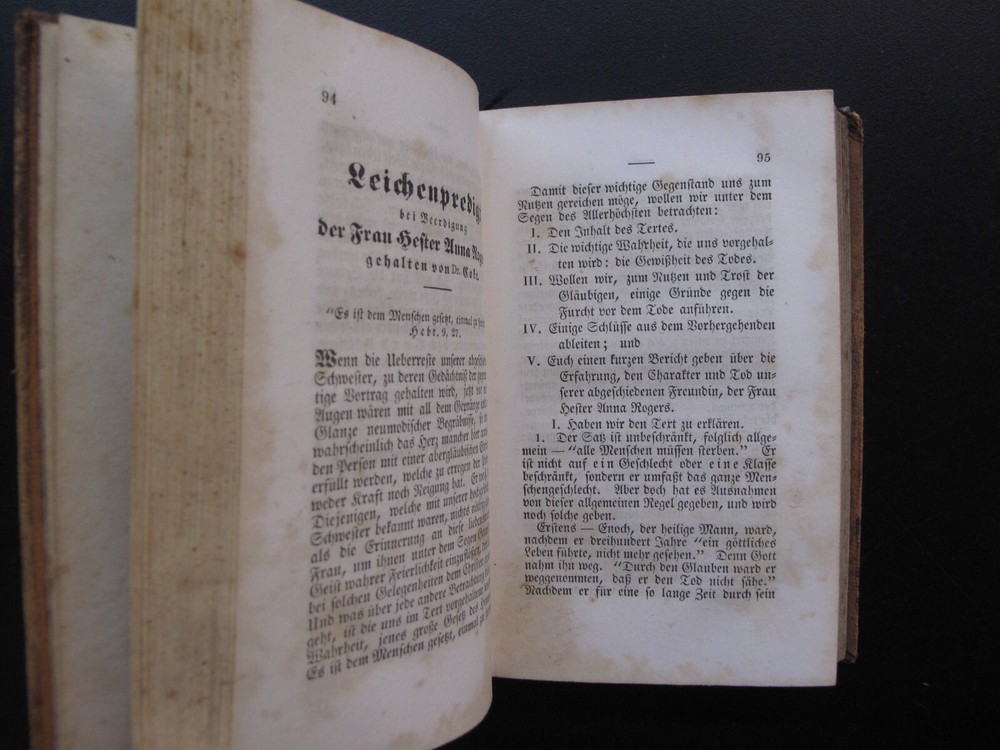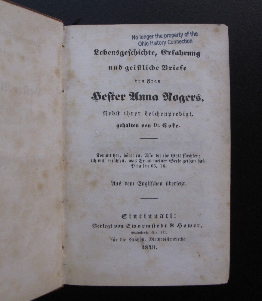 We are offering LEBENSGESCHICHTE, ERFAHRUNG UN GEISTLICHE BRIEFE VON FRAU HESTER ANNA ROGERS, NEBST IHRER LEICHENPREDIGT GEHALTEN Von Dr. Coke; Verlegt Von Swormstedt & Hower. Cincinnati, OH. 1849. This book is hard-bound in full leather with a gilt stamped black leather label on the spine. The covers show scuffing, edge-wear, and rubbing to the corners and spine-ends. There is a tear to the leather on the spine, and an old damp-stain spot at the head of the spine. The binding is solid. The contents are bright and legible, but with scattered foxing throughout, and damp-staining to the top edge of the pages. German Text. Shipping Anywhere In The United States Media Mail $6; International Shipping $25. Please Note: We are happy to accept all forms of payment. Everything we sell is Returnable for any reason. We only ask for prompt notification, within 14 days. We generally do try to "combine shipping" when you purchase more than one item--except in cases of large lots or very heavy shipments. ON INTERNATIONAL ORDERS, WE DO REFUND ON OVERCHARGES!! Don't hesitate to ask for more info/detail on any of our listings. HOFFMAN BOOKS, ABAA, IOBA