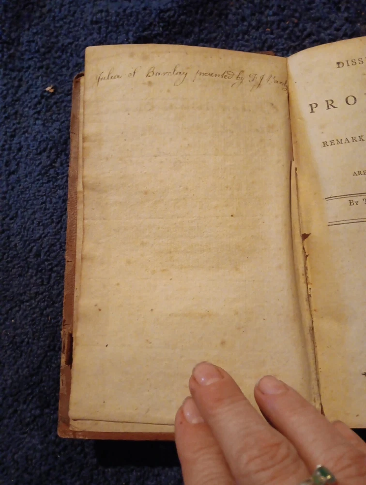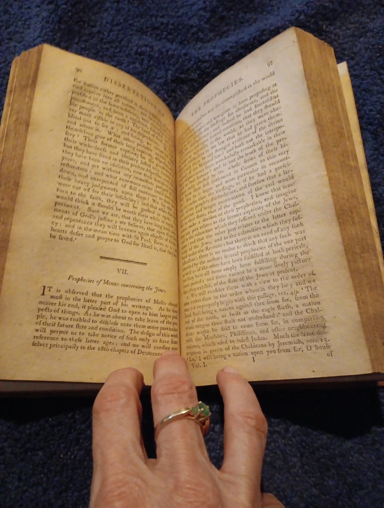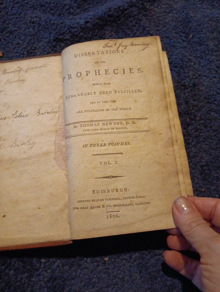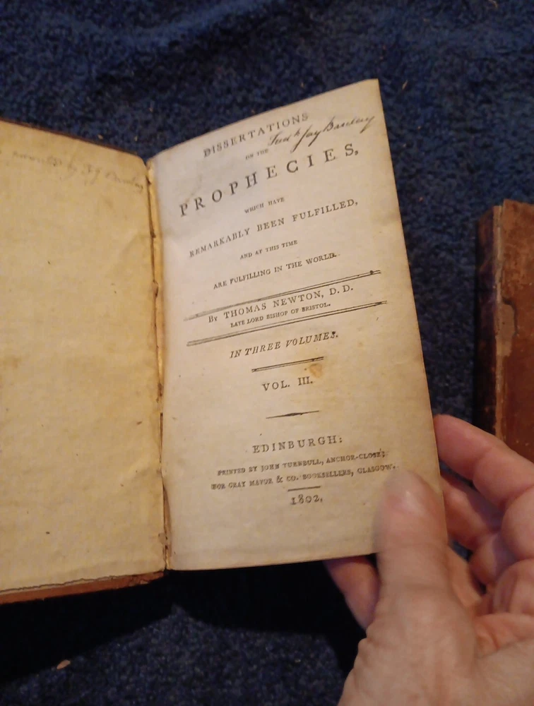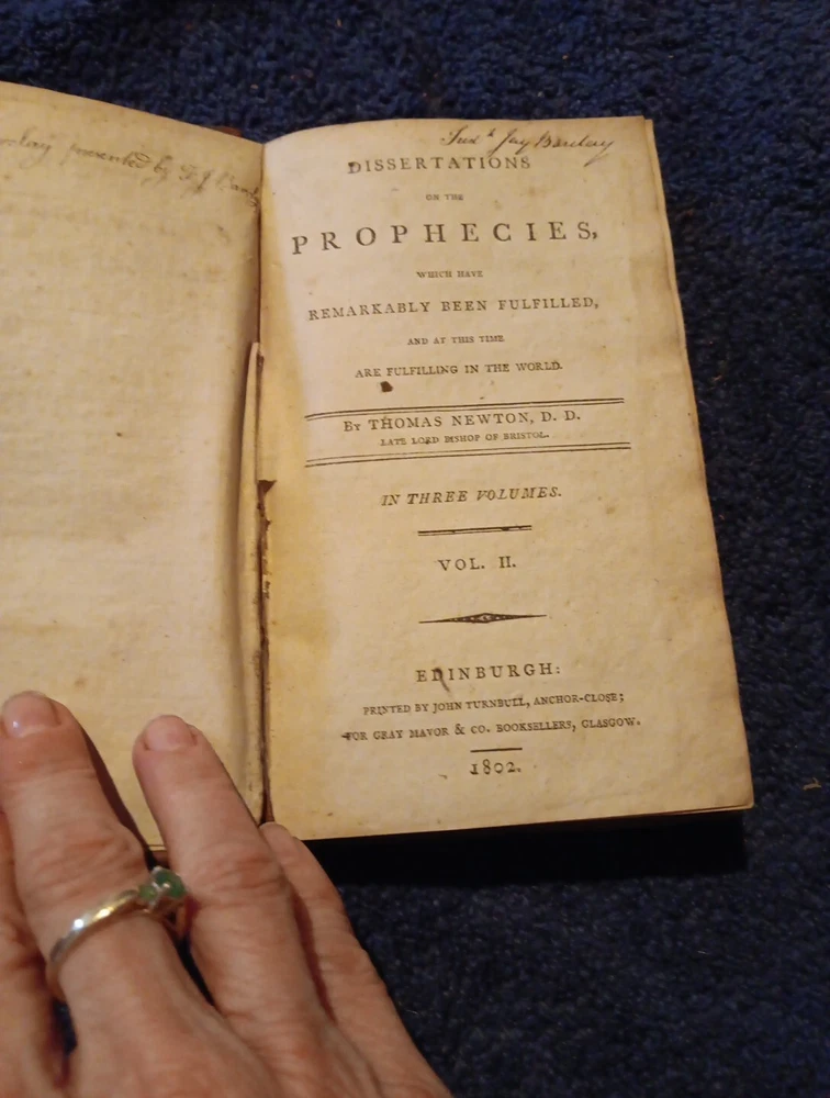 Religion Thomas Newton Dissertations on the Prophecies 1802 1st UK VG- Later UK edition with 1802 on title page and October 5, 1734 on dedication page. Publisher: Edinburgh: John Turnbull, 1802. Three volumes: Volume 1: Octavo (4.5" x 7") [xx] 1-274 [ii Blank] Full contemporary calf, brown gilt-lettered spine label. Top page edge is stained brown. Volume 1 Book Condition: Very Good- Binding is splitting. FEP has previous owners' signature on FEP. FEP has chip missing. Occasional foxing. Volume 2: Octavo (4.5" x 7") [xx] 1-274 [ii Blank] Full contemporary calf, brown gilt-lettered spine label. Top page edge is stained brown. Volume 2 Book Condition: Very Good- Binding is splitting. FEP has previous owners' signature on FEP. Occasional foxing. Volume 3: Octavo (4.5" x 7") [xx] 1-274 [ii Blank]. [xx] 1-274 [ii Blank] Full contemporary calf, brown gilt-lettered spine label. Top page edge is stained brown. Volume 3: Book Condition: Very Good- Binding is tight. FEP & title page has previous owners' signature. Occasional foxing. REP has missing chip. Spine title missing. Thomas Newton (1704-1782), English Anglican theologian, clergyman, biblical scholar, author, biographer, bishop, Dean of St Paul’s Cathedral in London. The 18th century was a wealth of knowledge, exploration and rapidly growing technology and expanding record-keeping made possible by advances in the printing press. The Age of Enlightenment profoundly enriched religious and philosophical understanding and continues to influence present-day thinking. Works collected here include masterpieces by David Hume, Immanuel Kant, and Jean-Jacques Rousseau, as well as religious sermons and moral debates on the issues of the day, such as the slave trade. The Age of Reason saw conflict between Protestantism and Catholicism transformed into one between faith and logic -- a debate that continues in the twenty-first century.