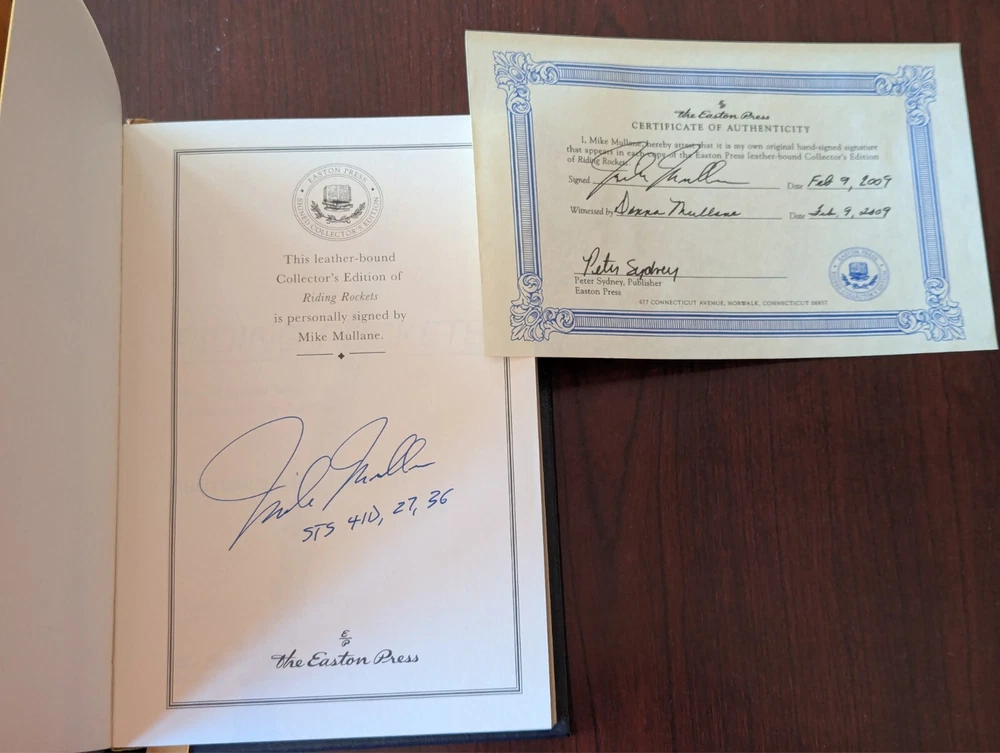 Easton Press Riding Rockets, signed edition with COA, by astronaut Mike Mullane, leatherbound collector's edition. The book is in very good condition. If you want to know what being an astronaut was like behind the scenes during NASA glory days, this is a great read on the subject.