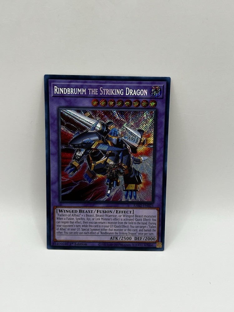 This Super Rare 1st Edition Rindbrumm the Striking Dragon is an absolute gem for collectors and duelists alike! The stunning foil finish makes the artwork pop, and its Dark attribute Fusion type adds serious power to any deck. As part of the RA02-EN025 set, it's a fantastic find for fans of Yami Yugi and Winged Beast monsters. A must-have for any Yu-Gi-Oh! enthusiast looking to elevate their collection with a rare and striking card.