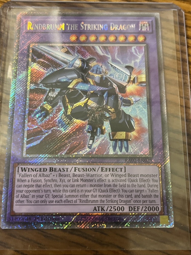 Rindbrumm the Striking Dragon (Platinum Secret Rare) RA02-EN025 25th Anniversary ships same day . Comes in a new protective sleeve and a new hard top loader .