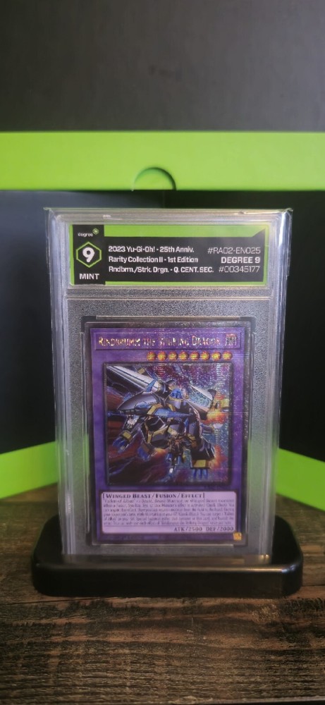 The product is a "Rindbrumm the Striking Dragon" card from the 25th Anniversary Rarity Collection II set in the Yu-Gi-Oh! TCG. It is a Quarter Century Secret Rare card with 1st Edition features. The card is of the Winged Beast Creature/Monster Type with Dark Color attribute. It has 2500 Attack/Power and 2000 Defense/Toughness, and is an Effect Fusion card with card number RA02-EN025. Thank you for checking out my YU-GI-OH Listing of my Degree - Graded Card. What you see in the picture is what you will receive. The Degree Cert. Number will confirm validity. If you have any questions please let me know. I have been an eBay user/seller for over 21 years. Trustworthy account. Shipping from Jacksonville, FL 32225