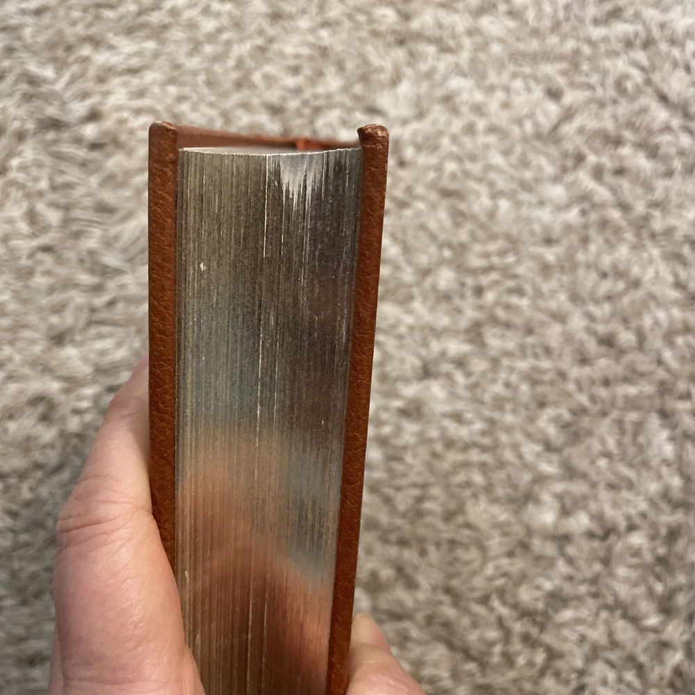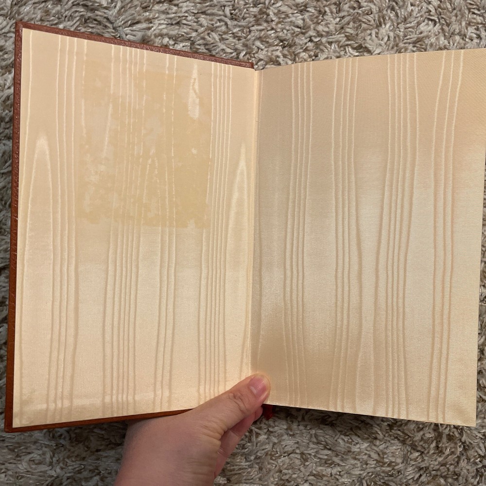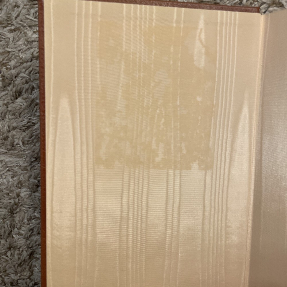 Please review each picture carefully as they are true reflection of this book’s condition. Binding is strong and tight. Pages are clean with no stains. The book’s fore-edge has a minor rubbing (please see last two pictures). The top and bottom edges are in near to perfect condition. The back of the front cover has a bookplate size discoloring because there was a bookplate on it before. The bookplate was removed. Please see pictures.