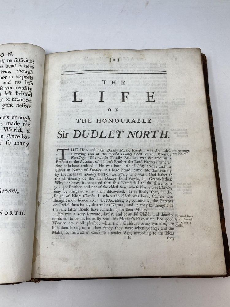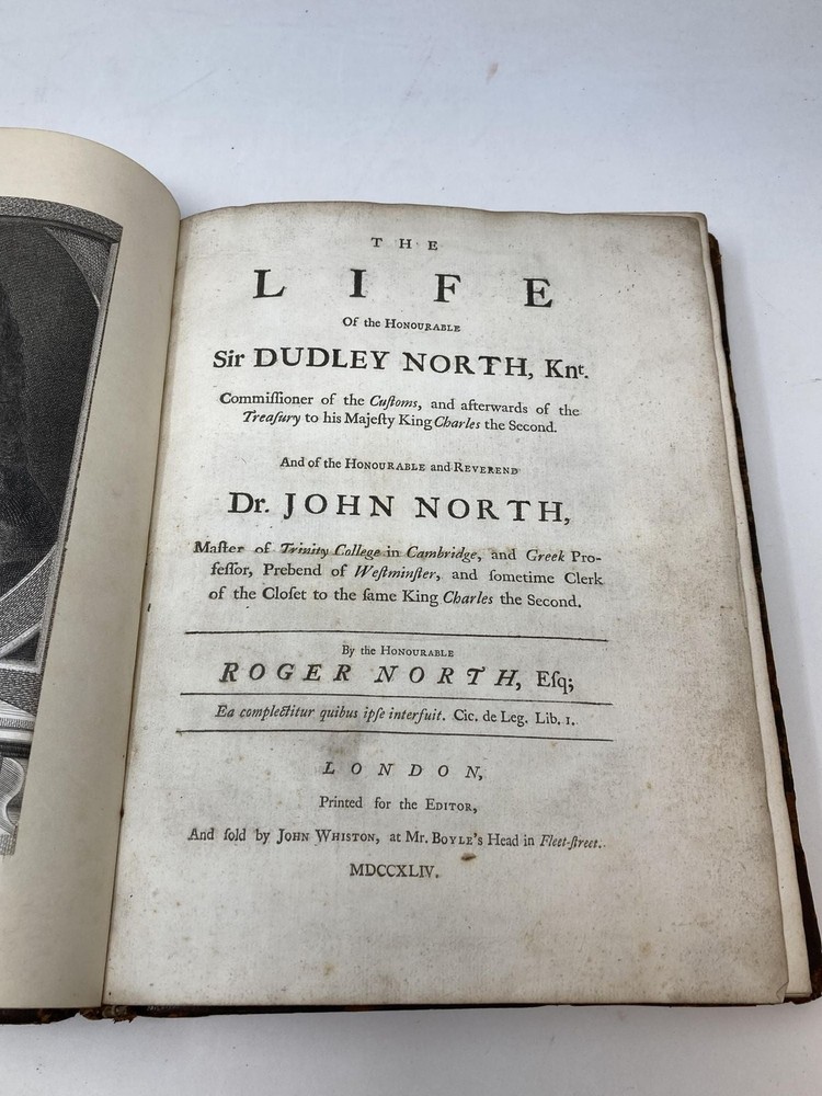 THE LIFE OF THE HONOURABLE SIR DUDLEY NORTH, KNT. COMMISSIONER OF THE CUSTOMS, AND AFTERWARDS OF THE TREASURY TO HIS MAJESTY KING CHARLES THE SECOND, AND OF THE HONOURABLE AND REVEREND DR. JOHN NORTH, MASTER OF TRINITY COLLEGE IN CAMBRIDGE, AND GREEK PROFESSOR, PREBEND OF WESTMINSTER, AND SOMETIME CLERK OF THE CLOSET TO THE SAME KING CHARLES THE SECOND Author: North, Roger Title: THE LIFE OF THE HONOURABLE SIR DUDLEY NORTH, KNT. COMMISSIONER OF THE CUSTOMS, AND AFTERWARDS OF THE TREASURY TO HIS MAJESTY KING CHARLES THE SECOND, AND OF THE HONOURABLE AND REVEREND DR. JOHN NORTH, MASTER OF TRINITY COLLEGE IN CAMBRIDGE, AND GREEK PROFESSOR, PREBEND OF WESTMINSTER, AND SOMETIME CLERK OF THE CLOSET TO THE SAME KING CHARLES THE SECOND Publication: London: Printed for the Editor, and sold by John Whiston, at Mr. Boyle's Head in Fleet-Street, 1744 Description: Leather-bound. Full contemporary leather, spine rebacked with new red leather label with title in gilt. Quarto [10x8 inches] Corners bumped, scratches to boards, wear along spine end. Textblock square, binding strong. vi,288,[7] Three portrait frontis. Text is clean and bright, nice copy, and solidly bound. Very Good. Dudley North [1641-1691] served under Charles II and then James II as Comissioner of Customs. He is known for his ideas on free trade in his "Discourses on Trade" published anonomously in 1691 and later promoted by the political economist James Mill who read the account in the above edition. Seller ID: 82794 Aardvark Rare Books Eugene, OR We work hard to make your Bookbuying Experience safe, easy and fun. Aardvark Books is a proud member of the ABAA (Antiquarian Booksellers Association of America) and IOBA, Independent Online Booksellers Association. Ezra is also an accredited and Qualified Appraiser of Books and Manuscripts, with a designation from the ASA (American Society of Appraisers), with considerable Archive experience as well. Shipping All books shipped to US destinations are sent via the US Postal Service. Faster shipping is available, please ask before paying. We will combine shipping on items purchased at the same time in order to help reduce costs. International shipping is also available. Please inquire for a shipping quote before ordering. This listing was created by Bibliopolis.