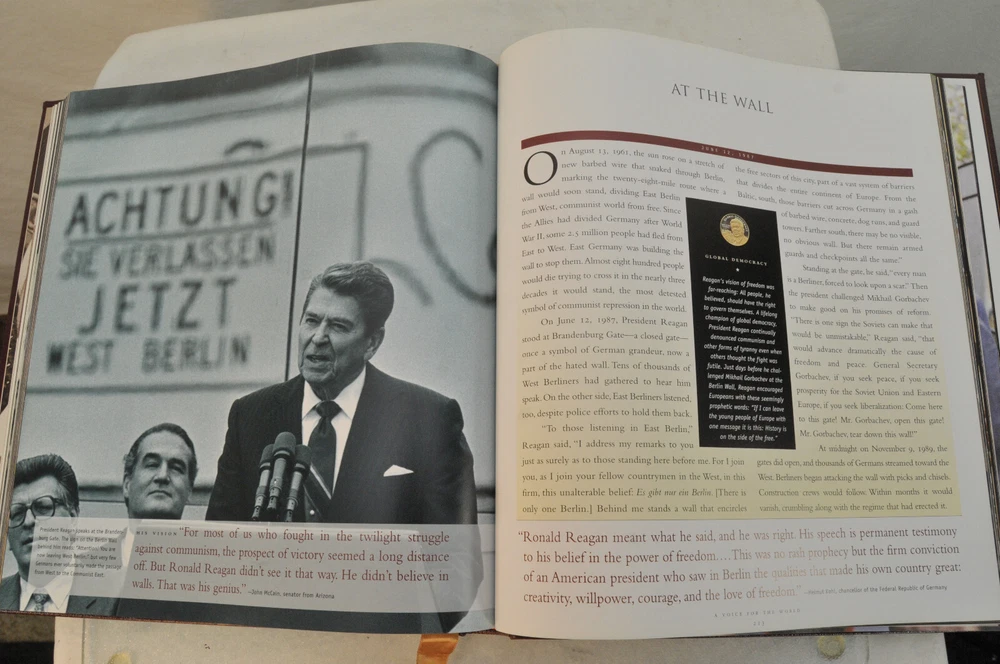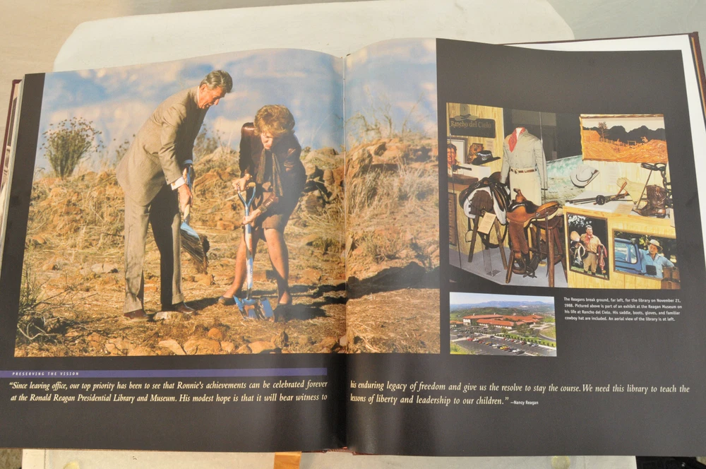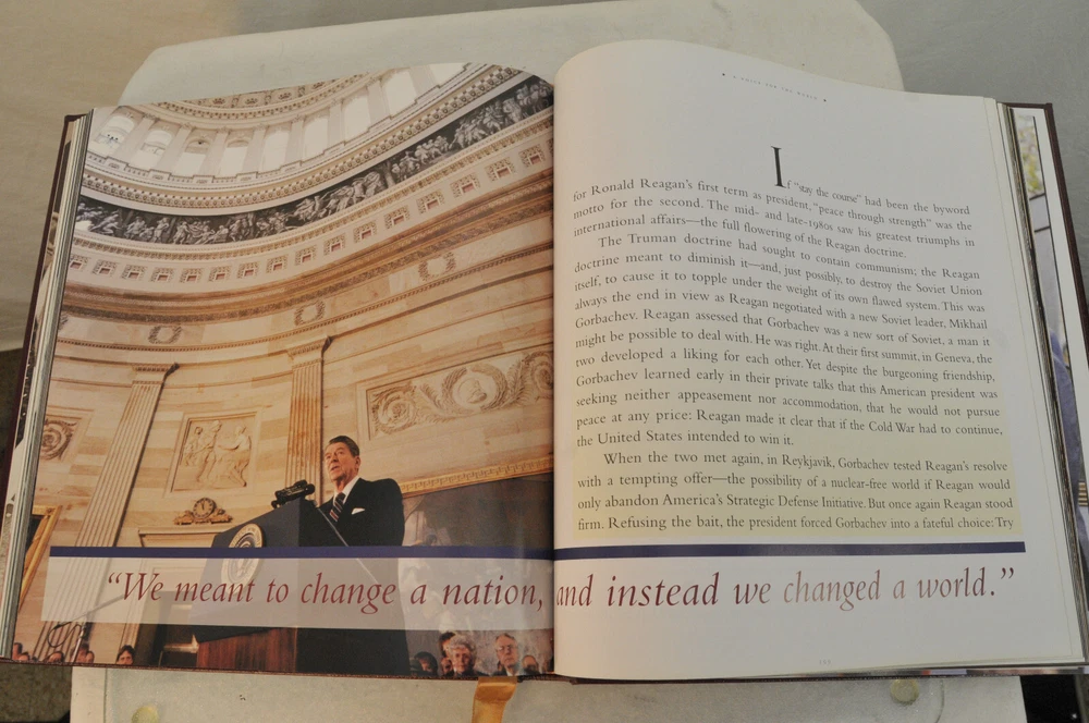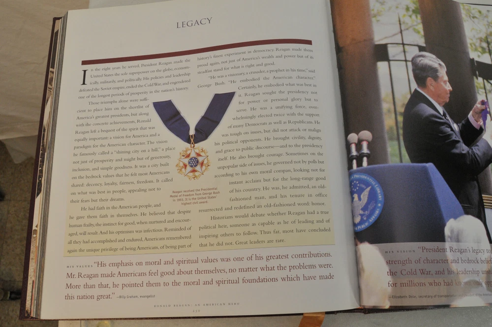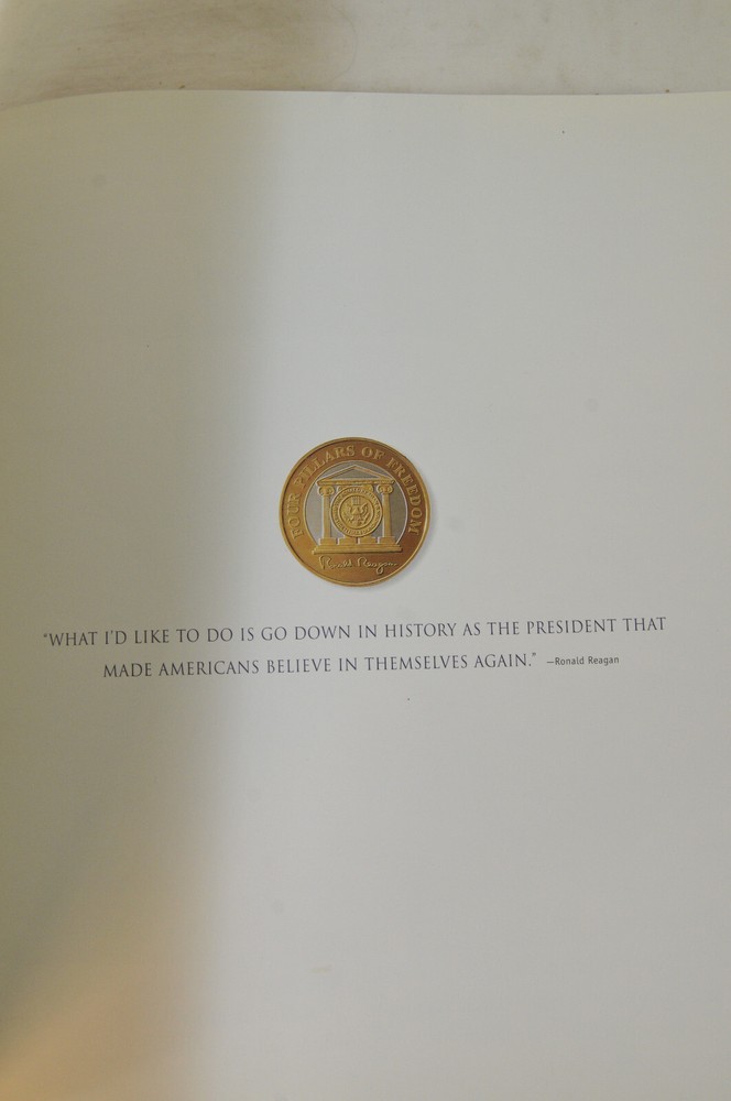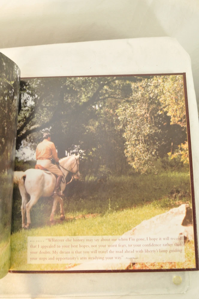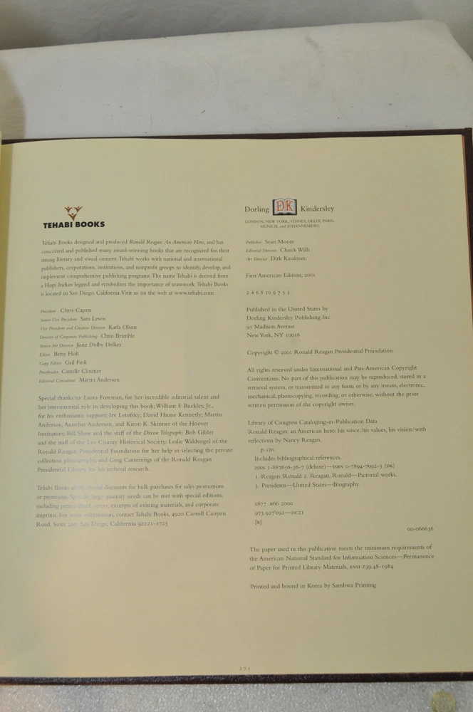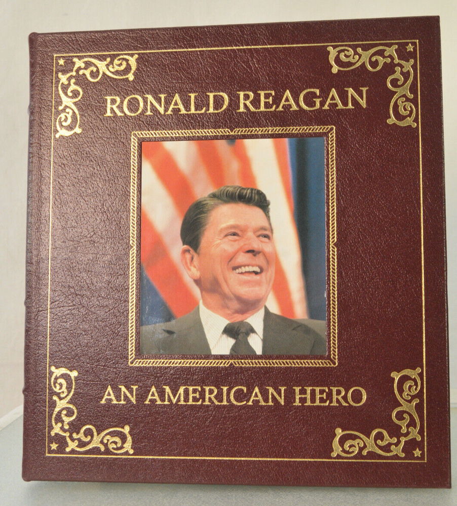 Ronald Reagan An American Hero His Voice, His Values, His VisionLeather Bound First American Edition 2001. Easton Press in Dorling Kindersley. Design by Tehabi Books. Printed in Korea. 271 pages. Over 500 photos. Genuine Full Leather cover. Real gold gilded edges and lettering. Smyth Sewn Binding. Acid Free Archival Paper. Moire end pages and silk ribbon. Retail new was $165 In the introduction William F Buckley Jr opined that the pictures are all knock-em-dead quality. This is a beautiful book befitting President Ronald Reagan the man. Excellent pre-owned condition. Ex Libris book plate has original owners name inked inside front of book. Other than the Ex Libris plate the book shows little if any signs of having been read. Please see all photos for details and condition.