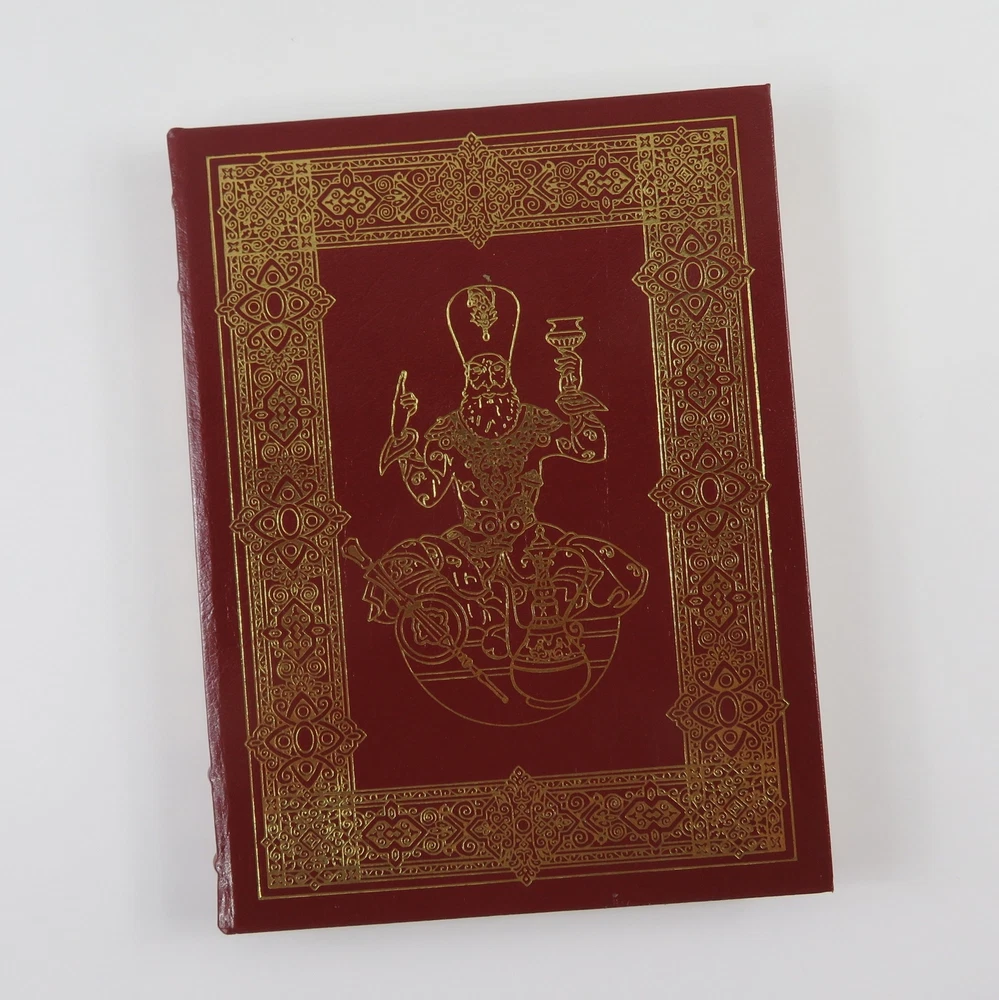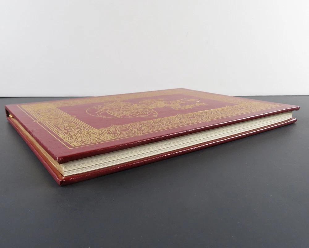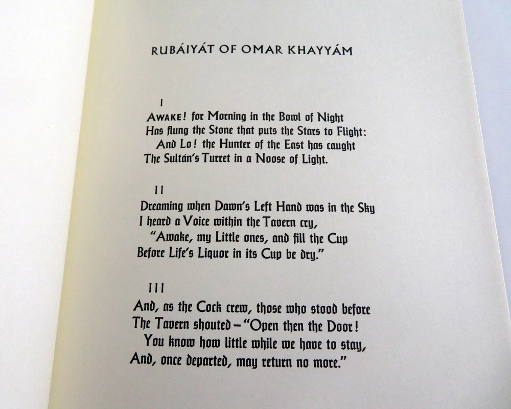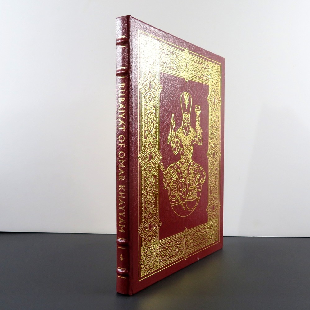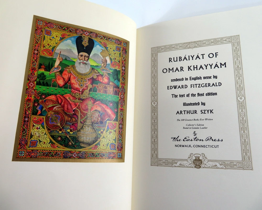 Rubaiyat of Omar Khayyam, Arthur Szyk illustrations, Easton Press full leather Title: Rubáiyát of Omar Khayyám Author: translated from the Persian by Edward Fitzgerald Published: 1976, The Easton Press, Norwalk CT Illustrated: Color and gold engravings by Arthur Szyk About: Rubáiyát of Omar Khayyám is the title that Edward FitzGerald gave to his 1859 translation from Persian to English of a selection of quatrains attributed to Omar Khayyam, dubbed "the Astronomer-Poet of Persia". Poetry verse on the philosophy of life as seen by the tentmaker and astromoner, Omar. Physical Description: Burgundy leather over boards with gilt decorative front and spine. Raised bands on spine. All edges gilt. Silk moire endpapers. Bound-in satin ribbon marker. Unmarked Easton Press bookplate inside front board. Pages: (unpaged) Dimensions (inches): 11 x 7.5 Shipping weight: 3 lbs SKU: 5996 Powered by SixBit's eCommerce Solution