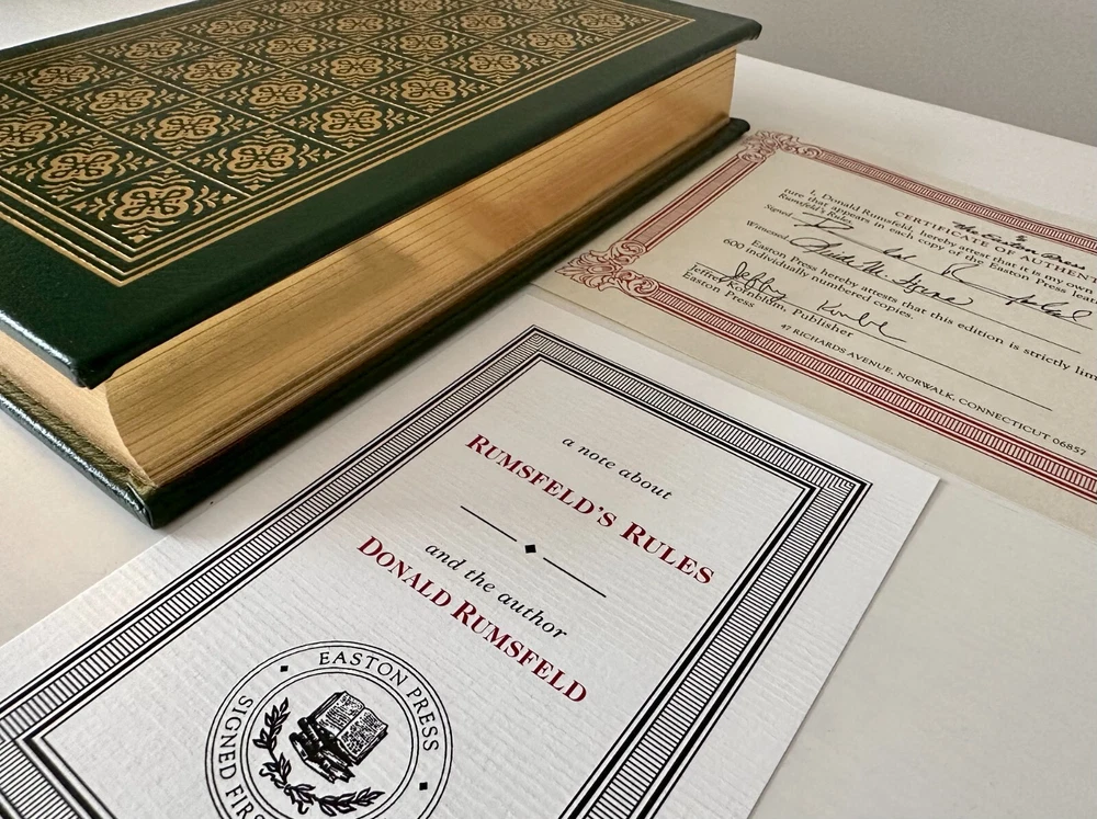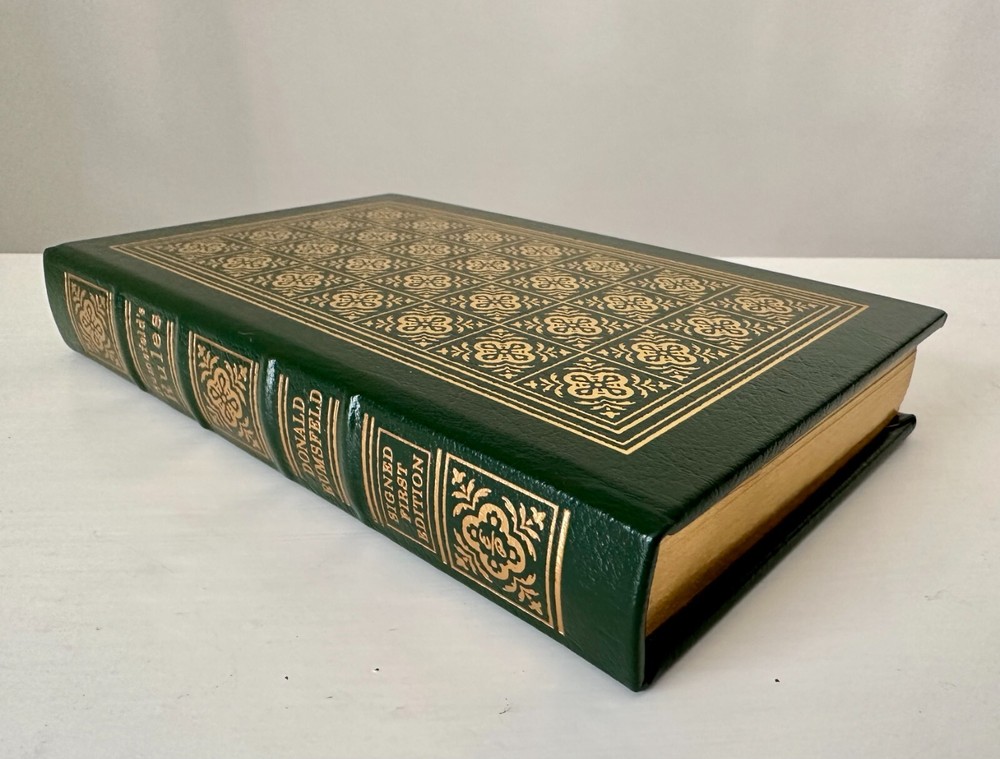 Up for sale is a beautiful new & never read copy of "Rumsfeld's Rules" by Donald Rumsfeld, published by Easton Press. This first edition, leather bound book is signed by Donald Rumsfeld with a certificate also signed by Rumsfeld. Rare and limited to 600 copies. This copy is numbered 359. Easton Press book qualities: - Leather Bound - Gold Gilded Pages - Satin Bookmark Masterfully made. Would serve as a beautiful gift and/or present well on any book shelf! Will ship with USPS Media Mail. I will cover shipping costs!