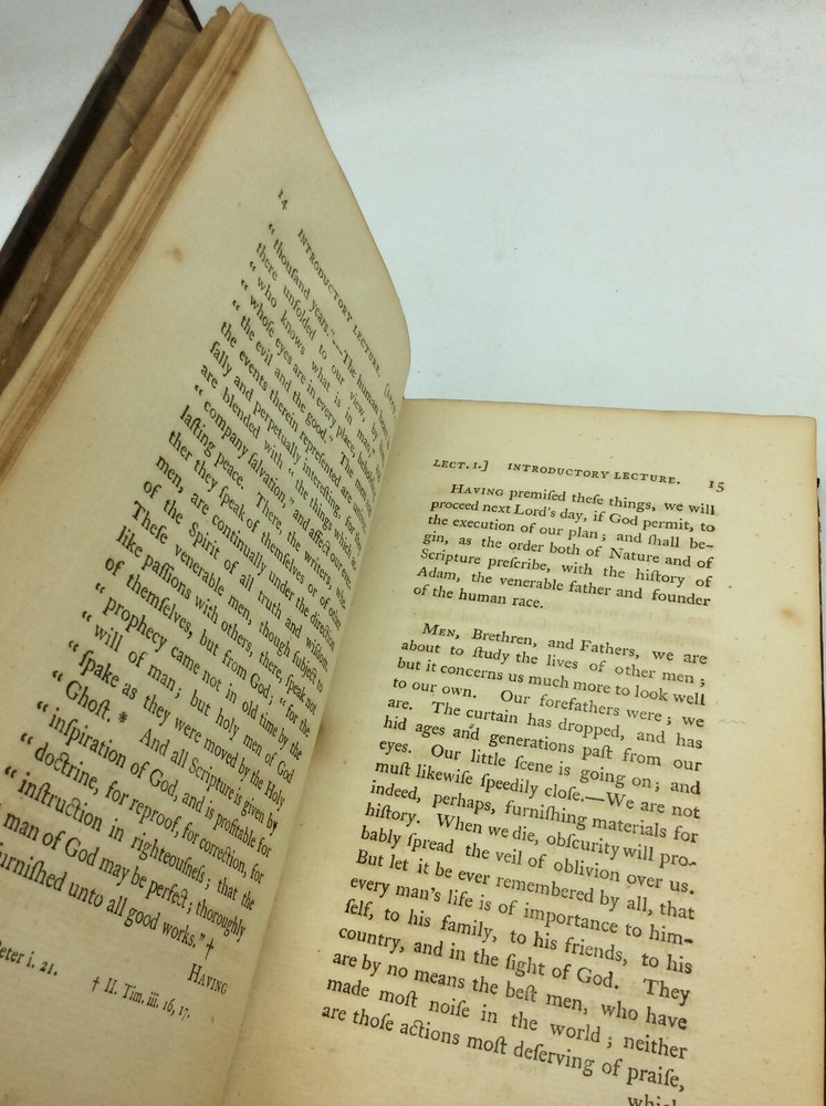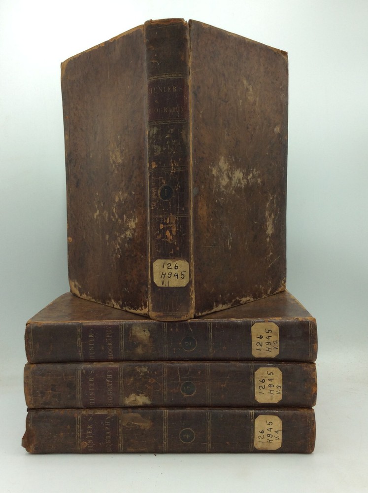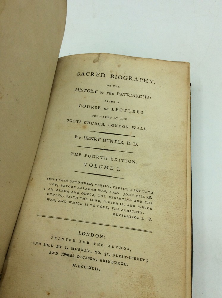 SACRED BIOGRAPHY Or the History of the Patriarchs: Being a Course of Lectures Delivered at the Scots Church, London Wall. Volumes 1-4 by Henry Hunter London: J. Murray, 1792. Fourth Edition. Leather_bound. 420p., 464p., 494p., 481p. A set of four ex-library books in tree-calf binding. Labels on spines. Spines and corners rubbed and a bit scuffed; edges darkened and crackling especially on volumes 1 and 4. Card pockets and old ink notes on endpapers; books also contain the bookplates and stamps of the Chicago Theological Seminary. Pages are age-toned with a bit of foxing but otherwise clean; bindings are tight. Item #212337