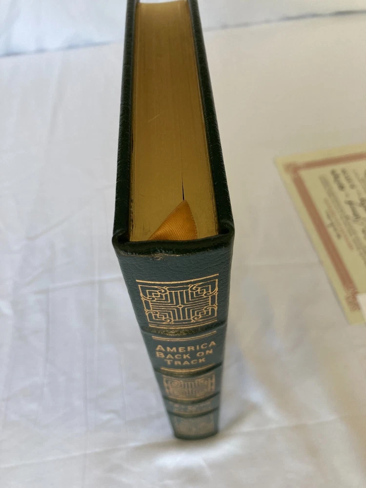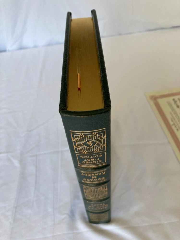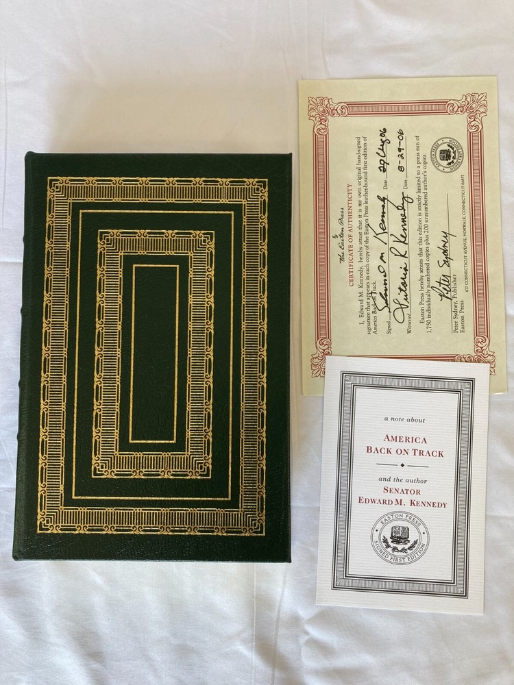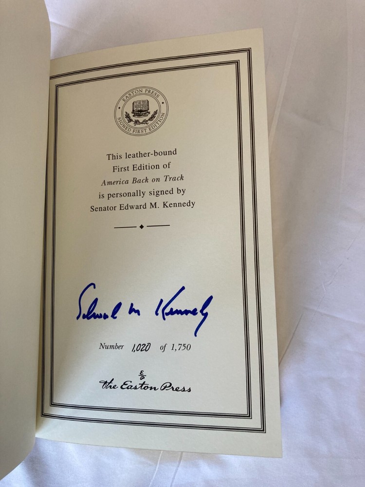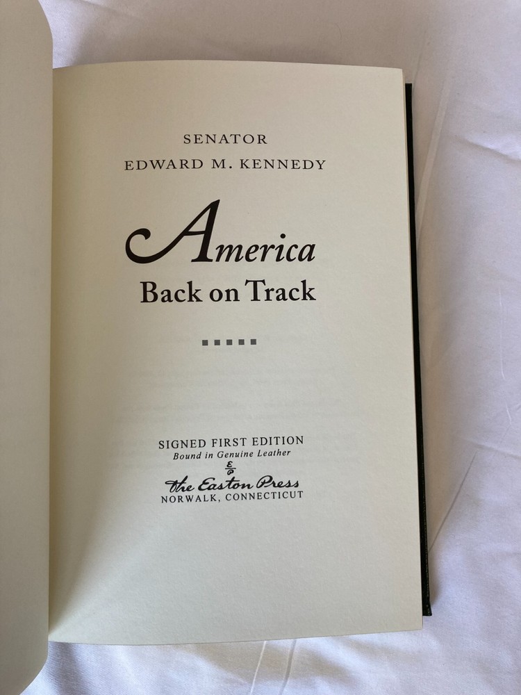 WRITIER/ARTIST : Edward M. Kennedy (Boston, Massachusettes, Hyannis Port, 1932-2009) TITLE : America Back on Track, Easton Press, 2006 PUBLISHER : Easton Press DESCRIPTION : For sale is a leather-bound, signed limited edition book by former United States Senator Edward M. Kennedy's America Back on Track published by Easton Press in 2006. The book is signed by Kennedy on the book's colophon. This edition was limited to only 1,750 signed copies. This is copy number 1,020. CONDITION : The book is in near fine condition with minor rubbing to the board edges, see photos. The spine and boards are tight and straight. There are no internal markings other than Kennedy's signature. There is no previous owner's bookplate or markings. The page-edge gilt is in very good condition with minor scratching to the top and bottom page edge guilt, see photos. Let me know if you have any questions. Don't forget to take a look at my other signed, limited edition books and prints for sale. Thank you